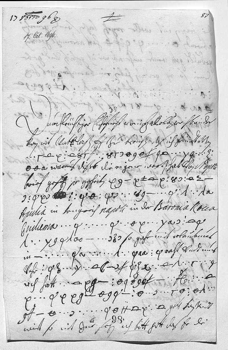 000117 octobris 960002Durchleüchtiger Cuhrfürst, mein herz allerlibster herr bruder 0003Kan nit vnterlaßen, dero Liebden zu berichten, das ich heündt von 0004ihr Durchlaucht mama brif beko0005mmen, waraus dißes die eigene wort (hab von Napoli 0006brief gesehn, so geschriben das der Doctor ies0007t undt 1? von Monte Casino gegen0008Apulia in Konigreich Napoli in der Baronia Rocca 0009Guiliema in einem difen turn 0010gefangen sitzt, so gahr, mit erlaubnus, 0011in seinen eigenen unraht, vndt mus 0012vohr unzifer und stank vergehen. 0013Ach, hatt er das um papa seligen uer 0014dind, das man so mit ihm umge0015als mit ein mörder, gott kan vndt 0016wirt so nit zue sehen. Ich bitt gott, das er die