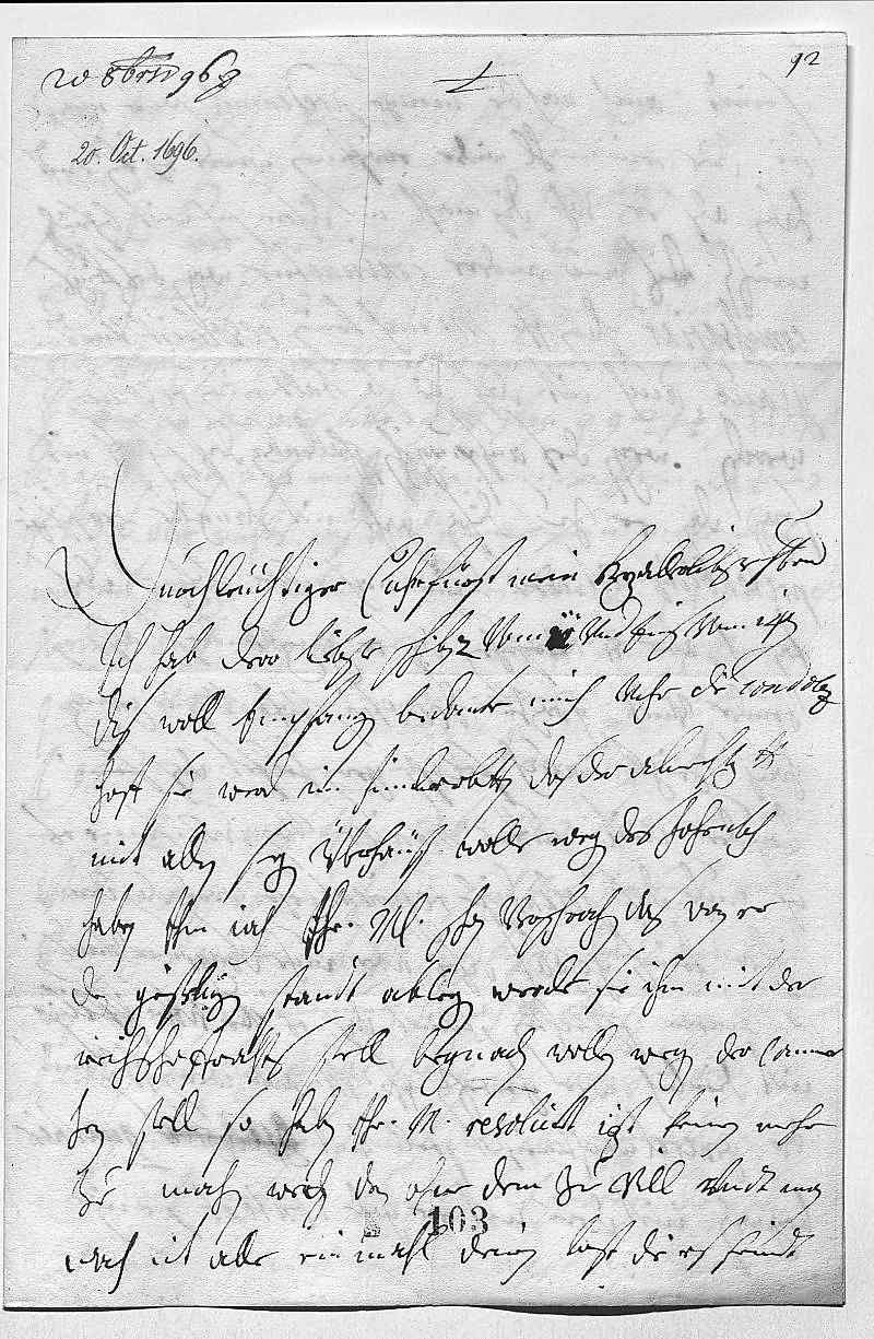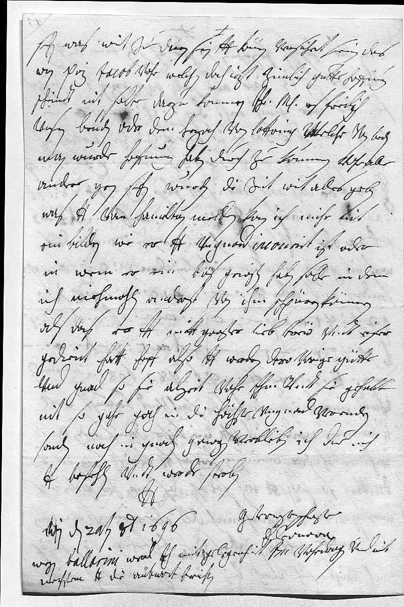 0052man sehen, was wirt zue duen sein. Dero Liebden können versichert sein, das 0053wan Prinz Iacob, vohr welchen doch iezt zimlich gutte hoffnung 0054scheindt, nit solte darzu kommen, ihr Mayestät es freilich 0055vnsern brudern oder dem Herzoch von Lottring, welcher von beden 0056man wurde hoffnung haben durch zu kommen, vohr alle 0057andere gern sehen wurden, die zeit wirt alles geben. 0058Was dero Liebden vom Hamilton melden, kan ich mihr nit 0059ein bilden, wie er dero Liebden vngnad incourirt ist, oder 0060in wem er ein bös gewißen haben solle, in dem 0061ich niehmahlen anderst von ihm schpüren können, 0062als das er dero Liebden mitt großer lieb, trew vndt eifer 0063gedient hatt. Hoff also, dero Liebden werden dero vorige gütte 0064vnd gnad, so sie alzeit vohr ihm vndt sie gehabt, 0065nit so gahr gah in die höchste vngnad verendern, 0066sondern noch in gnad gewogen verbleiben. Ich due mich 0067dero Liebden befehlen vndt werde sterben 0068dero Liebden 0069getrewste schwester 0070Eleonora 0071Wien den 20ten octobris 1696 0072Wegen Ballarini werd ich mit gelegenheit ihr Mayestät vohrdragen vnd mit 0073nechstem dero Liebden die antwort berichten.
