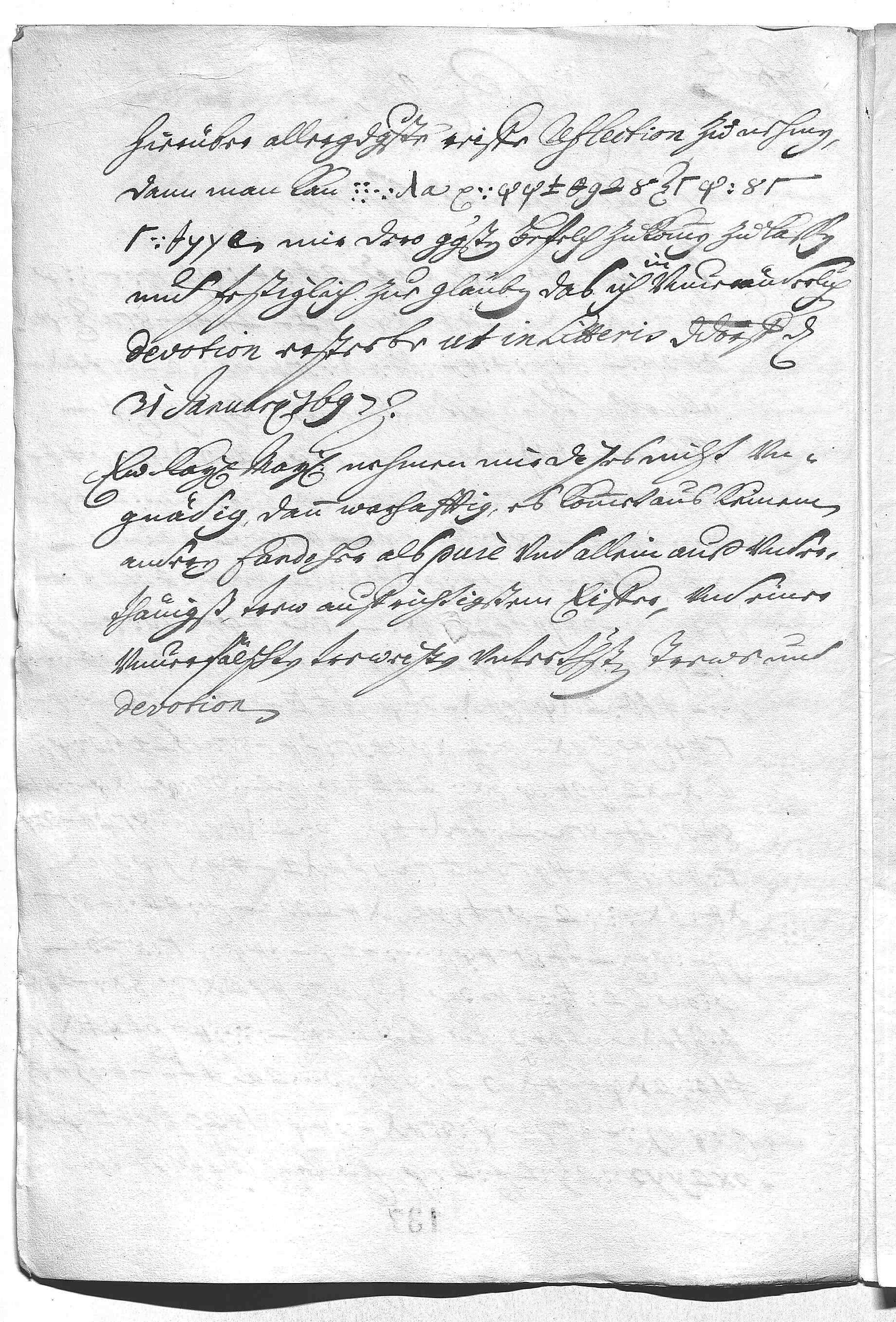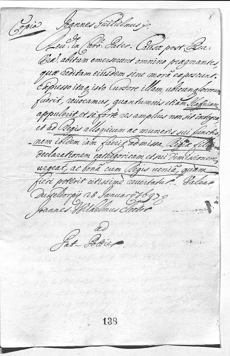 Dankt für EMTs Neujahrswunsch und die Versicherung ihrer anhaltenden Gnade. – Hat für den guten Ausgang des Konflikts mit Hessen(-Kassel) nach Gott am meisten dem Kaiser zu danken. – Dankt für EMTs Protektion wegen seiner ausstehenden Subsidien, Kommis- und Fouragezahlungen; insbesondere die Subsidien eilen. – Sendet beiliegend, was er in der dänischen Heiratssache an den P. (Karl von Pottier) geschrieben hat. Entschuldigt sich, dass er den Brief an den dänischen König aus Eile nicht chiffriert hat. – Wiederholt seine Bitten um rasche Entsendung eines kaiserlichen Vertreters für den Ehevertrag der Schwägerin und um das (böhmische) Indigenat für Prinz Gian Gastone von Toskana. – Da Schwester Maria Sophie (Königin von Portugal) die portugiesische Heirat nicht mehr wünscht, sendet JW das Portrait zurück. – Dankt für EMTs Antwort an die spanische Königin (Schwester Maria Anna) wegen des Doktors (Schweizer) ; kann am Stil des Briefs der Schwester erkennen, dass sie vom Bischof von Augsburg (Bruder Alexander Sigismund) falsch über die „liederliche“ Angelegenheit informiert wurde. – Findet den Vorschlag der Gräfin Berlepsch wegen Verheiratung König Josephs I. impertinent und nicht praktikabel. Denkt aber, dass man zunächst noch dissimulieren sollte, bis die spanische Thronfolge entweder für diesen oder Erzherzog Karl gesichert ist. Ob König Joseph dann im Reich residieren oder eine der Kronen an seinen Bruder abgeben würde, kann vorerst offen bleiben. Schlägt vor, doch über eine Ehe Josephs mit der Mademoiselle (Élisabeth Charlotte d’Orléans ) nachzudenken, da dies sowohl die spanische Thronfolge als auch einen ehrenvollen Frieden für das Reich sichern könnte. Auch käme dadurch das arbitrium pacis et belli wieder in die Hand des Kaisers, anstatt von den unkatholischen Mächten England und Holland usurpiert zu werden. Zwar kann die Mademoiselle keine perfekte Schönheit genannt werden, sie ist aber doch mehr schön als hässlich, und große Herren müssen der Christenheit, dem Publikum und ihren Untertanen manchmal ein Opfer bringen.