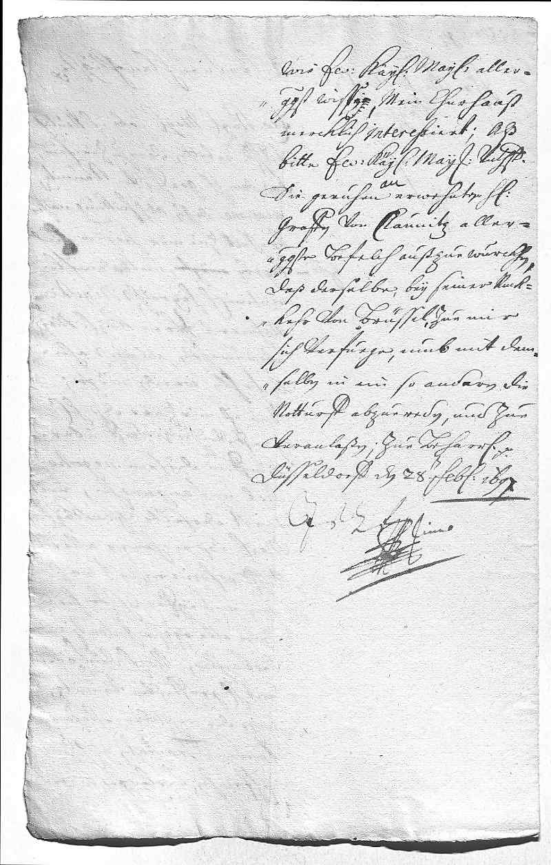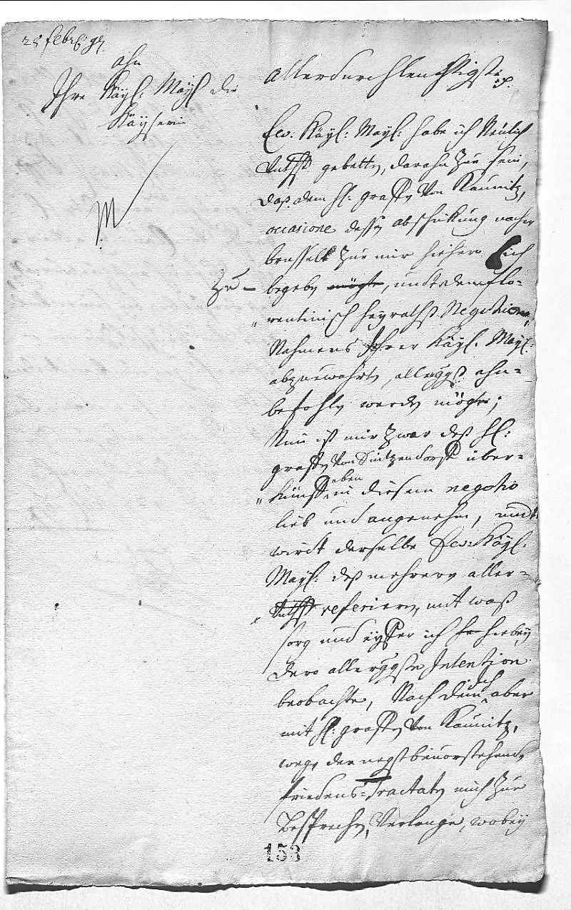 Dass nun Graf Sinzendorf als kaiserlicher Vertreter für die Verhandlung (des Ehevertrags zwischen Pfalzgräfin Maria Anna Franziska und Prinz Gian Gastone von Toskana) gekommen ist, ist JW recht. Da er jedoch mit Graf Kaunitz auch über die Friedensverhandlungen sprechen möchte, bittet er, dass dieser auf der Rückreise von Brüssel zu ihm kommt.