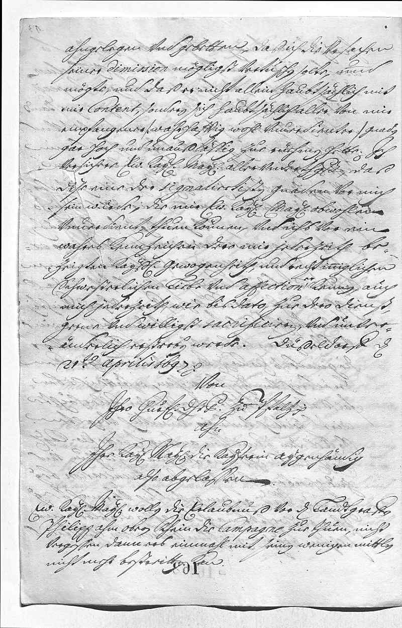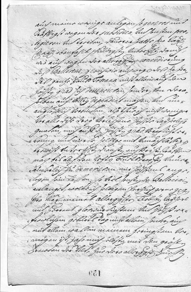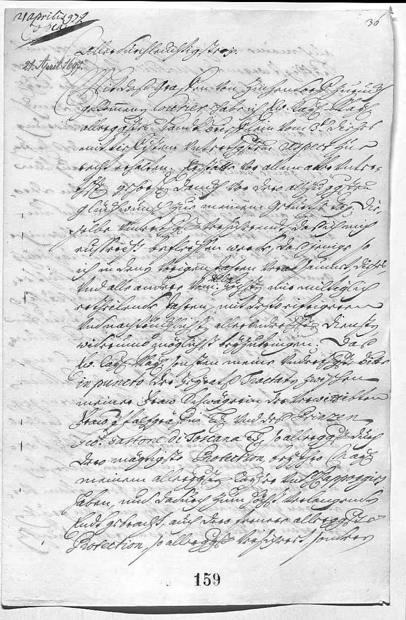 Dankt für EMTs Geburtstagsgratulation. – Dankt für den Abschluss der Heiratsverträge für seine Schwägerin, die verwitweten Pfalzgräfin, und den Prinzen Gian Gastone von Toskana; ebenso für die Protektion bezüglich seiner Subsidien und für die Überlassung Ballerinis. Allerdings wird die Hochzeit nicht vor Anfang Juni einzurichten sein und der Geburtstag des Kaisers ist schon am 9. Juni; wenn es nicht anders geht, wird JW aber sein Fest gerne opfern.