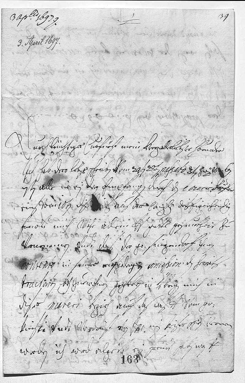 0102wirt sein. Ich wüntsche dero Liebden glükhlige feirdag 0103vndt alles, was sie selber verlangen, vndt 0104werde sterben 0105dero Liebden 0106getrewste schwester 0107Eleonora 0108Wien den 3 aprill 16970109Wüntsch dero Liebden auch vill glükh zu dero geburz 0110dag, das sie noch vill in aller gesuntheit 0111erleben mögen. In der polnischen sach wirt nichts 0112vnterlaßen werden, dan es ihr Mayestät, meines Keisers, 0113eigene couenienz, wan der Prinz Jacob nit wurd 0114können dazue kommen, wozu die hoffnung noch 0115nit gehr verlohren, das gleich woll einer von dero 0116creaturn size. Dem Ballarini haben ihr Mayestät gern 0117erlaubt, hoffen aber, gegen dero geburz dag werd er 0118wider konnen hier sein. An disen brif hab 14 0119dag geschriben, so gahr hatt eins kein zeit izt wegen der 0120kirch fonction.