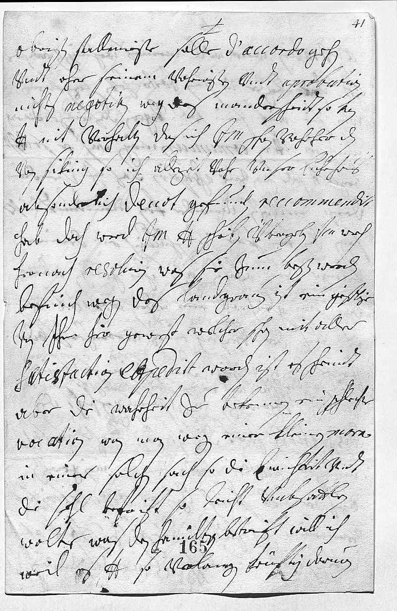 0068Obristen Stallmeister, solle d'accordo gehen 0069vndt ohne seinem vohrwißen vndt aprobation 0070nichts negotiren. Wegen des Manderscheidt, so kan 0071dero Liebden nit verhalten, das ich ihr Mayestät schon vohrher den 0072von Siking, so ich allezeit vohr vnser cuhrhaus 0073absonderlich deuot gefunden, reccommendirt 0074hab, doch werd ihr Mayestät dero Liebden schreiben übergeben, ihr Mayestät werden 0075hernach resoluirn, was sie zum besten werden 0076befinden. Wegen des Landgrauen ist ein geistliger 0077von ihm hier gewest, welcher schon mit aller 0078satisfaction expedirt worden ist. Es scheindt 0079aber, die wahrheit zu bekennen, ein schlechte 0080vocation, wan man wegen einer kleinen mora 0081in einer solchen sach, so die ewichkeit vndt 0082die sehl betrift, so leicht vmbsattlen 0083wolte. Was den Hamilton betrift, will ich, 0084weil es dero Liebden so verlangen, könftig daruon