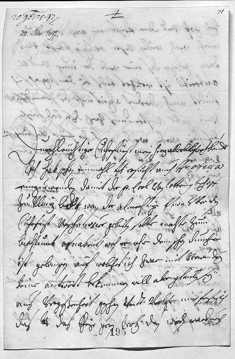 0029bestendichkeit in gutten vohrnemmen, die ich leben 0030vndt sterben werde 0031dero Liebden 0032Wien den 20 novembris 1697 0033getrewste schwester 0034Eleonora 0035Bitt mich bey meiner fraw schwagrin zu entschuldigen, das 0036heündt nicht schreib, ist die zeit zu curz, wirt mit 0037nechstem ersezt werden.