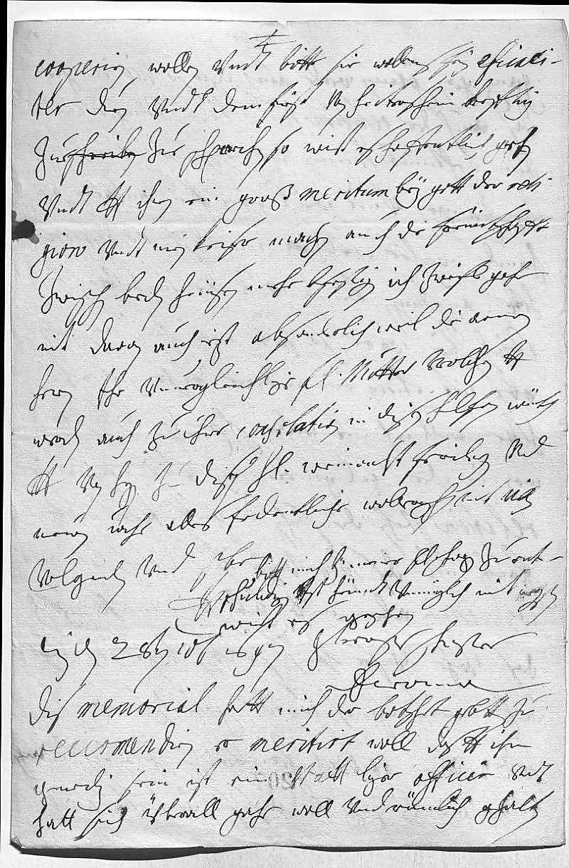 0087cooperiren wollen vndt bitte, sie wollens fein eficaci- 0088ter duen vndt dem Fürst von Heitersheim krefftig 0089zue schreiben zue schprechen, so wirt es hoffentlich gehen 0090vndt dero Liebden ihnen ein groß meritum bey gott, der reli- 0091gion vndt mein Keiser machen, auch die freüntschafft 0092zwischen beden heüsern mehr befestigen. Ich zweifl gahr 0093nit daran, auch iezt absonderlich, weil die armen 0094hern ihr vnuergleichlige fraw mutter verlohren, dero Liebden 0095werden auch zu ihrer consolation in disen helfen. Wüntsch 0096dero Liebden von herzen zu disen heiligen weinacht feirdagen vnd 0097newen iahr alles erdenkliche wollergehn mit villen 0098volgenden vnd sterbe 0099Bitt mich bey meiner fraw schwegrin zu ent- 0100schuldigen, ist heündt vnmöglich, mit negsten 0101wirt es geschen. 0102dero Liebden 0103getrewste schwester 0104Eleonora 0105Wien den 28ten decembris 1697 0106Dis memorial hatt mich der Botschet gebetten zu 0107reccomendiren, er meritirt woll, das dero Liebden ihm 0108genedig sein, ist ein stattliger officir vndt 0109hatt sich überall gahr woll vnd rümlich gehalten.