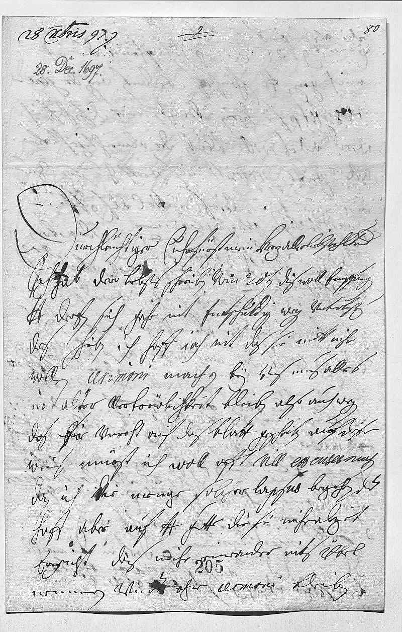 000128 decembris 970002Durchleüchtiger Cuhrfürst, mein herzallerliebster herr bruder 0003Ich hab dero liebsts schreiben vom 20ten dis woll empfangen. 0004Dero Liebden derfen sich gahr nit enschuldigen wegen vnterlaßung0005des schreiben, ich hoff iah nit, das sie mitt mihr 0006wollen cerimoni machen. Bey vns mus alles 0007in alter vertrewlichkeit bleiben, also auch wegen 0008das sie vnrecht auf das blatt geschriben, auf dise 0009weis müest ich woll offt vill excuses machen, 0010dan ich die menge solcher lapsus begehen due, 0011hoff aber auf dero Liebden gutte, die sie mihr alzeit 0012erzeicht, das mihr einander niks übel 0013nemmen vndt ohne cermoni bleiben.