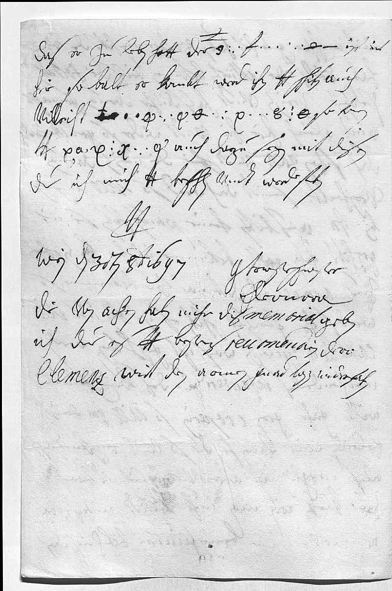 0078das er zu leben hatt. Der Teliers ist nit 0079hir, so balt er kombt, werd ihn dero Liebden schiken, auch 0080villeicht einen medicum, so konnen 0081dero Liebden den Duven auch dazu sezen. Mit disen 0082due ich mich dero Liebden befehlen vndt werde sterben 0083dero Liebden 0084getrewste schwester 0085Eleonora 0086Wien den 30ten octobris 1697 0087Die von Achen haben mihr dis memorial geben, 0088ich due es dero Liebden bestens reccomendiren, dero 0089clemenz wirt den armen gnad laßen widerfahren.
