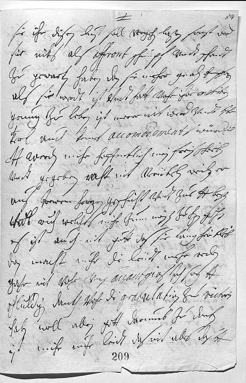 0028sie ihr disen lust soll vergehn laßen, sonst werd 0029sie niks als affront, schimpf vndt schandt 0030zu gewarten haben, dan sie mehrer gnaden empfangen, 0031als sie werdt ist, vndt hatt vohr ihre meriten 0032genug zu leben, ist merer nit werd vndt ihr 0033kerl auch keines accomodements würdig. 0034Dero Liebden werden mihr hoffentlich mein freis schreiben 0035vndt gegebenen raht nit verübeln, weiln er 0036aus trewem herzen geschicht vndt zue dero Liebden besten 0037vndt auch, welchs mihr zum meisten zu herzen geht, 0038es ist auch nit gutt, das sie lang hier bleib, 0039dan sie macht nuhr die leüdt mehr reden, 0040gahr nit vohr vns auantagios. Ich sag dero Liebden 0041schuldigen dankh vohr die gratulation zue victori, 0042haben woll allein gott darumb zu danken. 0043Ist mihr nuhr leidt, das nit alles das dero Liebden