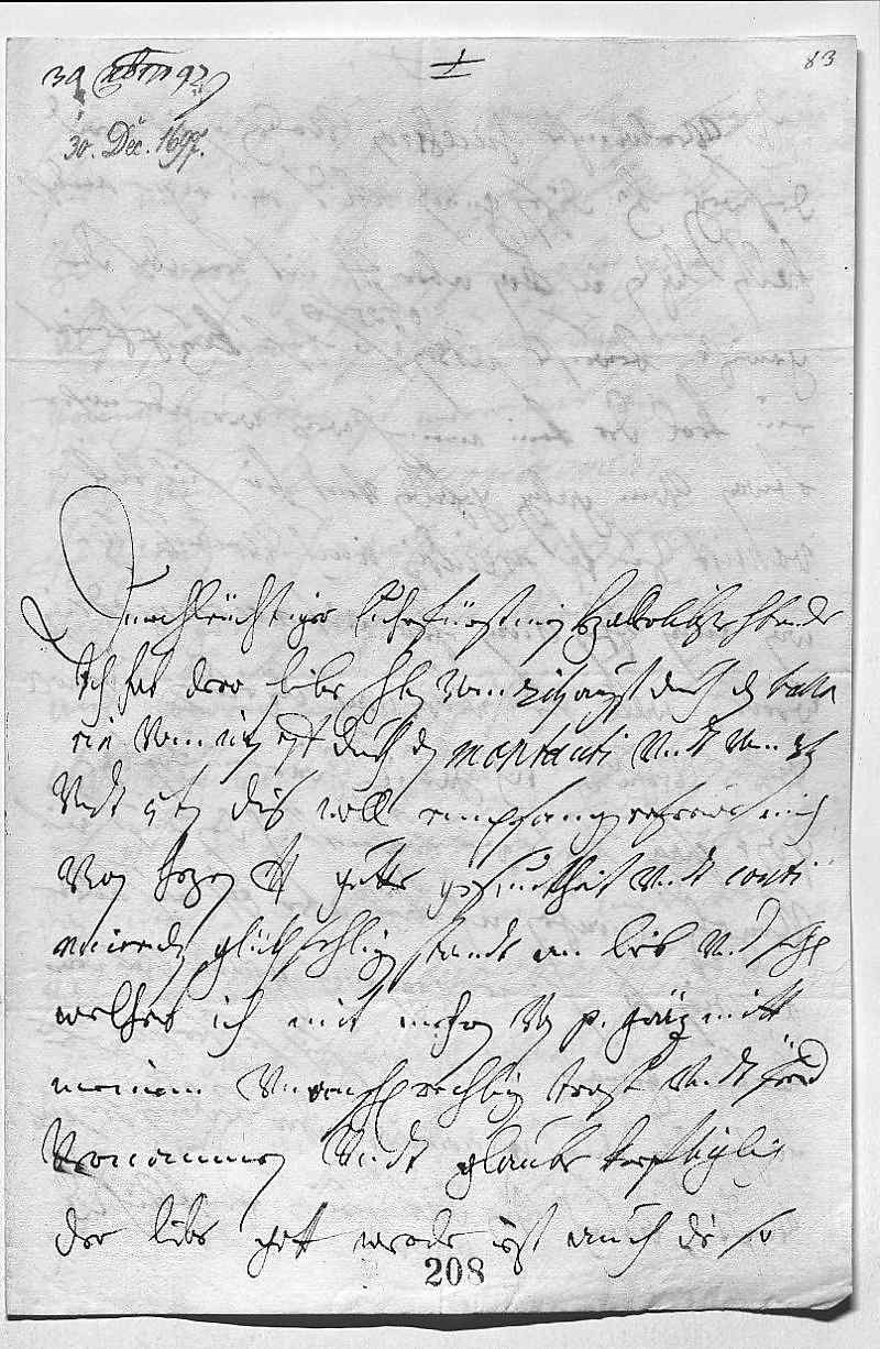 000130 decembris 970002Durchleüchtiger Cuhrfürst, mein herzallerlibster herr bruder 0003Ich hab dero liebe schreiben vom 21ten august durch den Balla- 0004rin, vom 11ten septembris durch den Montauti vndt vom 3ten 0005vndt 5ten dis woll empfangen. Erfrewe mich 0006von herzen dero Liebden gutte gesuntheit vndt conti- 0007nuierden glükhsehligen standt an leib vnd sehl, 0008welches ich mit mehren von Pater Gräz mitt 0009meinem vnauschprechligen trost vndt freüd 0010vernommen. Vndt glaube kreftliglich, 0011der libe gott werde iezt auch die so