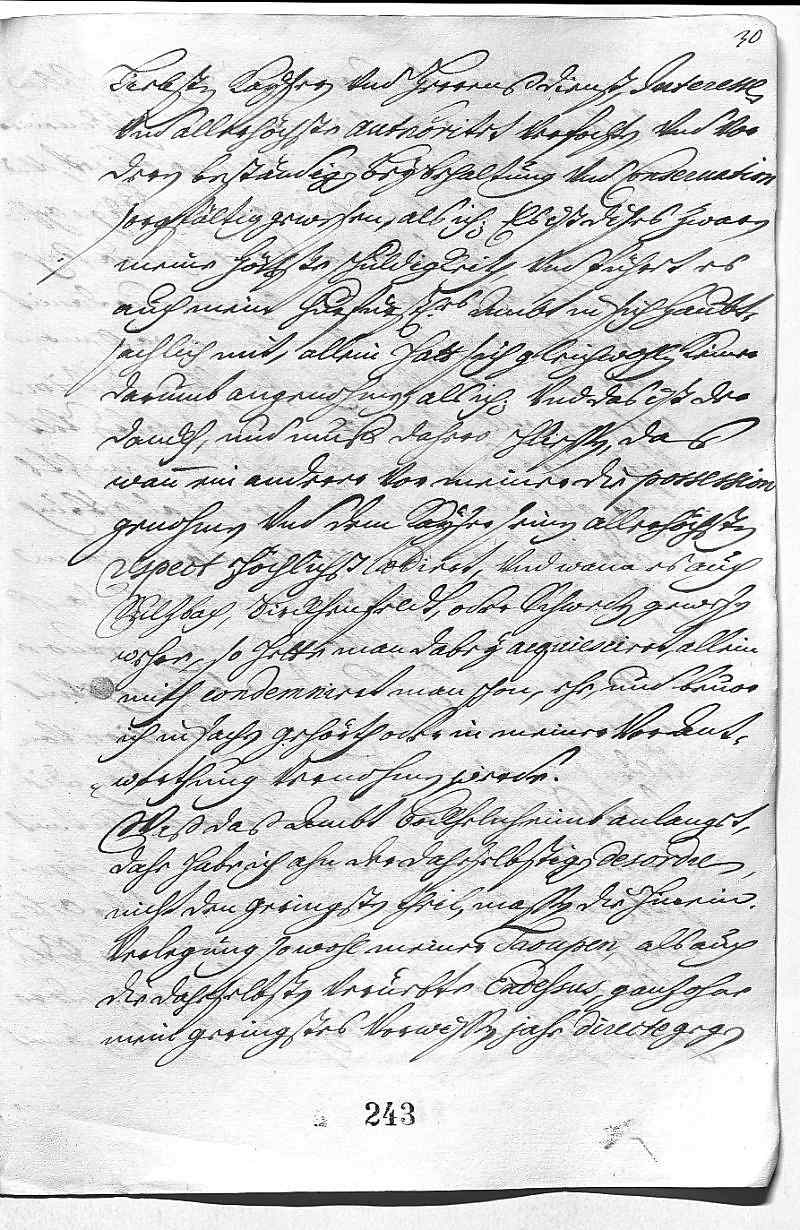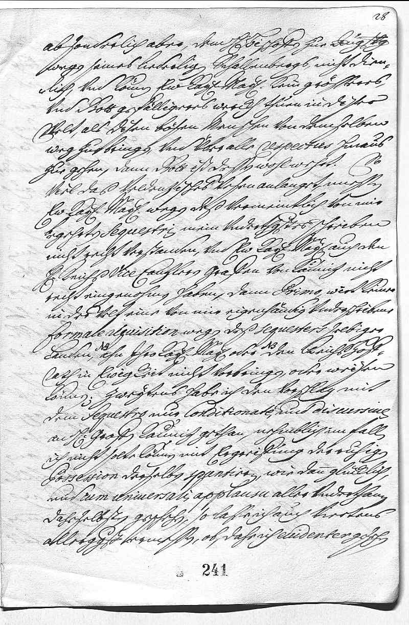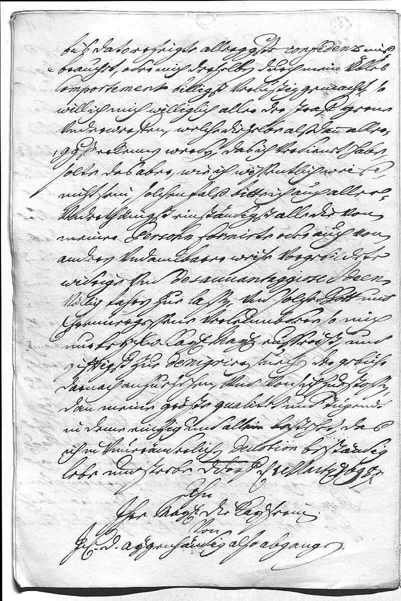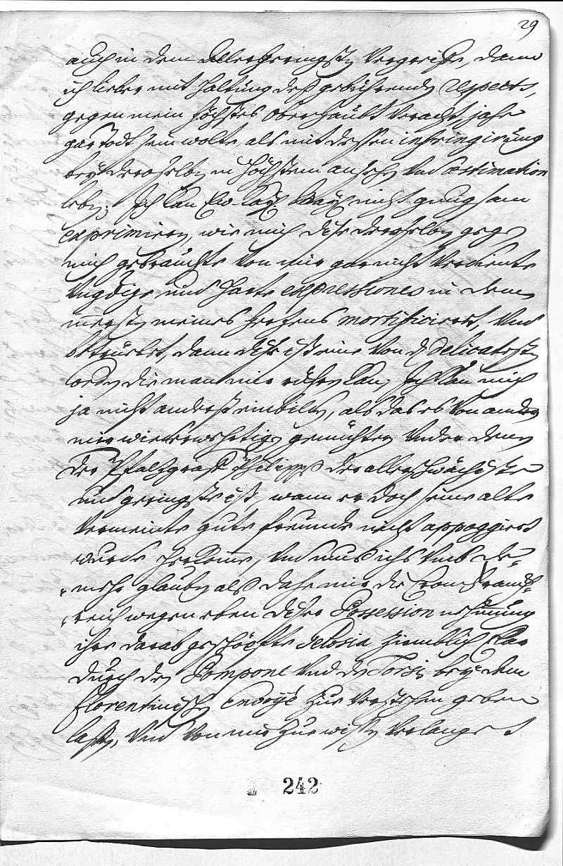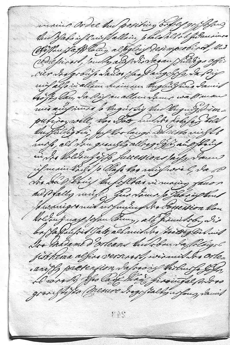 Douven hat JW geschrieben, dass der Tellier in Modena angekommen ist. – Bei der Bischofswahl in Osnabrück ist es vor allem nötig, jemanden hinzuschicken, der den Domherren angenehm und mit Bargeld und Wechselbriefen gut ausgestattet ist; nicht um Simonie zu begehen, aber die Domherren verlangen eine Anerkennung ihrer Mühe. Weiters muss er zu allerhand Gnadenversprechungen befugt sein und Tag und Nacht mit ihnen saufen können, Wein, Bier, Branntwein und Tabak . Wird den Domherren von Gymnich zur Vlatten hinschicken, der ein vorbildlicher Geistlicher ist und sich sowohl mit den dortigen „tollen Köpfen“ als auch mit den Bräuchen des päpstlichen Hofs gut auskennt. JW wird sich nach Kräften für den Herzog Karl von Lothringen einsetzen, hält aber den Bischof von Münster, der ein Parteigänger („pensionierte Kreatur“) Frankreichs ist, für den aussichtsreichsten Kandidaten. – Wegen (des Fürstentums Pfalz-)Veldenz muss ein Missverständnis vorliegen. Ist sehr betrübt über EMTs harte Worte, denn er würde es niemals an Respekt gegenüber dem Kaiser fehlen lassen. Den Vorschlag einer Sequestrierung hat er nur für den Fall gemacht, dass keine friedliche Übernahme möglich wäre. Seine Inbesitznahme (der Ämter Lauterecken und Veldenz) war berechtigt, weil Pfalz-Birkenfeld bereits im Anmarsch war, um sie unrechtmäßig und gewaltsam zu besetzen. JW, der dem Kaiserhaus so viele Opfer gebracht hat, wird ständig benachteiligt, und was man von Pfalz-Sulzbach, Pfalz-Birkenfeld oder Schweden (wegen Erbansprüchen der Linie Pfalz-Birkenfeld) akzeptiert hätte, wird ihm vorgeworfen. Weiß sich im Recht und wünscht daher nichts mehr als einen kaiserlichen Schiedsspruch. Außerdem ähnelt der veldenzische Erbfolgestreit dem mit der Madame von Orleans , und der Kaiser wird sicher keinen nachteiligen Präzedenzfall für die französischen Ansprüche auf die Pfalz schaffen wollen. – Dankt für die Erlaubnis für seinen Hofkanzler , nach Frankreich zu reisen. Warum JW gegen seinen Willen in Den Haag einen Sonderfrieden mit Frankreich schließen musste, wird Graf Kaunitz berichten. Falls dessen Erklärung JW in EMTs Augen rechtfertigt, möge sie in Zukunft weniger unvorteilhaft von ihm denken. – Legt die Sache der oberrheinischen, westerwäldischen und wetterauischen Stände nochmals zu ihren mütterlichen Füßen.