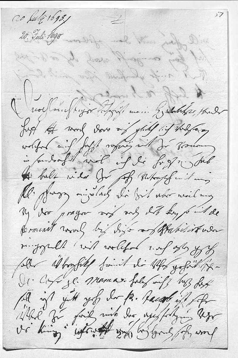 000120 julij 16980002Durchleüchtiger Cuhrfürst, mein herzallerlibster herr bruder 0003Hoff, dero Liebden werden dero reis glükhlich vortsezen, 0004welches mich hochst erfrewen wirt zu vernemen, 0005in sonderheit, weil ich die hoffnung hab, 0006dero Liebden balt wider zue sehen. Vntersteh mich, mein 0007fraw schwegrin einzuladen, die zeit aber, weil man 0008von der prager reis reden duet, kan so nit de- 0009terminirt werden, bis dise reis stabilirt oder 0010eingestelt wirt, welches nach ostern geschen 0011solle. Überschikh hirmit die vhrs, gehört ihr 0012Durchlaucht, vnser geliebsten mama, habs richten laßen, hoff, 0013sie soll iezt gutt gehn. Der Pater Jacob ist sehr 0014übel zu friden mit der ausfertigung vohr 0015die Königin, wis dero Liebden aus beyligenden sehn werden.