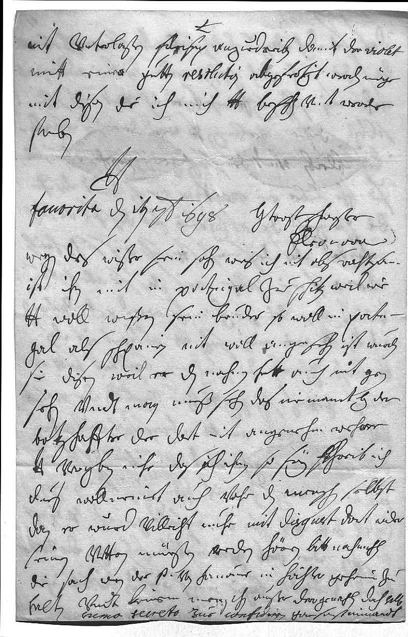 0054nit vnterlaßen fleisig anzuedreiben, damit der Violet 0055mitt einer gutten resolution abgefertigt werden möge. 0056Mit disen due ich mich dero Liebden befehlen vndt werde 0057sterben 0058dero Liebden 0059getrewste schwester 0060Eleonora 0061Fauorita den 1ten septembris 1698 0062Wegen des Wißer sein sohn weis ich nit, obs rahtsam 0063ist, ihn mit in Portugal zue schiken, weil, wie 0064dero Liebden woll wißen, sein bruder so woll in Portu- 0065gal als Schpanien nit woll angesehen ist, wurden 0066sie disen, weil er den nahmen hatt, auch nit gern 0067sehen, vndt man mueß sehen, das niemant bey dem 0068Botschaffter, der dort nit angenehm wehre. 0069Dero Liebden vergeben mihr, das ich ihnen so frey schreib, ich 0070dues wollmeinet, auch vohr den menschen selbst, 0071dan er wurd villeicht nuhr mit disgust dort wider 0072seinen vattern müeßen reden hören. Bitt nochmahlen, 0073die sach wegen der Prinzessin von Hanouer in höchster geheim zu 0074halten vndt keinem menschen außer dero gemahlin, doch sub 0075suma secreto, zue confidiren, gar sonst nimandt.