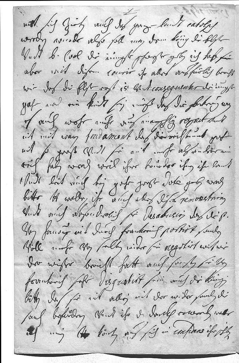 0015mitt sich zieten, auch das ganze landt catolisch 0016werden wurde, also soll man dem König die elste 0017vndt bruder Carl die iüngste schwester geben. Ich hab sie 0018aber mit disem courir ihr alles ausfürlich bericht, 0019wie das die elste erst 15 vndt conseguenter die iungste 0020gahr noch ein kindt sein müeß, das die bekerung, wan 0021es auch wehr, nuhr aus menschligen respect vndt 0022nit mit waren fondament, das die reichtumb gahr 0023nit so groß vndt sie nit mehr als andere im 0024Reich haben werden, weil ihre brüeder ihnen ihr landt 0025vndt leüt nicht, auch kein gahr große dote geben werden. 0026Bitte, dero Liebden wollen ihr auch alles dises remonstriren 0027vndt auch absonderlich sie desabusiren, das die Prinzessin 0028von Hanouer nit durch Frankreich portirt, sondern 0029vill mehr von selben wider sie negotirt wirt, wie 0030der Wißer bericht hatt, auch sonsten sie von 0031Frankreich sehr disgustirt sein, auch die Königin 0032bitten, das sie nit allein nit der wider, sondern die 0033sach befürdern vndt ihr den dankh erwerben wolle. 0034Ich mein, dero Liebden könten aus sich in confidens ihr schreiben,