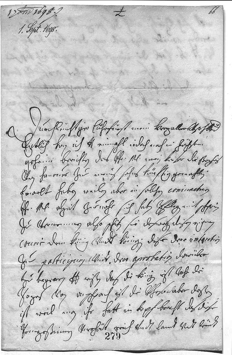 00011 septembris 16980002Durchleüchtiger Cuhrfürst, mein herzallerlibster herr bruder 0003Entlich kan ich dero Liebden einmahl, iedoch noch in höchstem 0004geheim, berichten, das ihr Mayestät, mein Keiser, die Prinzses 0005von Hanouer zue meins sohns könftig gemahlin 0006erwelt haben. Weilen aber in solchen coniuncturen 0007ihr Mayestät alzeit zueuohr sich haben pflegen mit Schpanien 0008zue vernemmen, also schiken sie deswegen disen eignen 0009courir dem König vndt Königin, dise dero intention 0010zue participirn vndt dero aprobation darüber 0011zu begeren. Dero Liebden wißen, das die Königin izt vohr die 0012Prinzes von Anschpach ist, die vhrsach aber deßen 0013ist, weil man ihr hatt in kopf bracht, das diese 0014Prinzeßinnen vnerhört reich vndt landt vndt leüdt