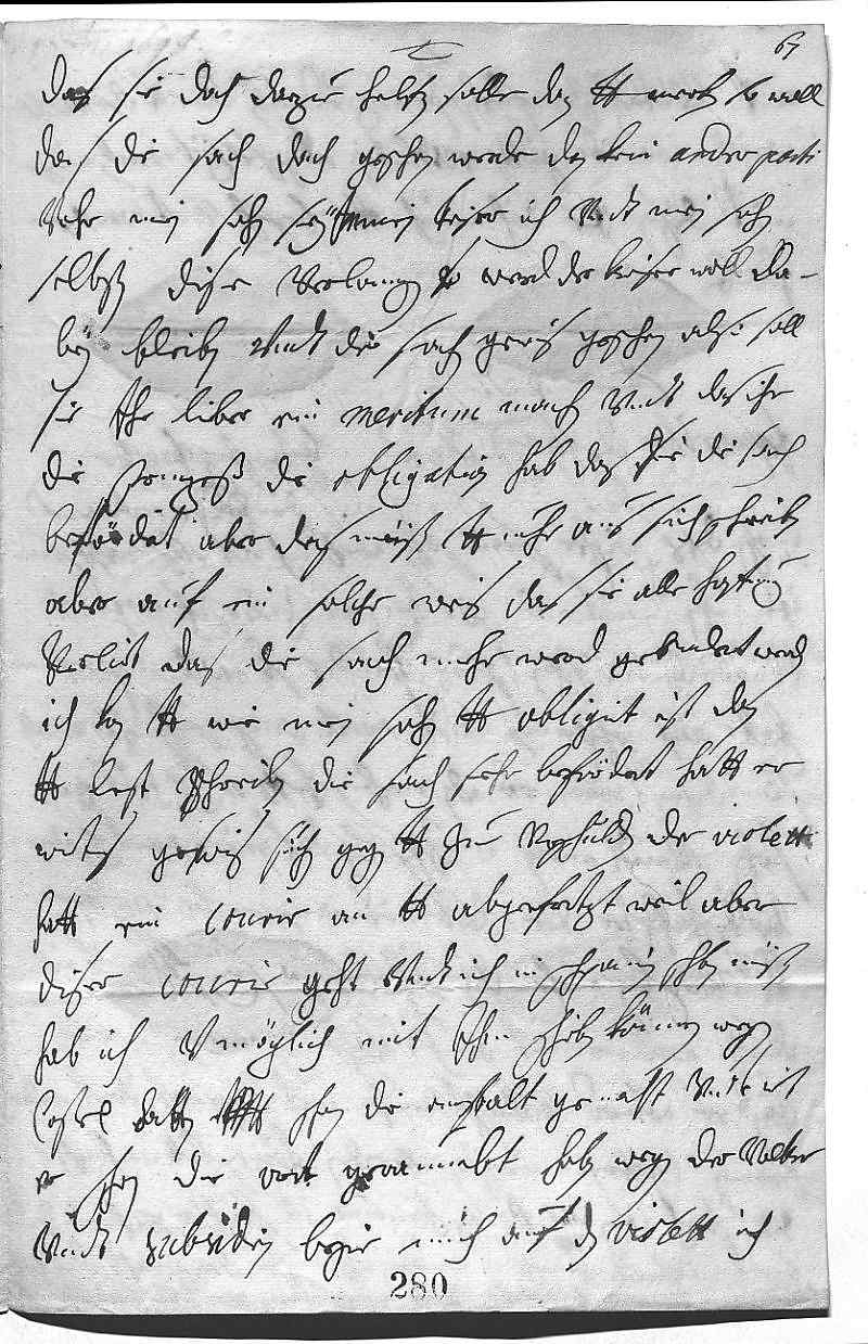 0035das sie doch darzue helfen solle, dan dero Lieben merken so woll, 0036das die sach doch geschen werde, dan kein ander parti 0037vohr mein sohn sey, ihr Mayestät, mein Keiser, ich vndt mein sohn 0038selbsten dise verlangen, so werd der Keiser woll da- 0039bey bleiben vndt die sachen gewis geschen. Also soll 0040sie ihr lieber ein meritum machen vndt das ihr 0041die Prinzeß die obligation hab, das sie die sach 0042befördert. Aber das müßen dero Liebden nuhr aus sich schreiben, 0043aber auf ein solche weis, das sie alle hoffnung 0044verlirt, das die sach mehr werd gehindert werden können. 0045Ich kan dero Liebden nicht sagen, wie mein sohn dero Liebden obligirt ist, dan 0046dero Liebden lest schreiben die sach sehr befördert hatt, er 0047wirts gewis suchen gegen dero Liebden zue verschulden. Der Violett 0048hatt ein courir an dero Liebden abgefertigt, weil aber 0049diser courir geht vndt ich in Schpanien schreiben müßen, 0050hab ich vnmöglich mit ihm schreiben können. Wegen 0051Caßel hatten ihr Mayestät schon die anstalt gemacht vndt wirt 0052er schon die ort geraumbt haben. Wegen der volker 0053vndt subsidien bezie mich auf den Violett, ich werde