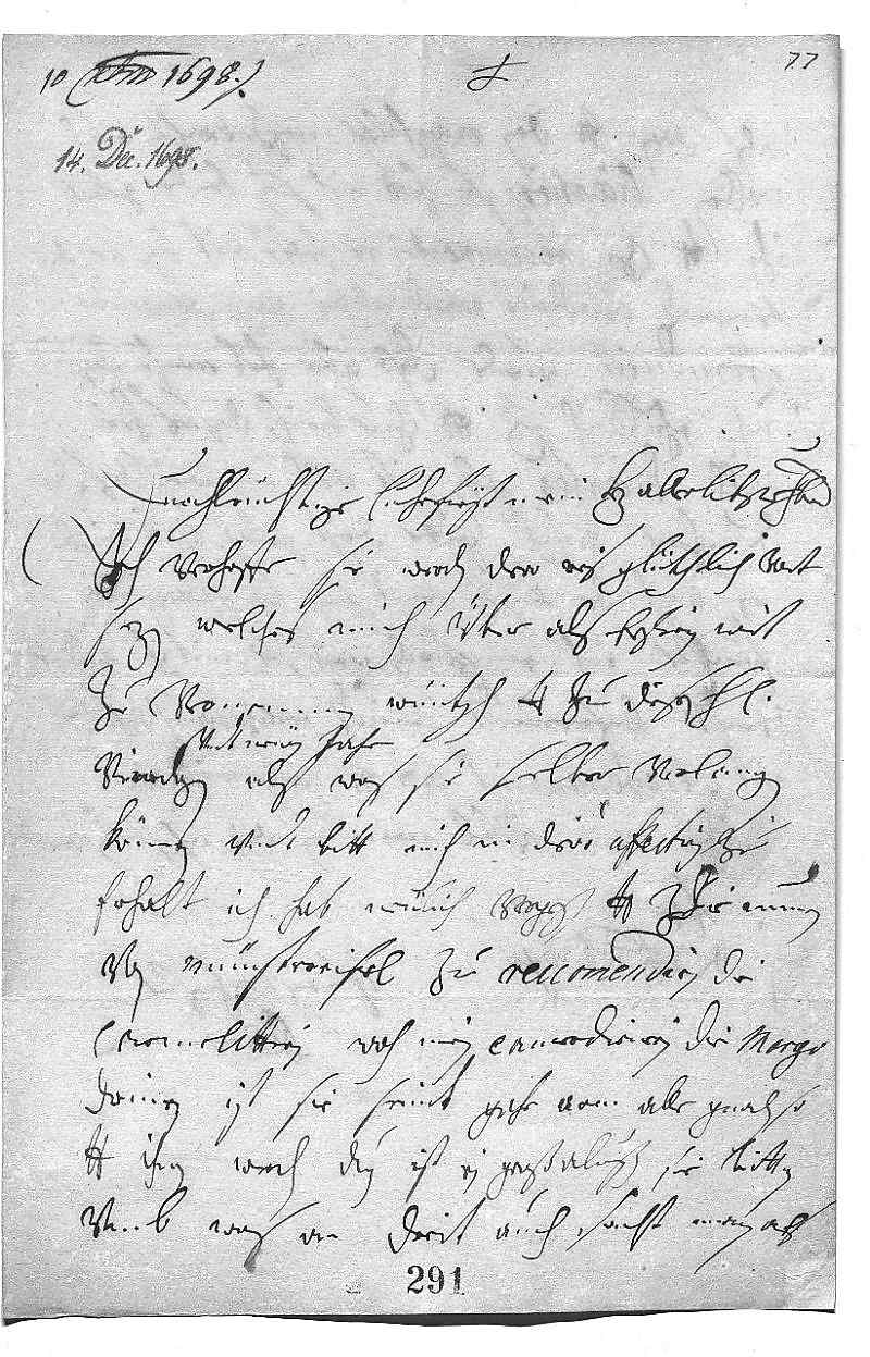 000110 decembris 16980002Durchleüchtiger Cuhrfürst, mein herzallerlibster herr bruder 0003Ich verhoffe, sie werden dero reis glükhlich vort 0004sezen, welches mich über als erfreien wirt 0005zu vernemmen. Wüntsch dero Liebden zu diesen heiligen 0006veirdagen vndt newen jahr als, was sie selber verlangen 0007können vndt bitt, mich in dero affection zu 0008erhalt. Ich hab neülich vergeßen, dero Liebden die nunnen 0009von Münstereifel zu reccomendiren, die 0010carmelitterin, woh mein camerdienerin, die Margo, 0011drinen ist. Sie seint gahr arm, alle gnaden, so 0012dero Liebden ihnen werden duen, ist ein groß almußen. Sie bitten 0013vmb was an dreit. Auch sacht man, als