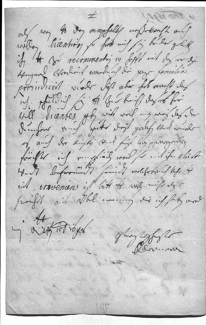 0014als wan dero Liebden den Marschalkh Neßelraht auch 0015wollen licentiren, so hatt mich sein bruder gebetten, 0016ihn dero Liebden zu recommendirn, er hofft nit, das er dise 0017vngnad verdient, wardurch die ganze familia 0018preiudicirt wurde. Daß aber hab eracht, das 0019ich schuldich sey, dero Liebden zue berichten, das es hir 0020vill dicentes geben wirt, weil man weis, das der 0021dumher auch gutte dienst gedahn, vndt wurde 0022es auch der Kinsky vndt Fürst von Schwarzenberg, 0023förchte ich, empfinden, weil sie mit ihm aliirt 0024vndt befreündt seindt, welches auch vohr dero Liebden 0025nit conveniens ist. Bitt, dero Liebden wollen mihr dise 0026freiheit nit übl nemmen, die ich sterben werd 0027dero Liebden 0028getrewste schwester 0029Eleonora 0030Wien den 14ten decembris 1698