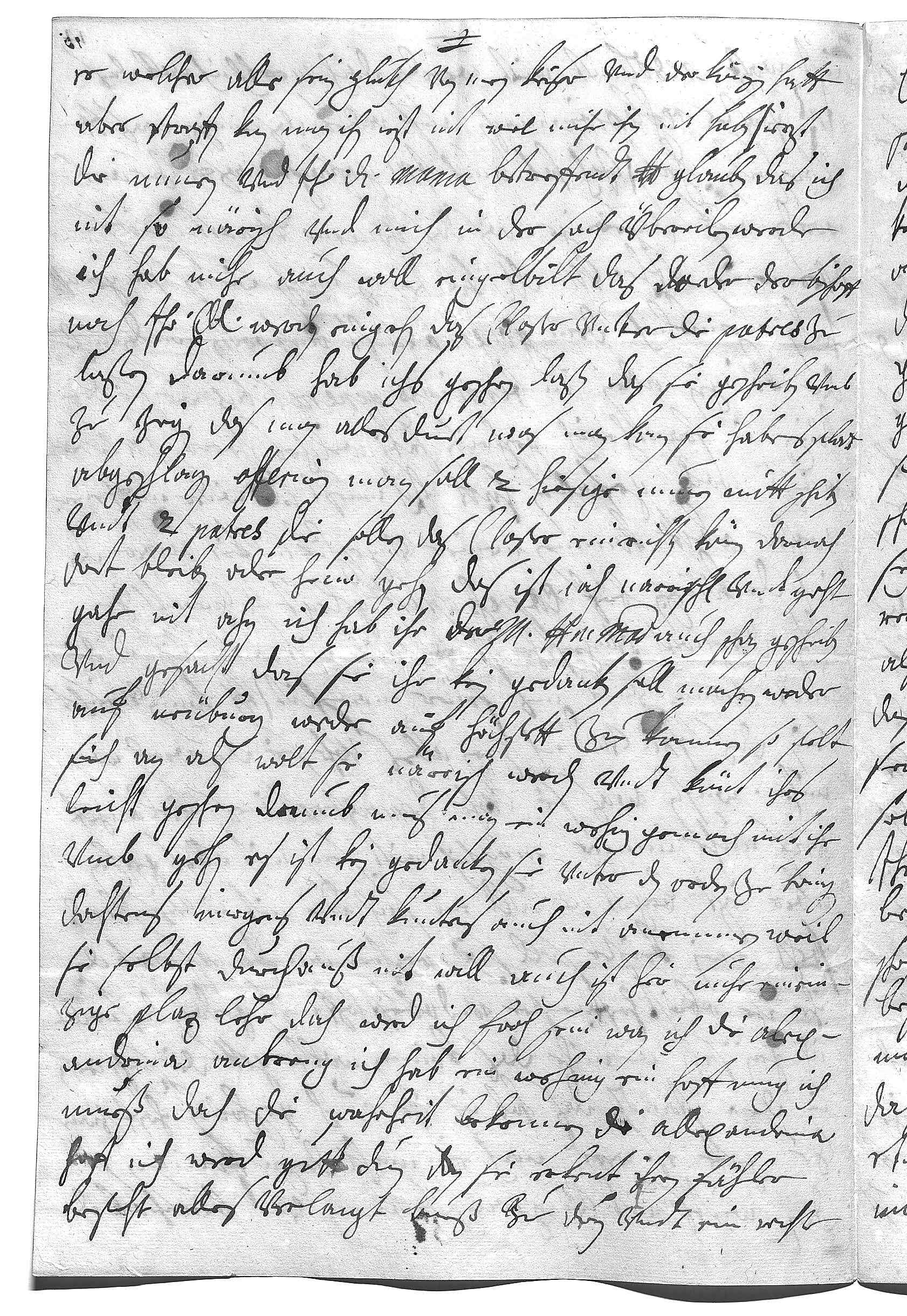 0109er, welcher alle sein glükh von mein Keiser vnd der Königin hatt, 0110aber straffen kan man ihn iezt nit, weil mihr ihn nit haben. Iezt 0111die nunnen vnd ihr Durchlaucht mama betreffendt, dero Liebden glauben, das ich 0112nit so närisch vnd mich in der sach übereilen werde. 0113Ich hab mihr auch woll eingelbilt, das weder der Bischoff 0114noch ihr Durchlaucht werden eingehen, das closter vnter die patres zu 0115laßen, darumb hab ichs geschen laßen, das sie geschriben, vmb 0116zu zeigen, das man alles duet was man kann. Sie habens platt 0117abgeschlagen, offeriren, man soll 2 hiesige nunnen mitt schiken 0118vndt 2 patres, die sollen das closter einrichten, können darnach 0119dort bleiben oder herin gehen. Das ist iah narrisch vndt geht 0120gahr nit ahn. Ich hab ihr, der Mutter Anna Magdalena, auch schon geschriben 0121vnd gesacht, das sie ihr kein gedanken soll machen, weder 0122auf Neüburg weder auf Höchstett zu kommen, so stelt sie0123sich an, als wolt sie närrisch werden, vndt könt ihrs 0124leicht geschen, drumb mues man ein wehnig gemach mit ihr 0125vmb gehen. Es ist kein gedanken, sie vnter den orden zu bringen, 0126dahtens nirgens vndt kuntens auch nit anemmen, weil 0127sie selbst durchauß nit will, auch ist hier nuhr einein- 0128zige plaz lehr, dah werd ich froh sein, wan ich die Alex- 0129andrina anbreng. Ich hab ein wehnig ein hoffnung, ich 0130mueß doch die wahrheit bekennen, die Allexandrina, 0131hoff ich, werd gutt duen, dan sie erkent ihren fähler, 0132besteht alles, verlangt bueß zu duen vndt ein rechte
