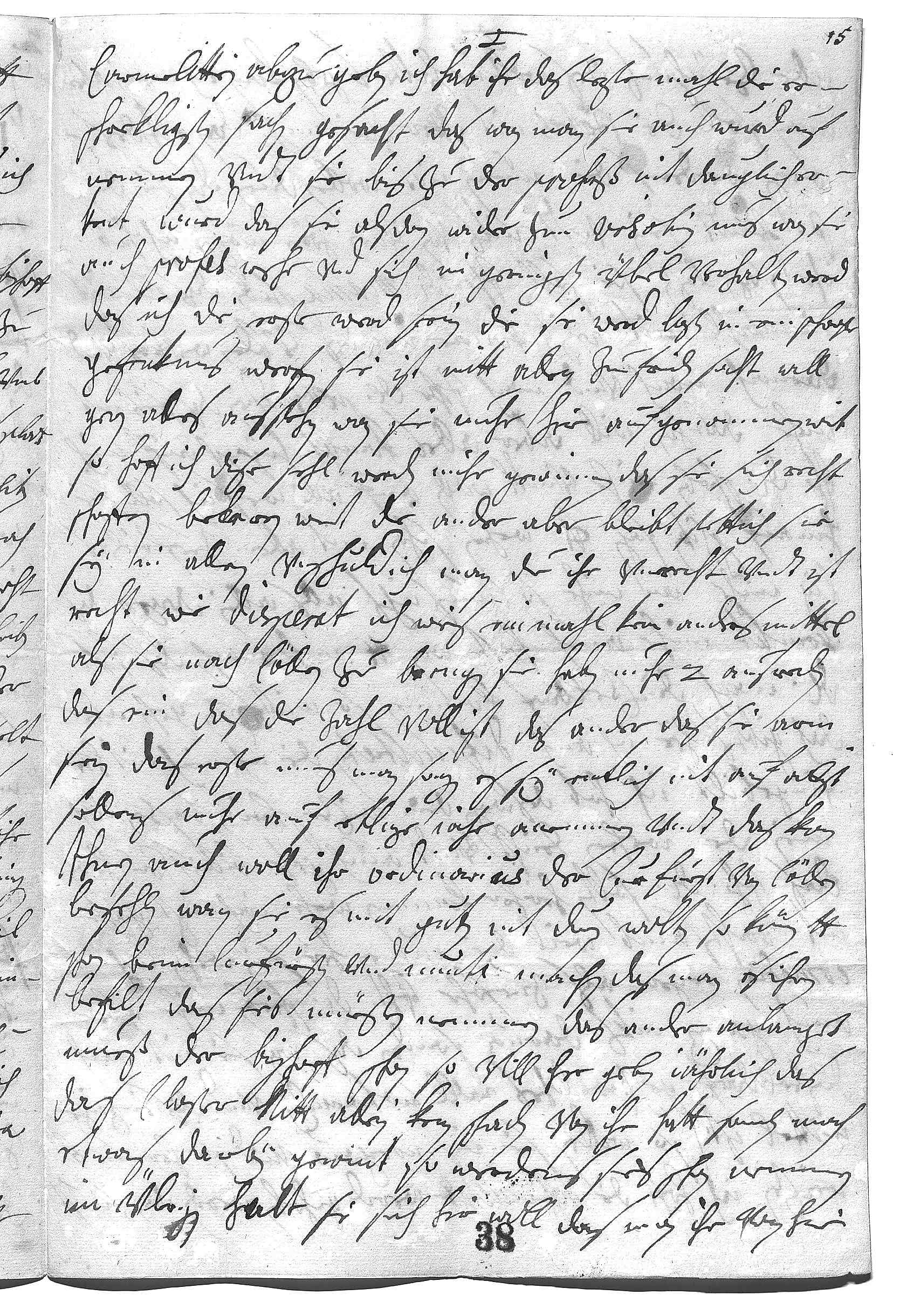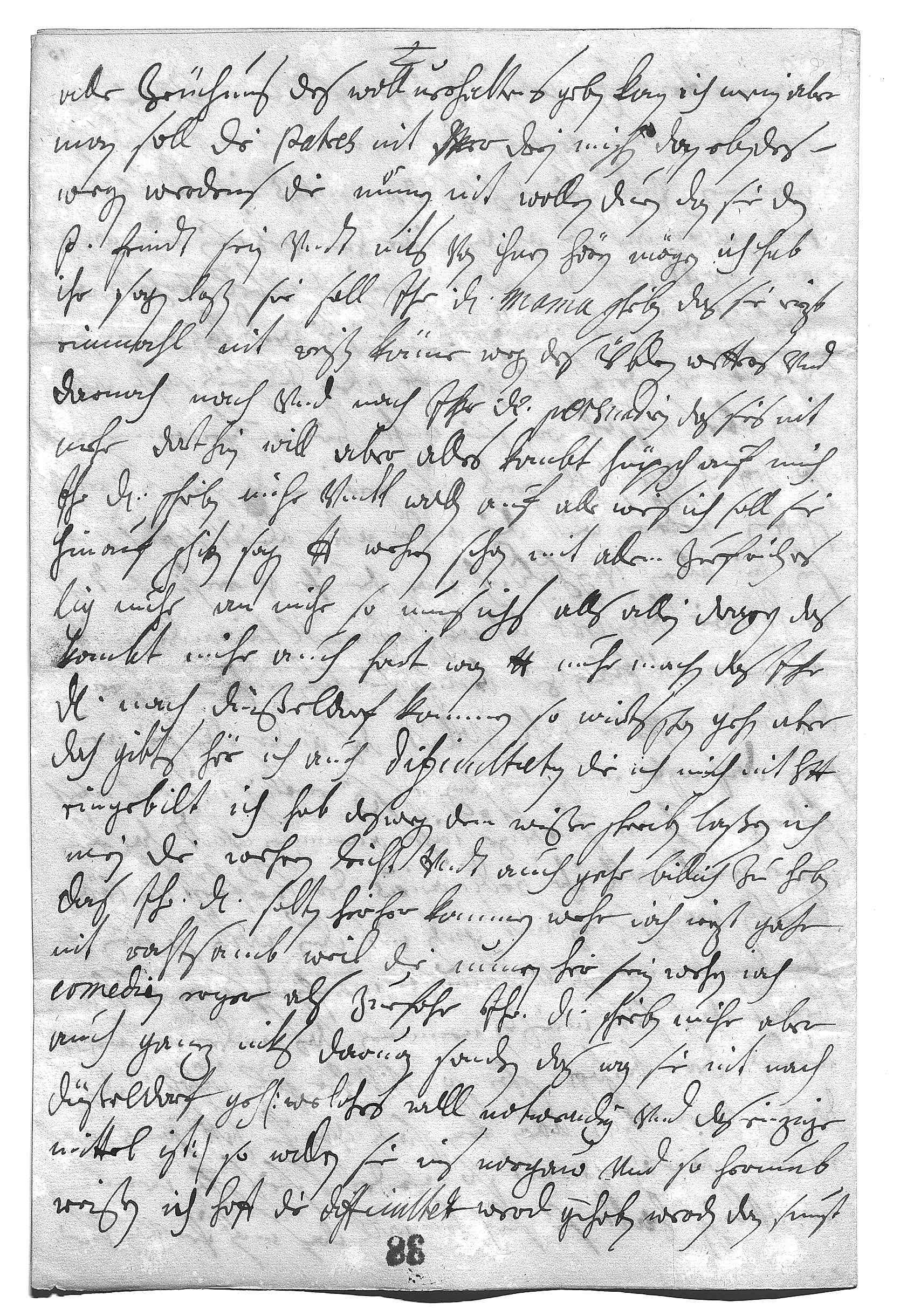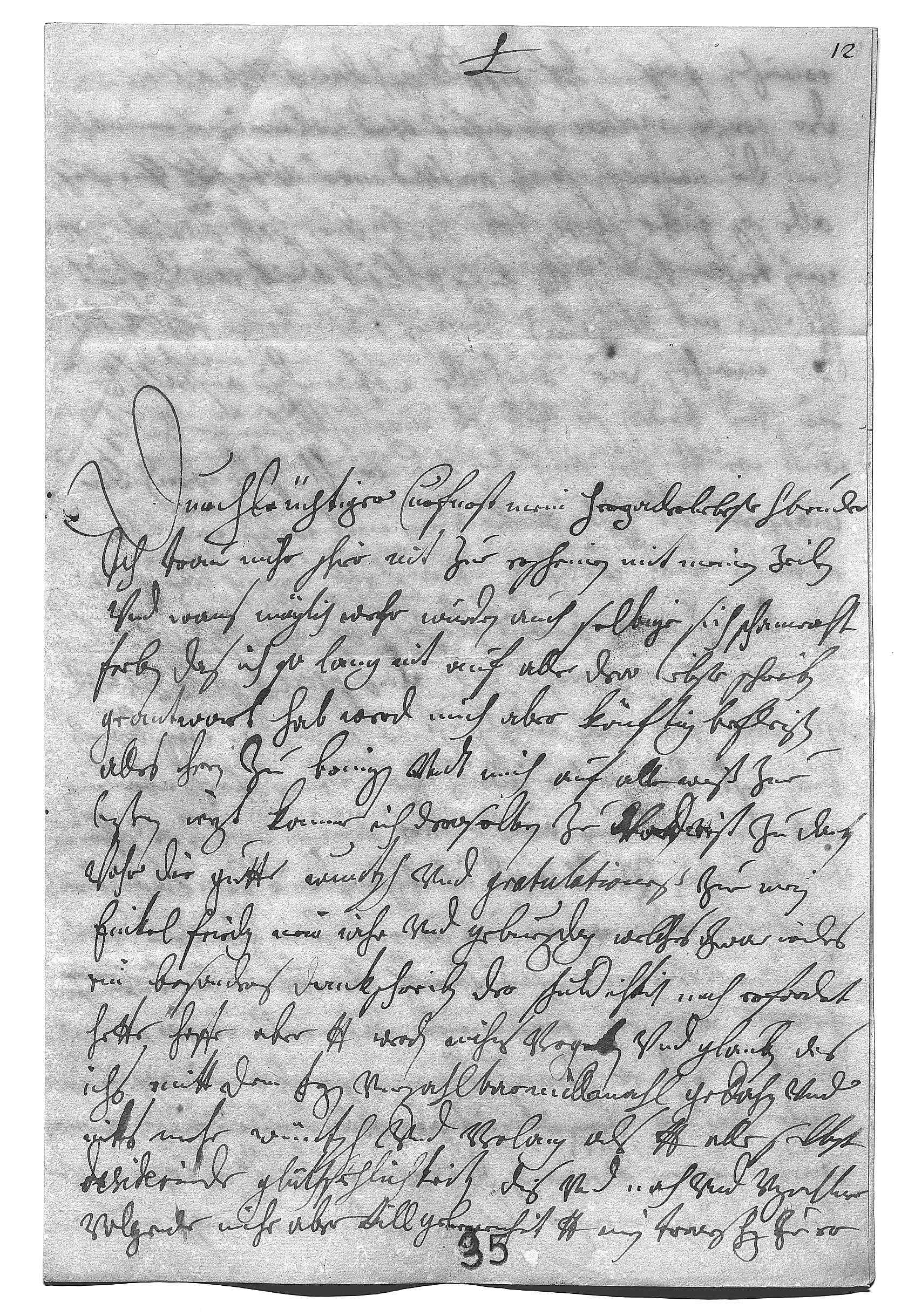 0001Durchleüchtiger Curfürst, mein herz allerliebester herr bruder 0002Ich trau mihr schier nit zue erscheinen mit meinen zeilen, 0003vnd wans möglich wehr, würden auch selbige sich schamroht 0004ferben, das ich so lang nit auf alle dero liebste schreiben 0005geantwort hab, werd mich aber könftig befleißen, 0006alles herein zu bringen vndt mich auf alle weiß zue 0007beßern. Iezt komme ich, deroselben zu vorderist zu danken 0008vohr die gutte wuntsch vnd gratulationeß zue mein 0009enikel, feirdag, new iahr vnd geburzdag, welches zwar iedes 0010ein besonders dankschreiben der schuldichkeit nach erfordert 0011hette, hoffe aber, dero Liebden werden mihrs vergeben vnd glauben, das 0012ichs mitt dem herzen vnzahlbarnuillemahl gedahn vnd 0013niks mehr wüntsch vnd verlang, als dero Liebden alle selbst 0014desiderirde glükhsehlichkeiten dis vnd noch vnd vnzalbar 0015volgende, mihr aber vill gelegenheit, dero Liebden mein trewes herz zue er-