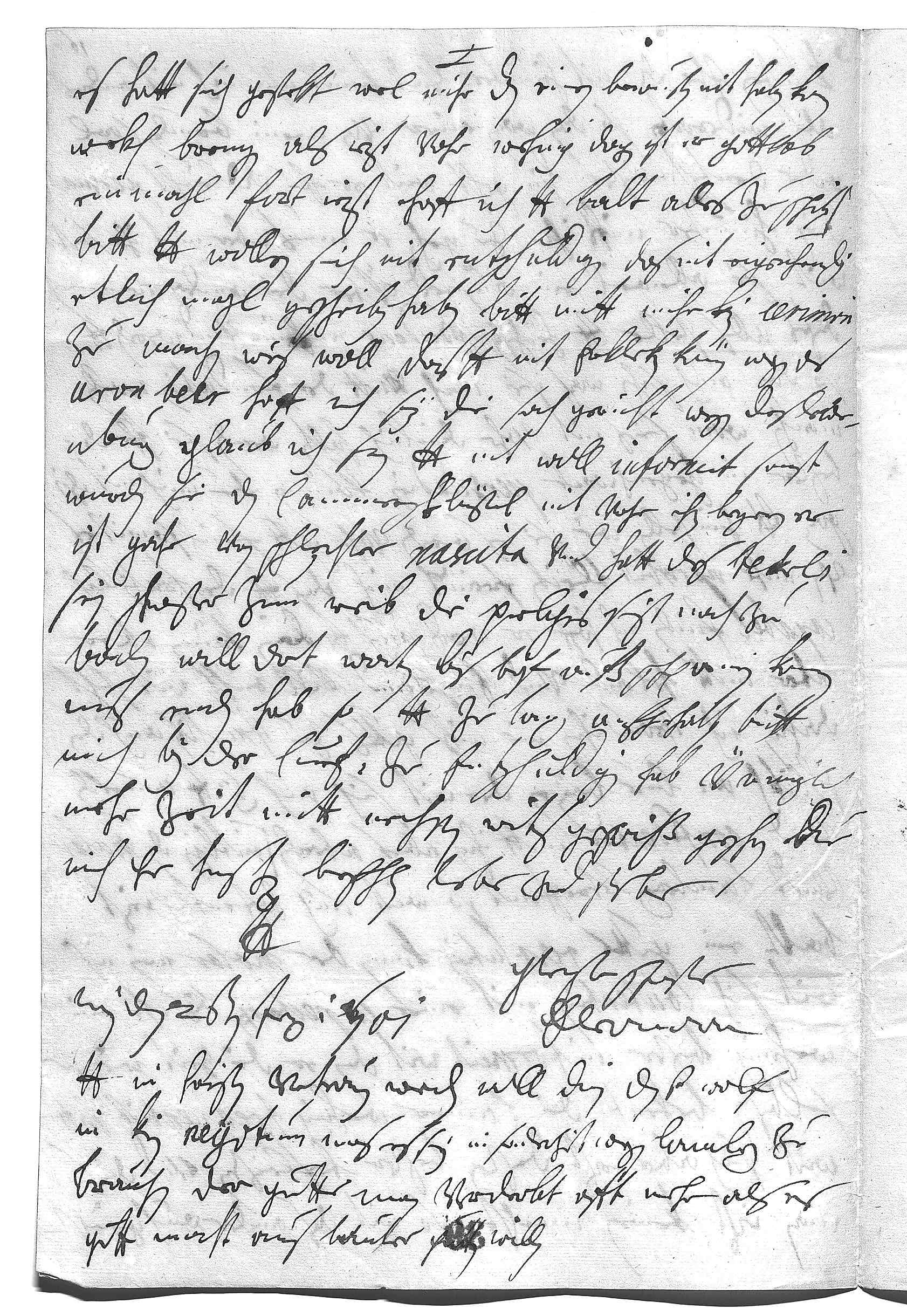 0203Es hatt sich gestekt, weil mihr den einen bewusten nit haben konnen 0204wekh brengen, als izt vohr wehnig dagen ist er gottlob 0205einmahl fort. Iezt hoff ich, dero Liebden balt alles zu schiken. 0206Bitt, dero Liebden wollen sich nit entschuldigen, das nit eigenhendig 0207etlich mahl geschriben haben, bitt mitt mihr kein cerimoni 0208zu machen, weis woll, das dero Liebden nit erkleken künen. Wegen des 0209Aron Beer, hoff ich, sey die sach gericht. Wegen deß Lede- 0210nburg, glaub ich, sein dero Liebden nit woll informirt, sonst 0211wurden sie den cammerschlüßel nit vohr ihn begern, er 0212ist gahr von schlechter nascita vnd hatt des Tekeli 0213sein schwester zum weib. Die Perlips sizt noch zu 0214Baden, will dort warten bis brif aus Schpanien kommen. 0215Mues enden, hab so dero Liebden zu lang aufgehalten. Bitt, 0216mich bey der Curfürstin zu entschuldigen, hab ünmüglich 0217mehr zeit, mitt nechsten wirts gewiß geschen. Due 0218mich ihr ins herz befehlen, lebe vnd sterbe 0219dero Liebden 0220getrewste schwester 0221Eleonora 0222Wien den 26ten januarij 1701 0223Dero Liebden in hösten vertrawen, werden woll duen, den Pater Wolf 0224in kein negotium, was es sey, in sonderheit wegen Lamberg zu 0225brauchen, der gutte man verderbt offt mehr als er 0226gutt macht aus lauter gutten willen.