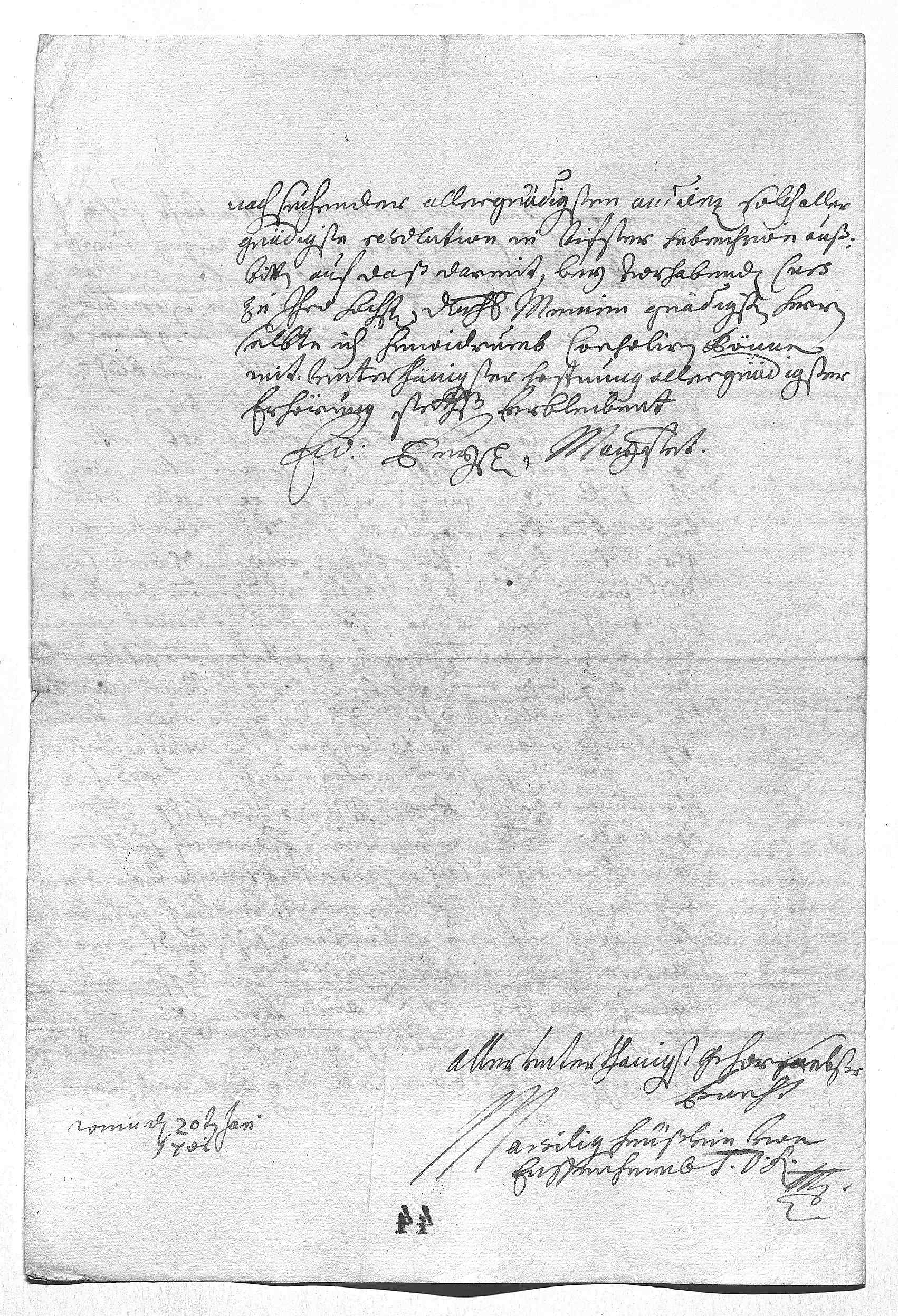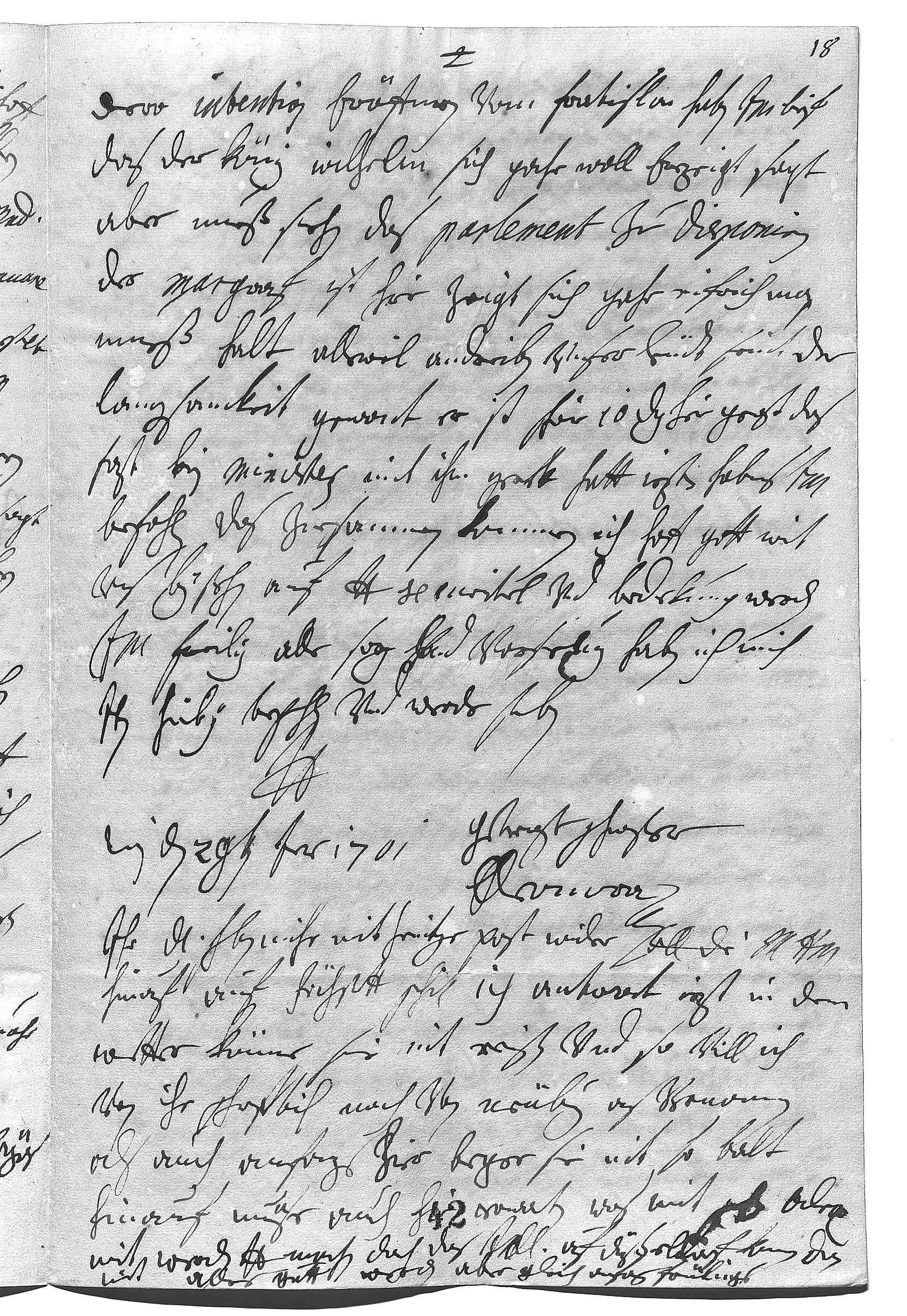 0034dero intention eröffnen. Vom Fratislav haben ihr Mayestät brif, 0035das der König Wilhelm sich gahr woll erzeigt, sagt 0036aber, er muß sehen das parlement zu disponiren. 0037Der Margraf ist hier, zeigt sich gahr eifrich, man 0038mueß halt alleweil andreiben, vnser leüdt seint der 0039langsamkeit gewont. Er ist schier 10 dag hier gewest, das 0040fast kein minister mit ihm geret hatt, jezt habens ihr Mayestät 0041befohlen, das zuesammen kommen. Ich hoff, gott wirt 0042vns bey stehen, auf dero Liebden securitet vnd bedekung werden 0043ihr Mayestät freilig alle sorg vnd vorsehung haben. Ich tue mich 0044itm hierbey befehlen vnd werde sterben 0045dero Liebden 0046getrewst schwester 0047Eleonora 0048Wien den 29ten januarij 1701 0049Ihr Durchlaucht haben mihr mit heintiger post wider geschrieben, ich soll die Mutter Anna 0050hinauf auf Höchstett schiken. Ich antwort iezt, in dem 0051wetter könne sie nit reisen, vnd so vill ich 0052von ihr schriflich noch von Neüburg aus vernommen, 0053als auch anfangs hier, beger sie nit so balt 0054hinauf, müse auch hir erwarten was mit schwester Alexandra 0055wirt. Werden dero Liebden machen, das ihre Durchlaucht auf Düßeldorf komen, dan 0056wirt alles gutt werden, aber gleich anfang frülings.