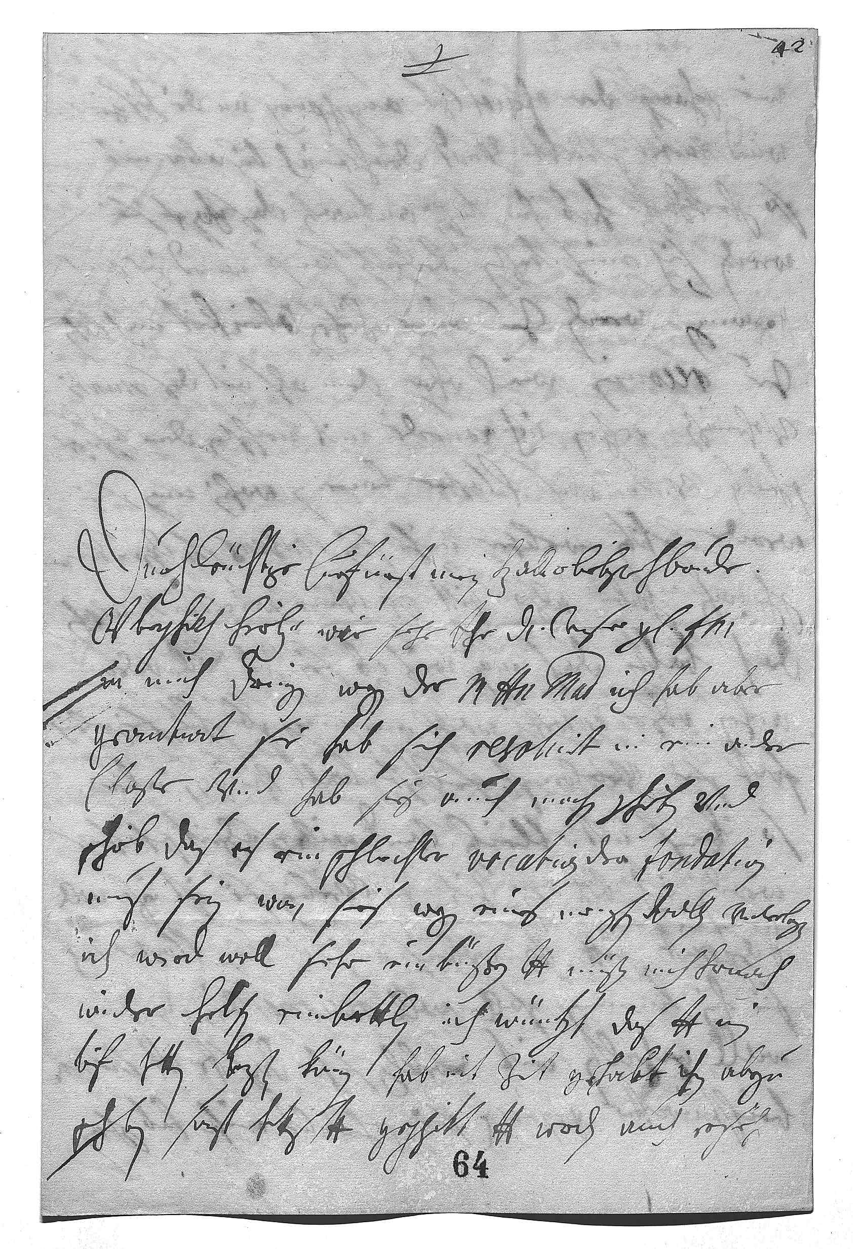 0001Durchleüchtiger Curfürst, mein herzallerliebster herr bruder 0002Vberschikh hirbey, wie sehr ihr Durchlaucht, vnser geliebste fraw mutter, 00031in mich dringen wegen der Mutter Anna Magdalena . Ich hab aber 0004geantwort, sie hab sich resoluirt in ein ander 0005closter vnd hab sies auch machen schreiben vnd 0006schreib, das es ein schlechter vocation der fondation 0007mus sein, wan sies wegen eines menschen wollen vnterlaßen. 0008Ich werd woll sehr einbüßen, dero Liebden müßen mich hernach 0009wider helfen einbettlen. Ich wüntzt, das dero Liebden mein 0010brif hetten leßen könen, hab nit zeit gehabt ihn abzu 0011schreiben, sonst hetts dero Liebden geschikt. Dero Liebden werden auch ersehn,