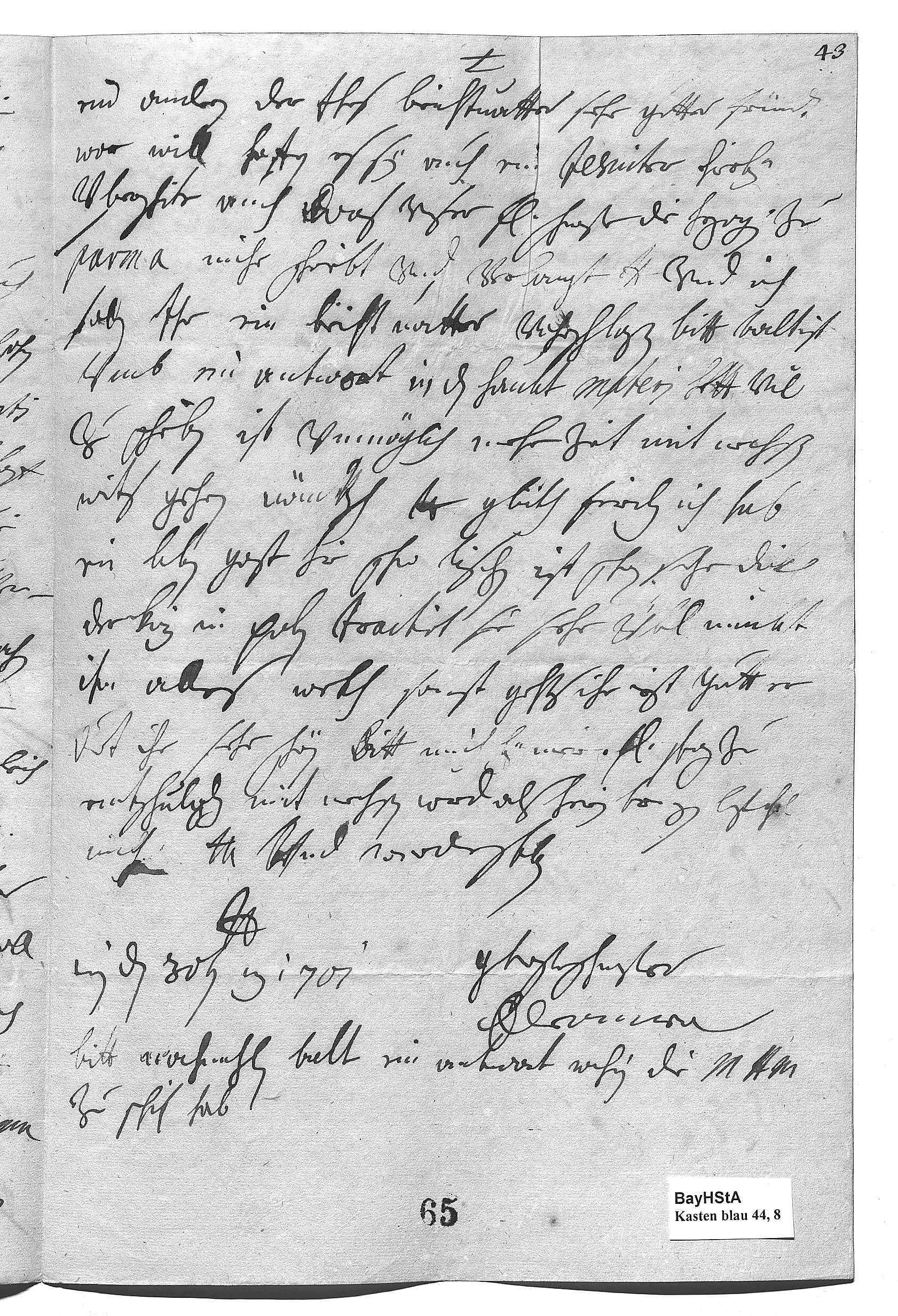 0031ein andren, der ihres Beichtuatter sehr gutter freündt 0032war, will hoffen, es sey auch ein jesuiter. Hierbey 0033vberschik auch, was vnser fraw schwester, die Herzogin zu 0034Parma, mihr schreibt vnd verlangt, dero Liebden vnd ich 0035sollen ihr ein beicht uatter vohrschlagen, bitt baltist 0036vmb ein antwort. In den haubt materi hett vil 0037zu schreiben, ist vnmöglich mehr zeit, mit nechsten 0038wirts gehen. Wüntsch dero Liebden glückh und frieden. Ich hab 0039ein liben gast hir, schwester Lischen ist schon sehr dik, 0040der Konig in Polen tractirt sie sehr übl, nimbt 0041ihn alles wekh, sonst gehts ihr izt gutt, er 0042duet ihr sehr schön. Bitt mich bey meiner fraw schwägerin zu 0043entschulgdigen, mit nechsten werd als herein bringen. Befehl 0044mich dero Liebden vnd werde sterben 0045dero Liebden 0046getrewste schwester 0047Eleonora 0048Wien den 30ten merz 1701 0049Bitt nochmahlen balt ein antwort, wohin die Mutter Anna Magdalena 0050zu schiken hab.