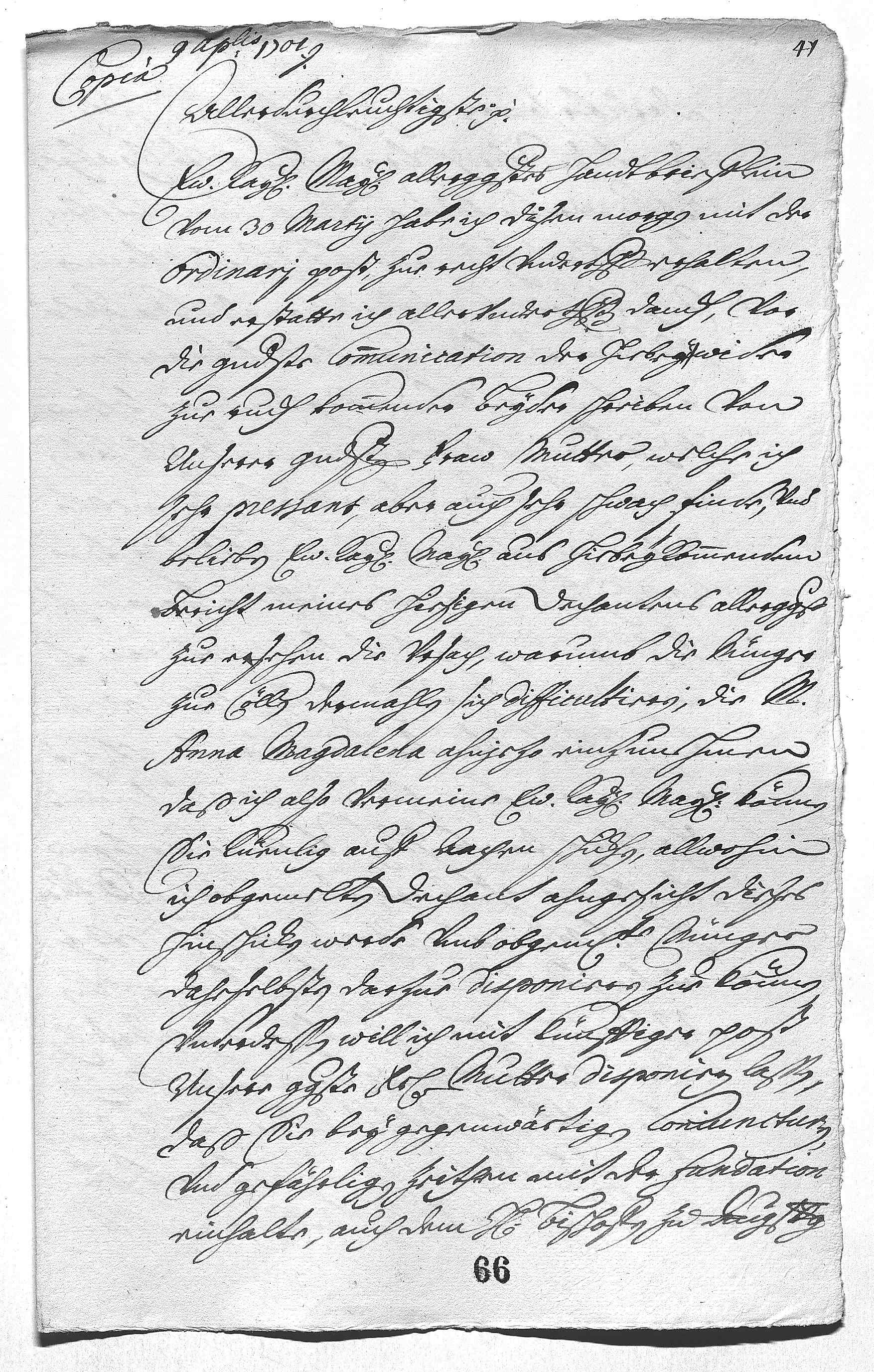 Sendet die Briefe der Mutter beiliegend zurück. Die Nonnen in Köln nehmen die M. (Ma Mère) Anna Magdalena nicht auf; schickt seinen hiesigen Dechanten jetzt nach Aachen. – Will die Mutter und den Bischof von Augsburg (Bruder Alexander Sigismund) überzeugen, in diesen gefährlichen Zeiten die Klostergründung zu verschieben. – Findet das Schreiben des augsburgischen Offizials an die Ma Mère impertinent, dagegen höchst vernünftig, was EMT der Mutter geschrieben hat und was sie den Offizial hat schreiben lassen. – Der Beichtvater der Mutter ist Jesuit und heißt Pater Staudacher . – Die Herzogin von Parma (Schwester Dorothea Sophie) hat JW dasselbe geschrieben wie EMT. Pater Rehm , der frühere Beichtvater der spanischen Königin (Schwester Maria Anna), scheint JW geeignet zu sein. – Erwartet in der Hauptsache (gemeint sind die Kriegsvorbereitungen)sehnlich EMTs Antwort, denn am Oberrhein verstreichen die schönsten Gelegenheiten und hier rückt die Gefahr immer näher. – Beklagt, wie der König in Polen die Schwester (Hedwig Elisabeth) und ihren Prinzen zugrunde richtet; freut sich aber, dass der Prinz sich jetzt gut beträgt. – JWs Gemahlin dankt für die Grüße. – Erinnert an die Vermählung des Pfalzgrafen (Bruder) Karl (Philipp), die Grafen Lamberg und Mollard, das Antimon und das Gold.