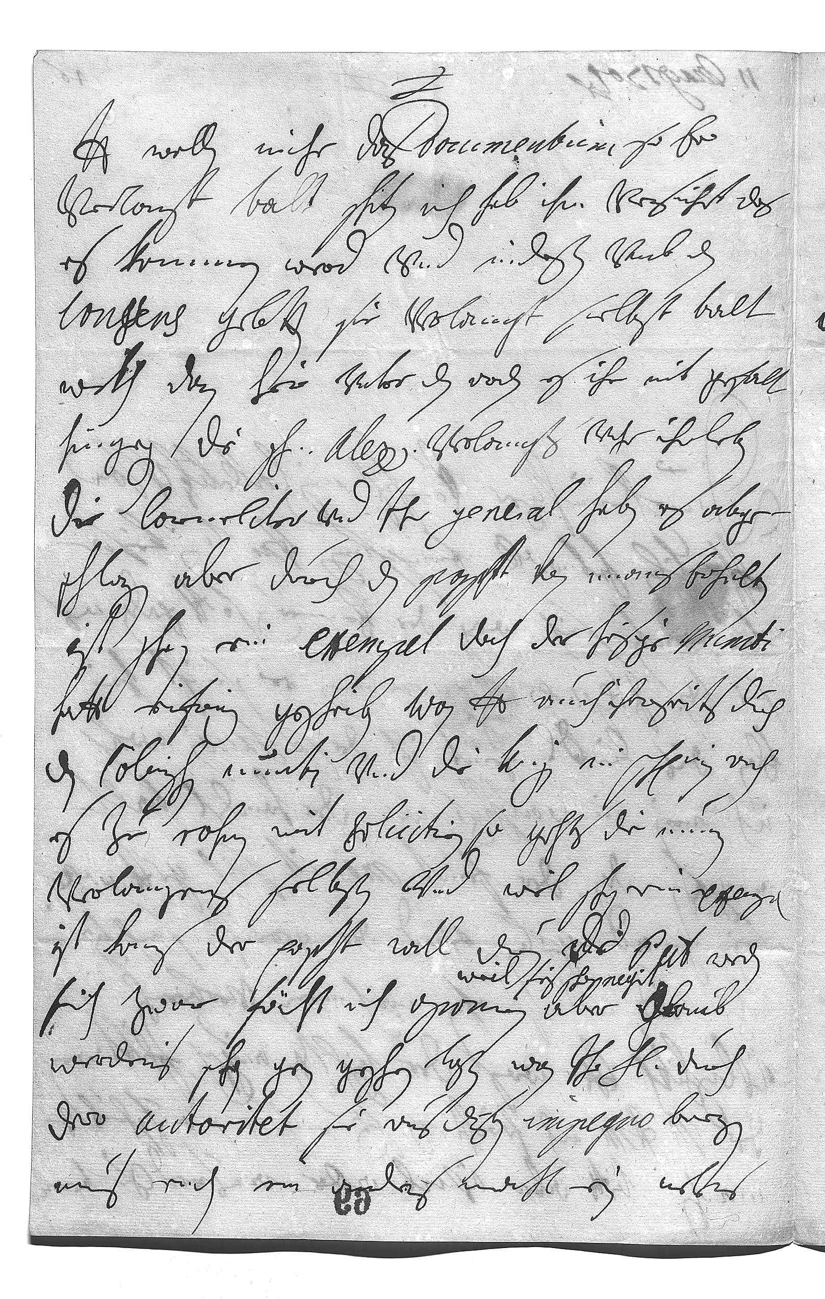 0001Durchleüchtiger Curfürst, mein herzallerliebster herr bruder 0002Dero Liebden schreiben hab woll empfangen. Ihr Mayestät, mein Keiser, 0003bedanken sich wegen der erinnerung, so dero Liebden gedan, was 0004sie von Stepne vernommen, er sumst hir 0005eben dis liedl. Heüt ist der Pater Sauoi wekh, 0006ich mein, in Walschlzt wert der handel baldt 0007angehn, dan der feint mouirt sich, gott wolle 0008sein gnad geben vnd der gerechten sach bey- 0009stehen vnd nit strafen nach meinen verbrechen. 0010Überschikh dero Liebden, was der Bischof von Augsburg schreibt wegen 0011der Mutter Ana, ich förcht, es sey nuhr um ein aufschub zu 0012machen, bitt aber, vmb alle ausred zu benemen,