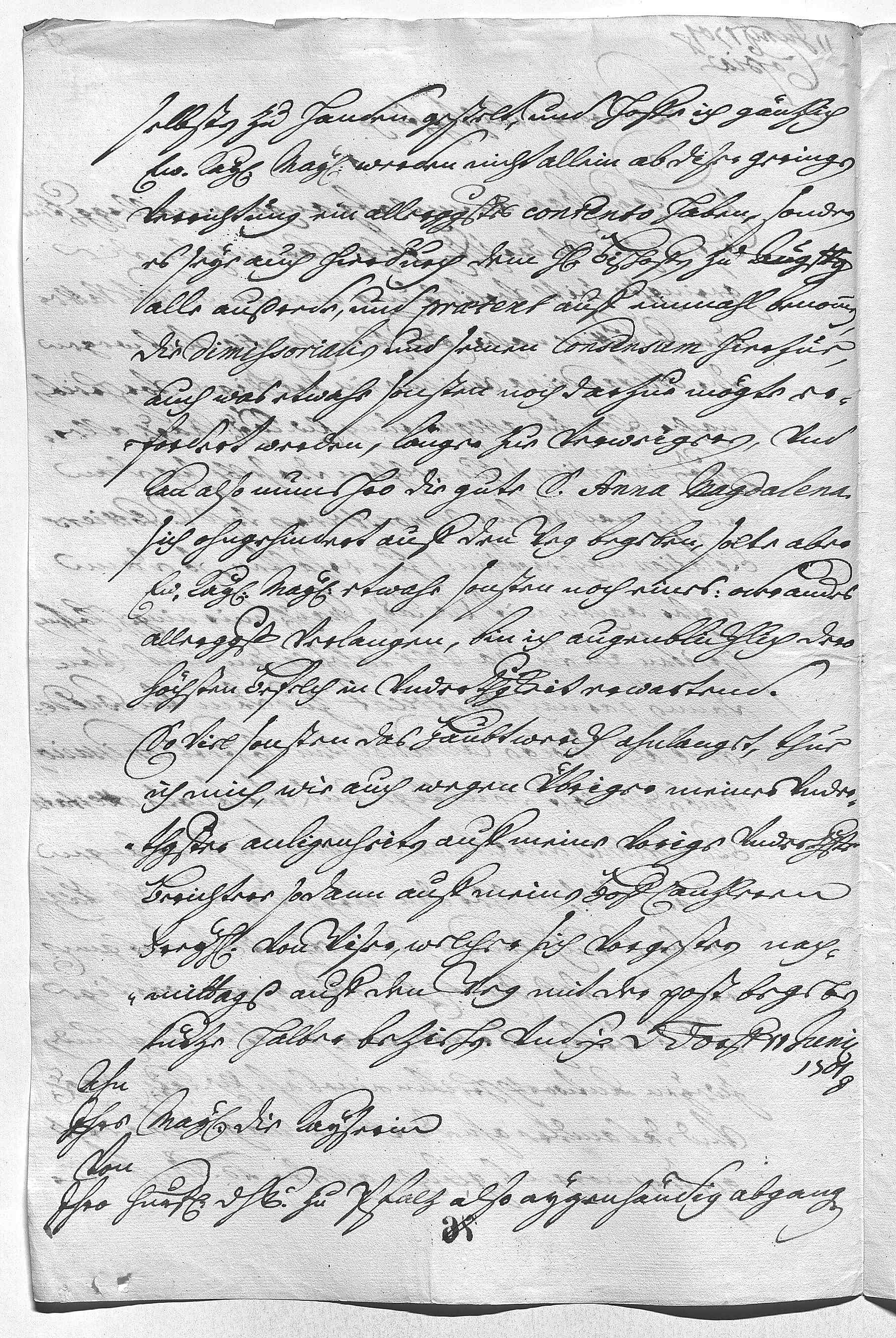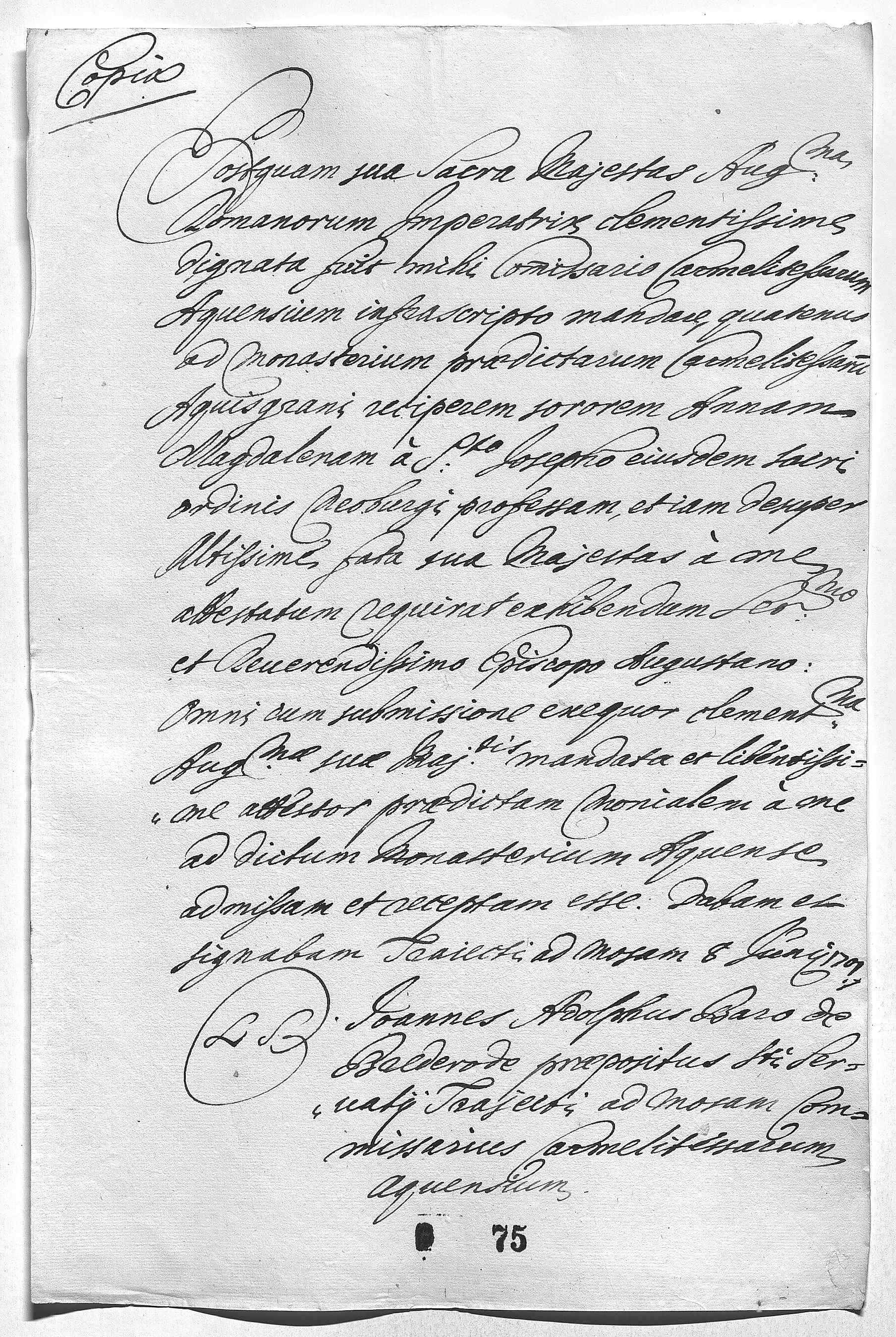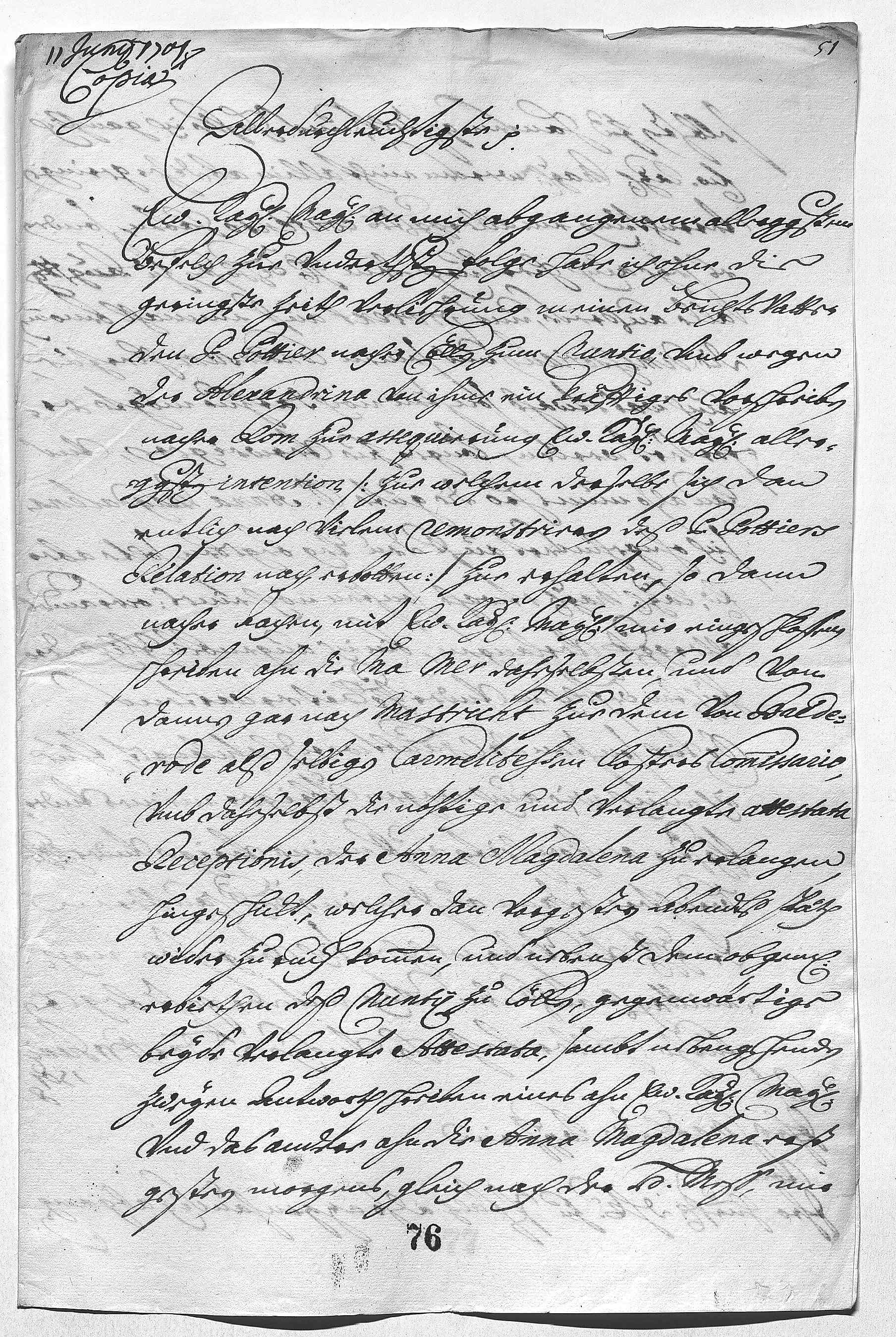JWs Beichtvater, Pater Pottier, konnte den Kölner Nuntius dazu überreden, wegen der (Nonne) Alexandrina nach Rom zu schreiben; von Köln ist er weiter nach Aachen und dann Maastricht gereist, um die gewünschten Atteste über die (Nonne) Anna Magdalena einzuholen. Hofft, dass damit der Bischof von Augsburg (Bruder Alexander Sigismund) keine Ausreden mehr hat, um seine Zustimmung zu verweigern. – Bezieht sich im Hauptwerk und wegen seiner übrigen Angelegenheiten auf seine früheren Schreiben und seinen Hofkanzler Freiherr von Wiser, der vorgestern (nach Wien) aufgebrochen ist.