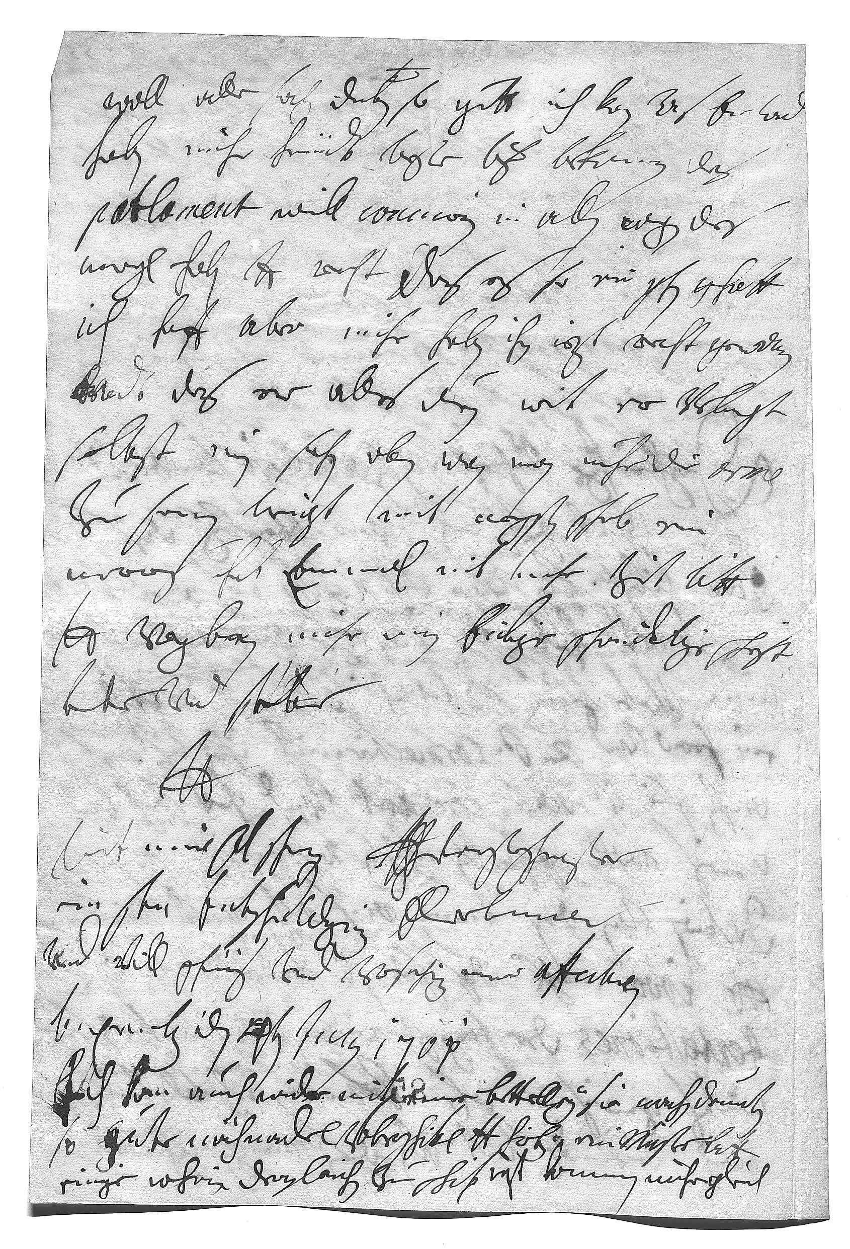 0014woll alle sach denken, so gutt ich kann. Aus England 0015haben mihr heündt beste brif bekomen, das 0016parlament will conueniren in allen. Wegen des 0017Margraven haben dero Liebden recht, das es so ein gten gehabtt, 0018ich hoff aber, mihr haben ihn iezt recht gewonen 0019vndt das er alles duen wirt. Er verlangt 0020selbst mein sohn oben, wan man nuhr die arme 0021zu samen bringt. Mit negsten schreib ein 0022merers, hab einmal nit mehr zeit. Bitt, 0023dero Liebden vergeben mihr mein eilige, schändlige schrift, 0024lebe vnd sterbe 0025dero Liebden 0026getrewste schwester 0027Eleonora 0028Laxenburg den 29ten junij 1701 0029Bit, mein fraw schwegerin 0030ein schen entschuldigung 0031vnd vill schöns auszurichten vnd versichere meine affection. 0032Ich kom auch wider mit einer betteley, sie machen drunten 0033so gute nähnadel, vberschike dero Liebden hirbey ein muster, bitt 0034einige whrin dergleichen zu schiken. Izt kommen nuhr gleich