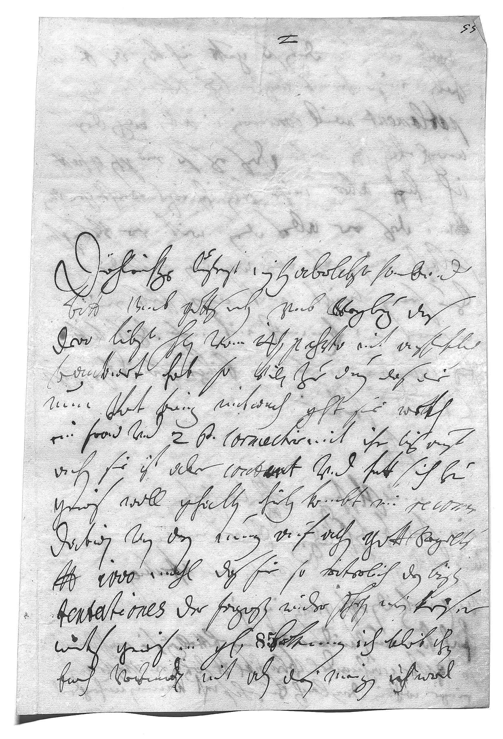 0001Dörchleüchtiger Curfürst, mein herz alerlibster herr bruder 0002Bitt vmb gotts wiln vmb vergebung, das 0003dero libste schreiben vom 14ten pasato nit ausführlich 0004beantwort, hab so vil zu duen, das die 0005nun vort bring. Mitwoch geht sie wekh, 0006ein fraw vnd 2 pater cormelitir mit ihr bis auf 0007Achen, sie ist aler content vnd hatt sich hir 0008gewis woll gehalten. Hirbey kombt ein recomen- 0009dation von den nunen auf Achen. Gott vergelts 0010dero Liebden 1000 mahl, das sie so riterlich den bösen 0011tentationes der franzoßen wider stehen, mein Keiser 0012wirts gewis in gnaden erkennen, ich bleib ihnen 0013ewich verbunden mit alen den meinigen. Ich werd
