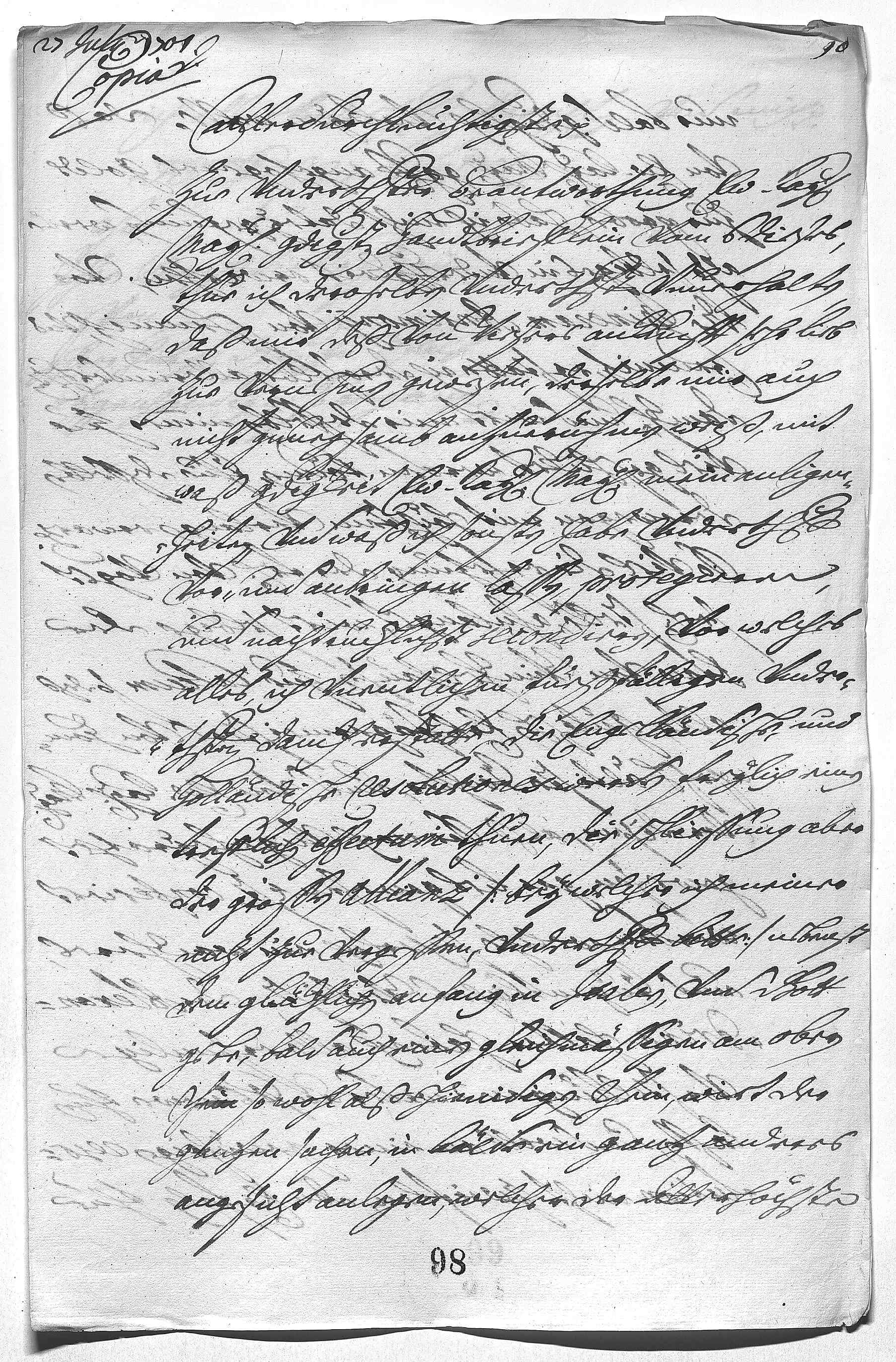 Der von Wiser ist zurück und rühmt, wie gnädig sich EMT um JWs Anliegen annimmt. – Die Große Allianz, der glückliche Anfang (des Feldzugs) in Italien und die hoffentlich bald ähnlichen Erfolge am Ober- und Niederrhein werden die Lage bald ganz anders aussehen lassen. – Erwartet mit Verlangen das Gold und das Antimon. – Die Frau von Winkelhausen zu Kalkum, Tochter des alten jülichschen Erbjägermeisters von Hompesch , wird Nachfolgerin auf der Stelle des Fräuleins von Voget . – Hat sich wiederum alle Mühe wegen der (Nonne) Alexandrina gegeben und wird den Erfolg berichten.