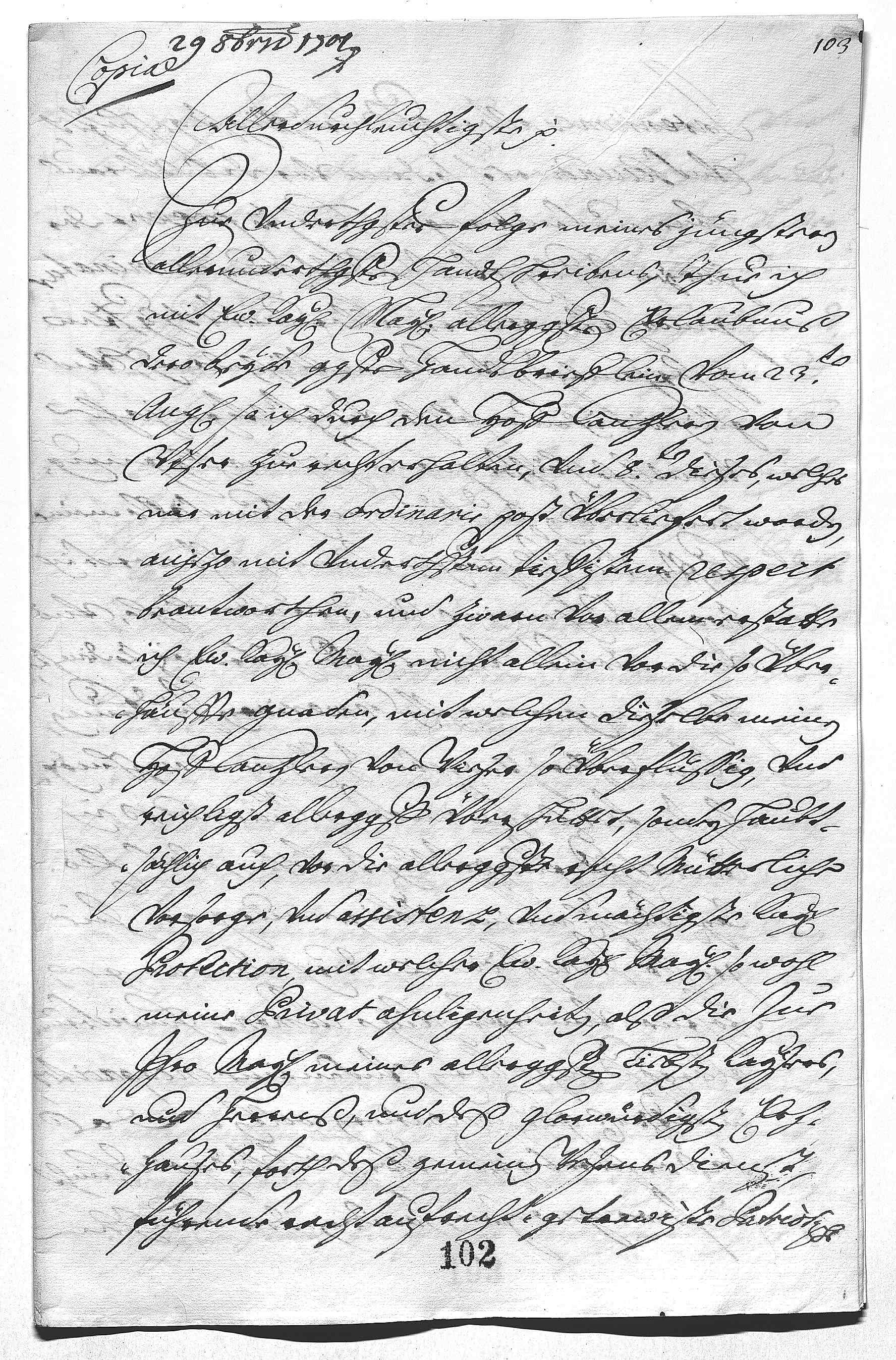 Dankt für EMTs mütterliche Fürsorge für seine „Privatangelegenheiten“, seine patriotischen Bestrebungen und für die beiden wunderschönen Miniaturbilder. – Dass die erste Goldprobe noch in keinem Feuer war, ist außergewöhnlich; hätte gerne mehr davon oder von dem siebenbürgischen Goldsand. Erwartet mit Verlangen das Antimon. – Hat bereits eine andere Sorte Nadeln bestellt. – Hat sich sehr über EMTs Bericht vom Jagdunfall des Kaisers erschreckt und dankt Gott, dass er wunderbarer Weise keinen Schaden genommen hat. – Auch in Ungarn, Italien und im Reich kann man klar erkennen, dass Gott mit dem Kaiser ist und noch Großes mit ihm vorhat. – EMT kann aus den Beilagen ersehen, was für ein „unmanierliches Plakat“ in den Kölner Gassen und an den Häusern des Herzogs von Sachsen(-Zeitz) und des (Domherrn von) Croy angebracht wurde. Der Kurfürst wirft sich den Franzosen blind in die Arme; man sollte ihn jetzt, wo es noch leicht geht, überwältigen und vor allem den (Kanzler) Karg festnehmen. JW bietet an, sich darum zu kümmern, obwohl Kurbayern ihm droht, in Neuburg einzufallen, falls er Kurköln angreift. – Es ist höchst notwendig, die treuen (Kölner) Domherren und Landstände vor Frankreich und dem Kurfürsten zu schützen, damit sie nicht kleinmütig werden. – Ist bestürzt, dass der (Hoch- und) Deutschmeister (Bruder Franz Ludwig) sich so widerwärtig aufführt, sowohl wegen der Steuern in Schlesien und durch seine Kanzler beim schwäbischen und fränkischen Kreis, als auch, weil er den (Philipp Benedikt) Forstmeister nicht abschaffen will. JW beklagt den Bruder, aber ist ihm auch feind, weil er dem Kaiser so wenig Treue erweist. EMT tut recht, ihm ungnädig zu sein. – Kann versichern, dass der Bischof von Osnabrück in Münster keine Aussichten hat. Die Zeit drängt, denn der Bischof (von Münster) ist todkrank, und wenn man dem nicht zuvorkommt, wird der Kurfürst von Köln gewählt. – Hofft, dass die kaiserlichen Truppen sich noch vor dem Winter des Herzogtums Mailand zumindest teilweise bemächtigen werden; dann könne man dem Papst wegen der Winterquartiere entgegenkommen, was auch hinsichtlich von dessen Haltung zur Sukzession in Spanien hilfreich wäre. Dankt für die freundliche Antwort auf seine Empfehlung des Grafen Philipp von Sinzendorf. – Erinnert an seine Empfehlung des Grafen Metternich zur Gracht, der sich beim letzten Landtag in Bonn höchst patriotisch für den Kaiser erklärt hat und dem nun von Kurköln Verfolgung droht. – Ist sehr erleichtert, dass Erzherzog Karl rasch genesen ist und hofft, dass der Römischen Königin (Amalie Wilhelmine) ihr Verlust bald durch einen gesunden Erzherzog ersetzt wird. – Die Vorgänge in Neapel waren wohl verfrüht; findet die Verhaftung des Duca di Moles vernünftig. – Erhält eben sichere Nachricht, dass der Kurfürst von Köln, der von den anrückenden holländischen Truppen erfahren hat, nun die Franzosen aufgefordert hat, sein Erzstift und die Städte Bonn, Rheinberg und Kaiserswerth zu besetzen . – Hat nie solche Kaisertreue gesehen wie beim Herzog von Sachsen(-Zeitz); schlägt ihn als möglichen Kandidaten für Münster vor.