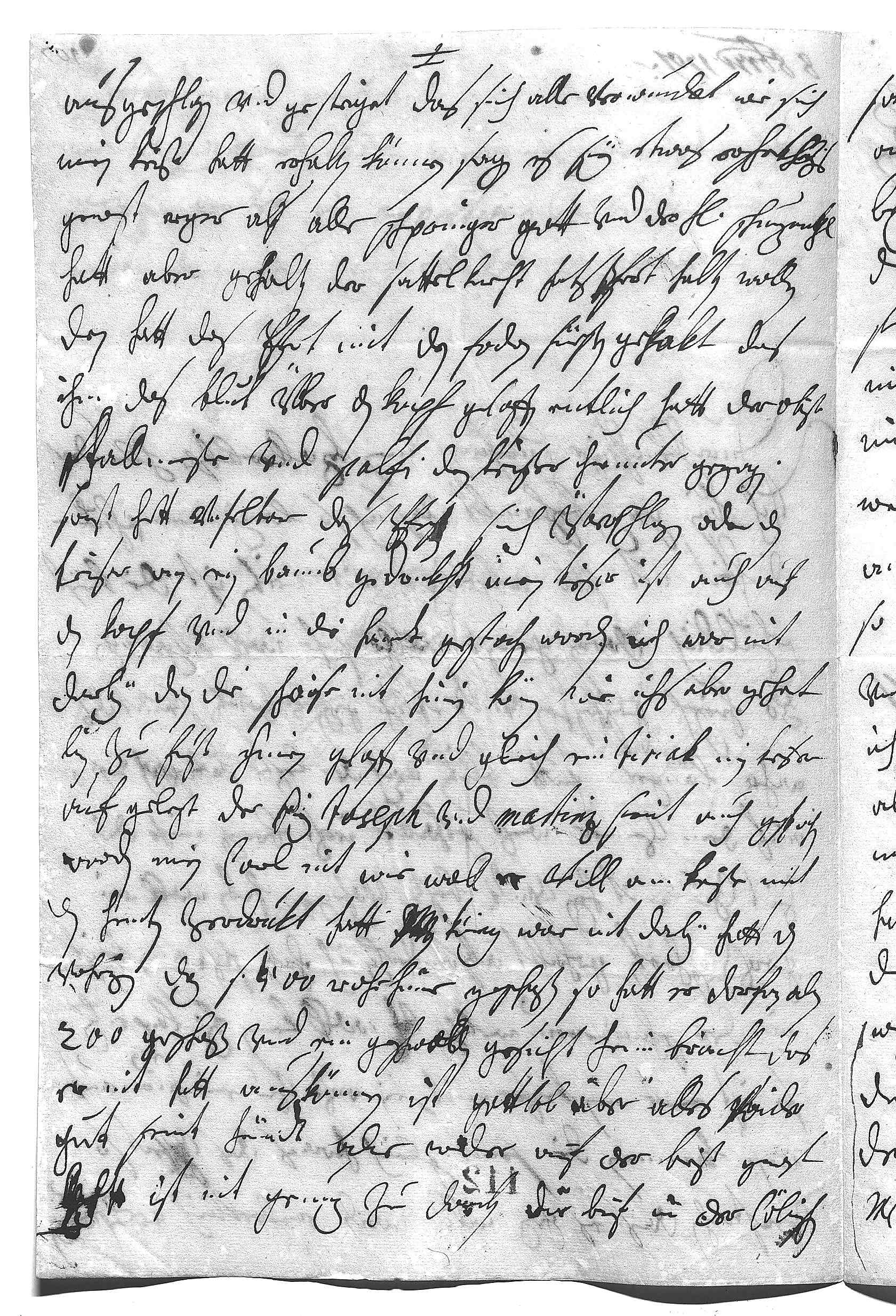 0015ausgeschlagen vnd gesteiget, das sich alle verwundert, wie sich 0016mein Keiser hatt erhalten können. Sagen, es sey etwas erschrekhligs 0017gewest, erger als alle schpringer, gott vnd der heilige schuzengl 0018hatt aber gehalten. Der sattelknecht hats pfert halten wollen, 0019den hatt das pfert mit den fodern füeßen gehakt, das 0020ihm das blut über den kopf geloffen. Entlich hatt der Obrist 0021Stallmeister vnd Palfi den Keißer herunter gezogen, 0022sonst hett vnfelbar das pfert sich überschlagen oder den 0023Keiser an ein baumb gedrukht. Mein Keiser ist auch auf 0024den kopf vnd in die handt gestochen worden. Ich war nit 0025darbey, dan die schaise nit hinein könen, wie ichs aber gehert, 0026bin zu fuß hinein geloffen vnd habe gleich ein tiriak mein Keiser 0027auf gelegt. Der Prinz Joseph vnd Martiniz seint auch gestochen 0028worden, mein Carl nit, wie woll er vill am Keiser mit 0029den henten zerdrukt hatt. Der König war nit darbey, hatt den 0030vohrigen dag 500 rohrhüner geschoßen, so hatt er darfon alein0031200 geschoßen vnd ein geschwollen gesicht heim bracht, das 0032er nit hatt auskönnen, ist gottlob aber alles wider 0033gut. Seint heündt aber wider auf der beiß gewest, 0034?? ist nit genug zu damln. Die brif in der cölnischen