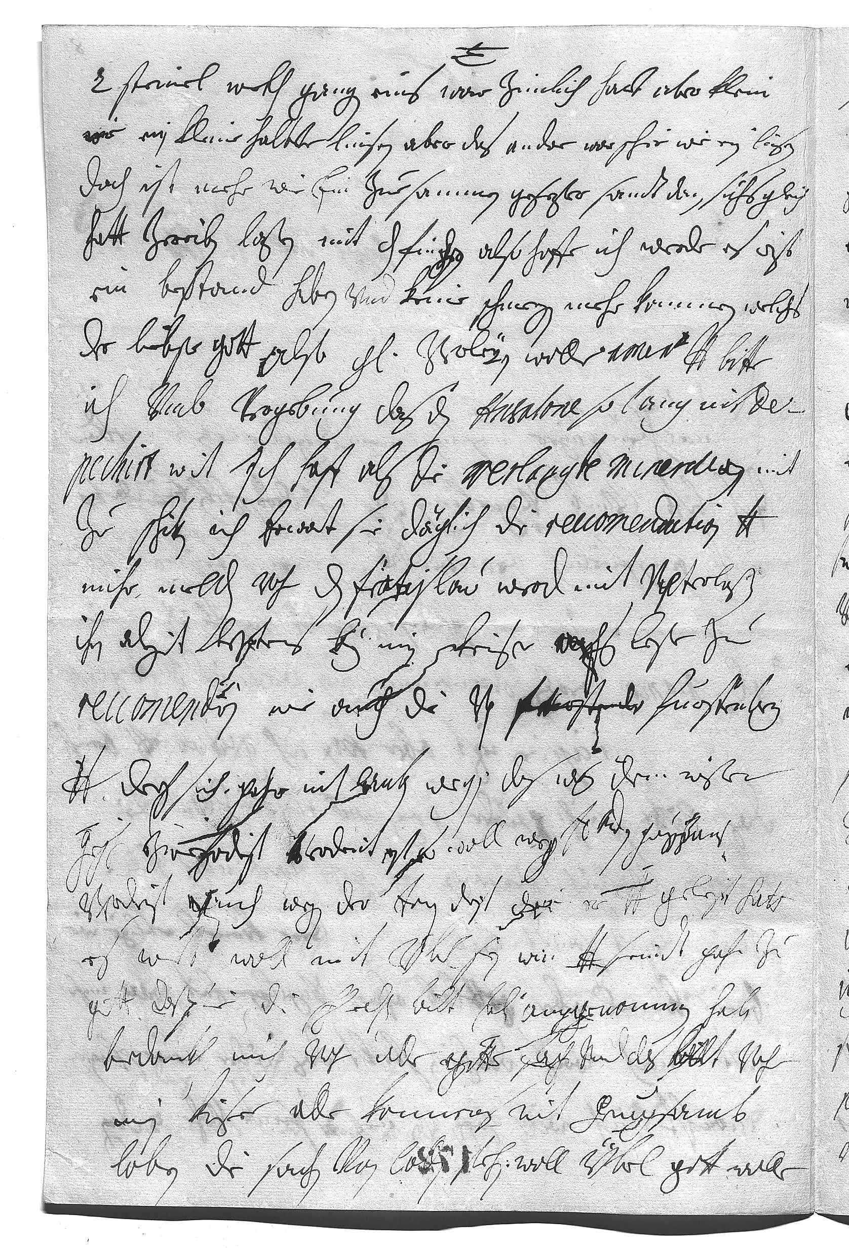 0001Durchleüchtiger Curfürst, mein herzallerliebster herr bruder 0002Ich bitt vmb vergebung, das ich dero schreiben bis dato 0003nit ausfürlich beantwortet, ist meins Keisers übel- 0004aufsein dran schuldich gewest. Wie dero Liebden von ihr Durchlaucht, meiner 0005geliebsten mama, werden vernommen haben, welche ich vnterdehnigst gebetten, 0006dero Liebden zu participiren. Izt aber kan ich gottlob dero Liebden berichten, 0007das ihr Mayestät sich wider ganz woll befinden vnd die 0008schmerzen vollich vergangen. Es geht woll noch vill 0009schleim vndt sandt wekh, auch großere körnel etlige wie 0010brein körnel, aber gottlob ohne vngelegenheit. Wan nuhr 0011nit noch was darhinten stekt, das wider newe schmerzen 0012macht, ich will hoffen von nein. Es seint vohr 3 dagen