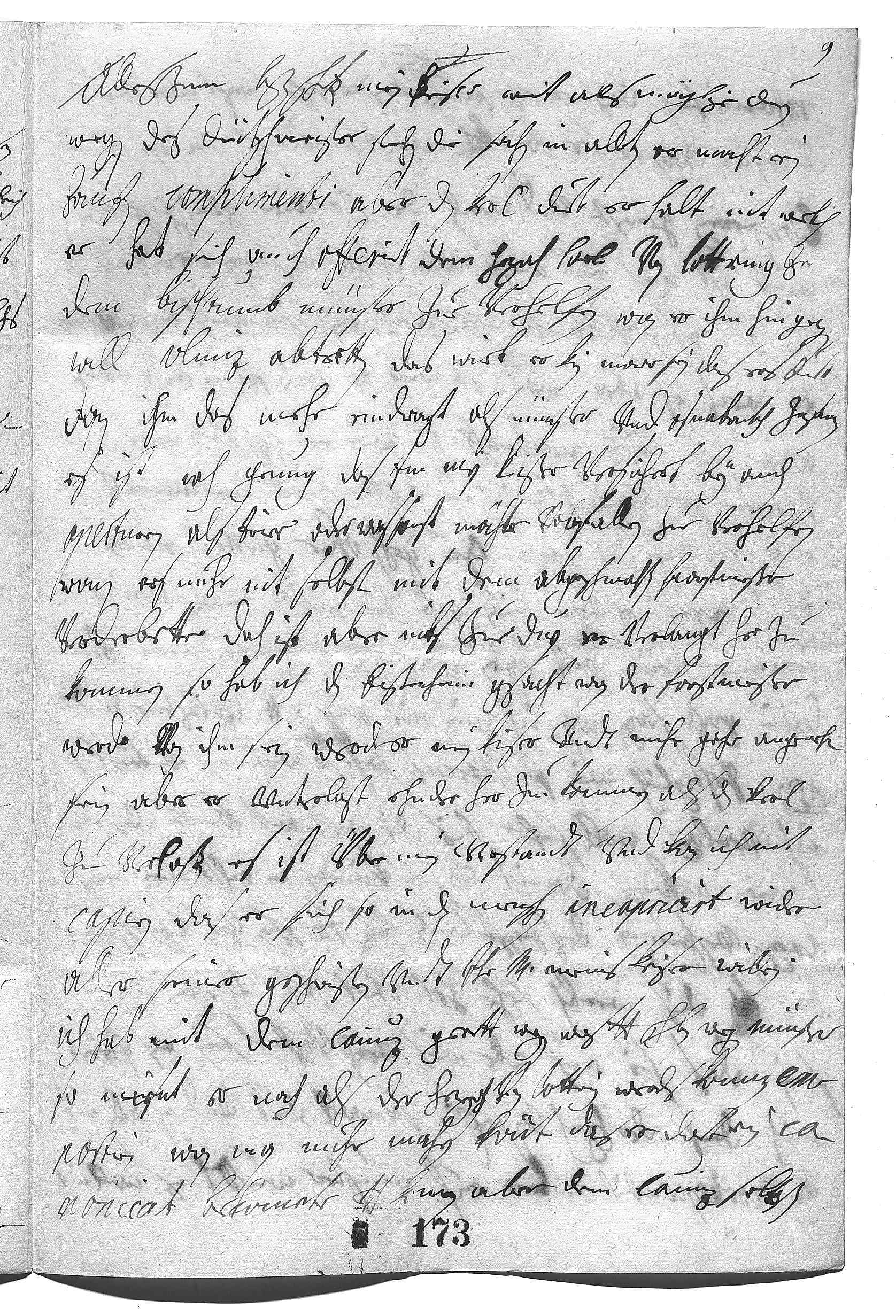 0054informihren, das er es mein Keiser vohr dragt oder durch 0055den Wißer, wan er her kombt. Wegen der cölnischen sach ist heüdt 0056conferenz gewest, vnd werden die courir gleich geschikt. 0057Mihr ist auch recht angst vohr den Herzoch von Saxen, der Curfürst 0058von Cölln oder villmehr der Cardinal laßen ihm auch aufpaßen, 0059er weis es aber woll, so wirt er sich schon in acht nemen. 0060Aber ich bitt nachmahlen dero Liebden wie im gestrigen schreiben mit dem 0061courir gebetten hab, sich in acht zue nemmen vndt 0062nie so auf die iacht zu gehen ohne gutte conuoy, 0063ich befehl es dem liben gott, der wirt dero Liebden bewaren. Werd alle 0064fromme leüt betten laßen, das gott dero Liebden bewaren wolle, bin 0065dah in großen sorgen, wan ich mich nit auf gott verlaßete vnd 0066ganz vestiglich, wie Pater Marcus sacht, so wehr ich vntröstlich. 0067Ich verlang woll sehr, bis die anwort kombt, das der 0068courir ankomen, damit dero Liebden sich können in acht nemmen. 0069Wegen verschonung des papstlande haben ihr Mayestät schon zu verstehen geben, 0070das dero Liebden dis werkh sehr solicitirt haben, dero Liebden kan versichert 0071sein, das sie auf alle weis werden verschonet sein. Es freüt 0072mich, das der Herzoch von Saxen so woll duet vnd in allen mit 0073dero Liebden correspondirt, aber auf Munster wurdt es woll nit