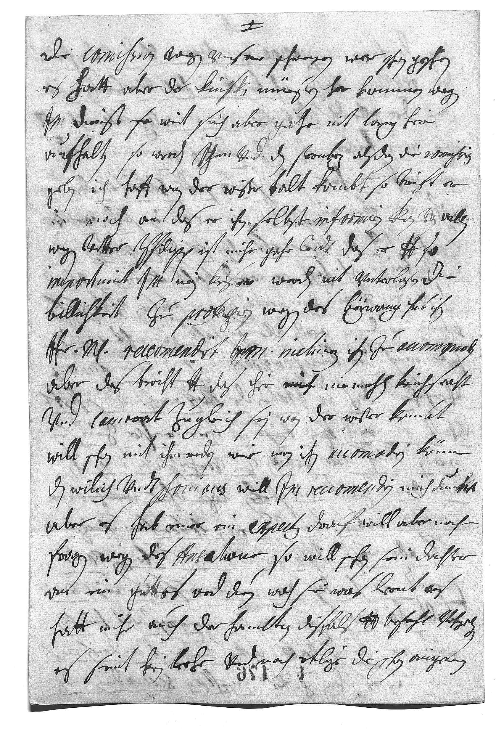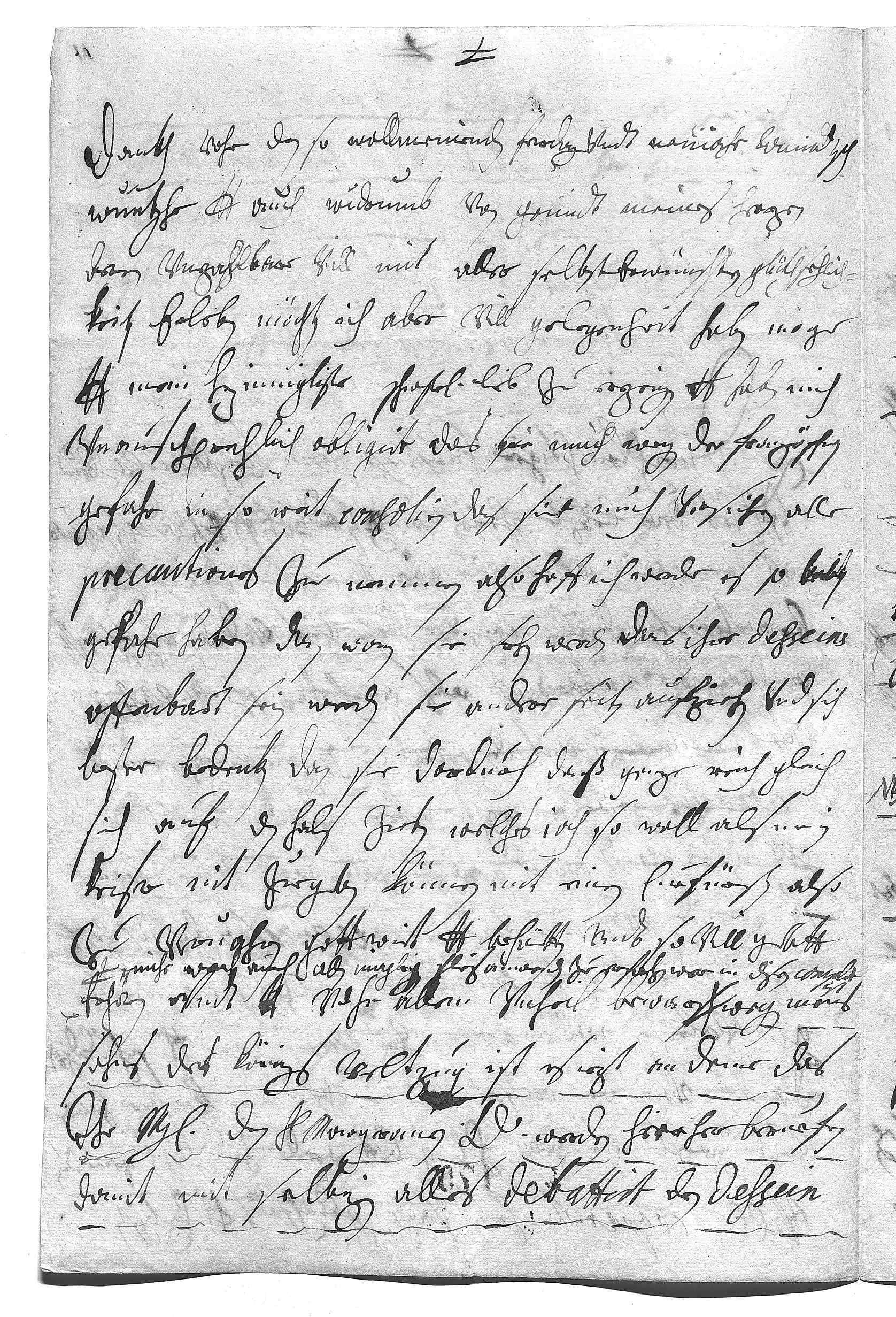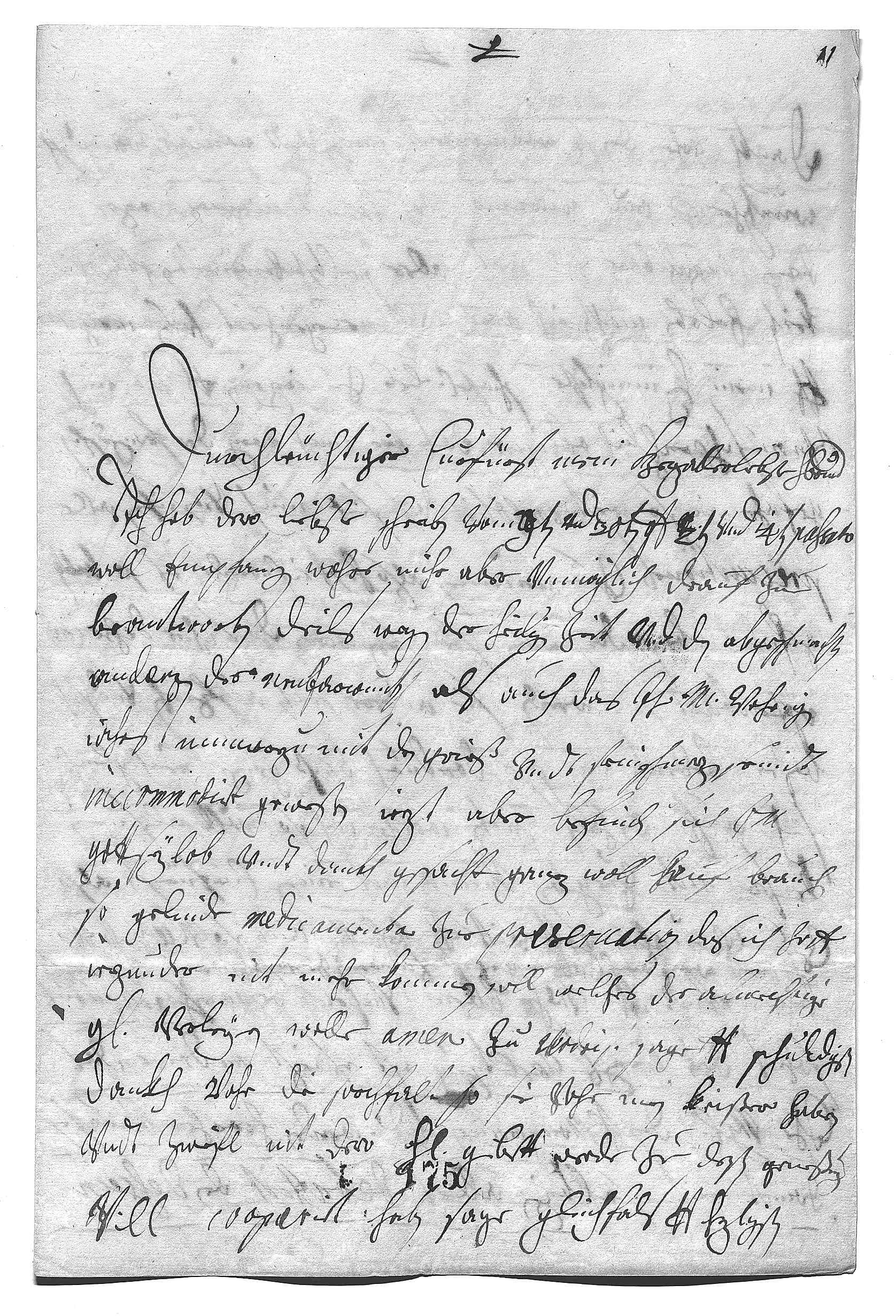 0001Durchleüchtiger Curfürst, mein herzallerliebster herr bruder 0002Ich hab dero liebste schreiben vom 9ten vnd 30ten novembris, 2ten vnd 14ten passato 0003woll empfangen. Wahre mihr aber vnmöglich drauf zum 0004beantworten, deils wegen der heiligen zeit vnd den abgeschmachten 0005audienzen der neujarwuntsch als auch, das ihr Mayestät vohrigen 0006iahrs immerzu mit den grieß vndt steinschmerzen seindt 0007inccommodirt geweßen, iezt aber befinden sich ihr Mayestät 0008gottsey lob vndt dankh gesacht, ganz woll auf, brauchen 0009so gelinde medicamenta zur preseruation, das ich hoff, dass es0010iezunder nit mehr kommen will, welches der almechtige 0011gnädig verleyen wolle, amen. Zu vodrist sage dero Liebden schuldigsten 0012dankh vohr die sorchfalt, so sie vohr mein Keißer haben, 0013vndt zweifl nit, dero heiliges gebett werde zu deßen geneßung 0014vill cooperirt haben. Sage gleichfals dero Liebden herzligsten