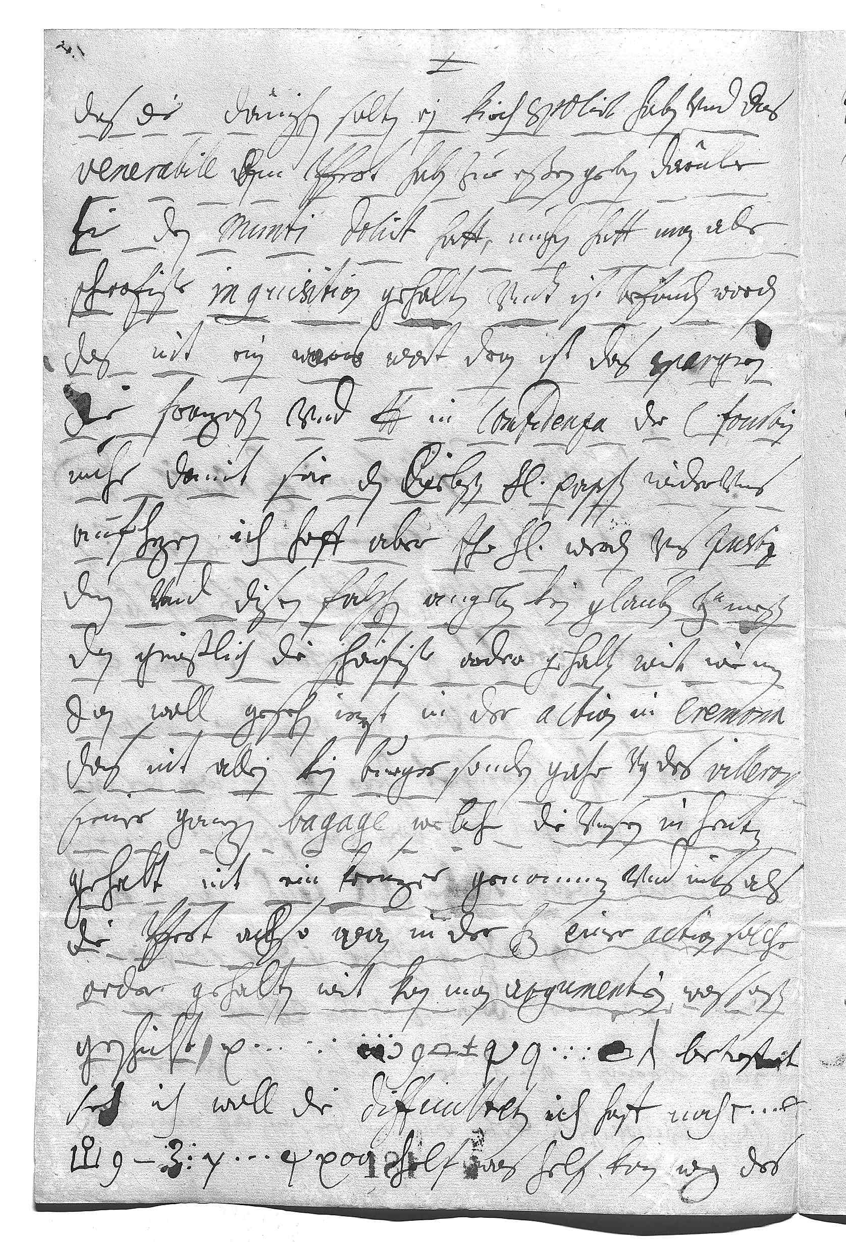 0013das die dänischen solten ein kirch spolirt haben vnd das 0014venerabile dem pfert haben zue eßen geben, darüber 0015hie den Nunti dolirt hatt. Nuhn hatt man alle 0016scherfiste inquisition gehalten vndt ist befunden worden, 0017das nit ein wares wort dran ist, das spargiren 0018die franzosen vnd, dero Liebden in confidenza, der C Fourtin 0019nuhr, damit sie den liebsten heiligen Papsten wider vns 0020aufhezen. Ich hoff aber, ihr Heiligkeit werden vns justiz 0021duen vnd disen falschen angeben kein glauben beymeßen, 0022dan gewißlich die schärfiste order gehalten wirt, wie man 0023dan woll gesehn iezt in der action in Cremona, 0024das nit allein kein burger, sondern gahr von des Villeroy 0025seiner ganzen bagage, welche die vnsren in henten 0026gehabt, nit ein kreuzer genommen vnd niks als 0027die pfert. Also wan in der hiz einer action solche 0028ordre gehalten wirt, kan man argumentirn, was sonsten 0029geschicht. Die Starenberg betrefent, 0030seh ich woll die difficulteten, ich hoff noch, hir0031was zu finden, helf was helfen kan. Wegen des