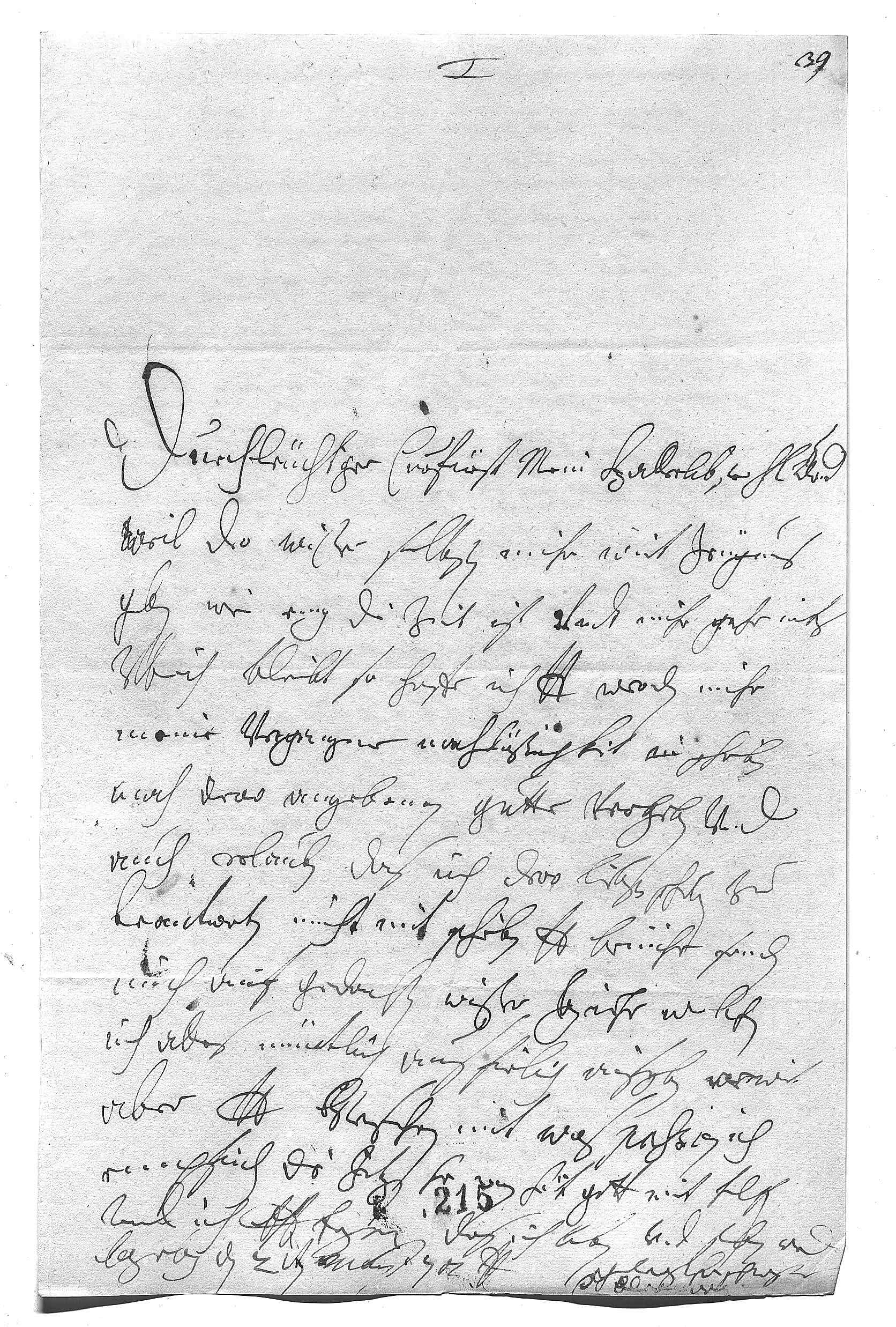 0001Durchleüchtiger Curfürst, mein herzallerlibster herr bruder 0002Weil der Wißer selbsten mihr wirt zeügnus 0003geben, wie eng die zeit ist, vndt mihr gahr niks 0004vbrich bleibt, so hoffe ich, dero Liebden werden mihr 0005meine vergangene nachläßichkeit in schreiben 0006nach dero angebornen gutte vergeben vnd 0007auch erlauben, das ich, dero liebsten schreiben zue 0008beantworten, nicht mit schreiben dero Liebden bemühe, sondern 0009mich auf gedachten Wißer beziehe, welchen 0010ich alles müntlich ausfürlich aufgeben. Er wirt 0011aber dero Liebden versichren, mit was passion ich 0012empfinden die zeitungen, so man hört, gott wirt helfen 0013und ich dero Liebden fgm, das ich leben vnd sterben werd 0014dero Liebden 0015getrewste schwester 0016Eleonora 0017Laxenburg den 21ten maij 1702