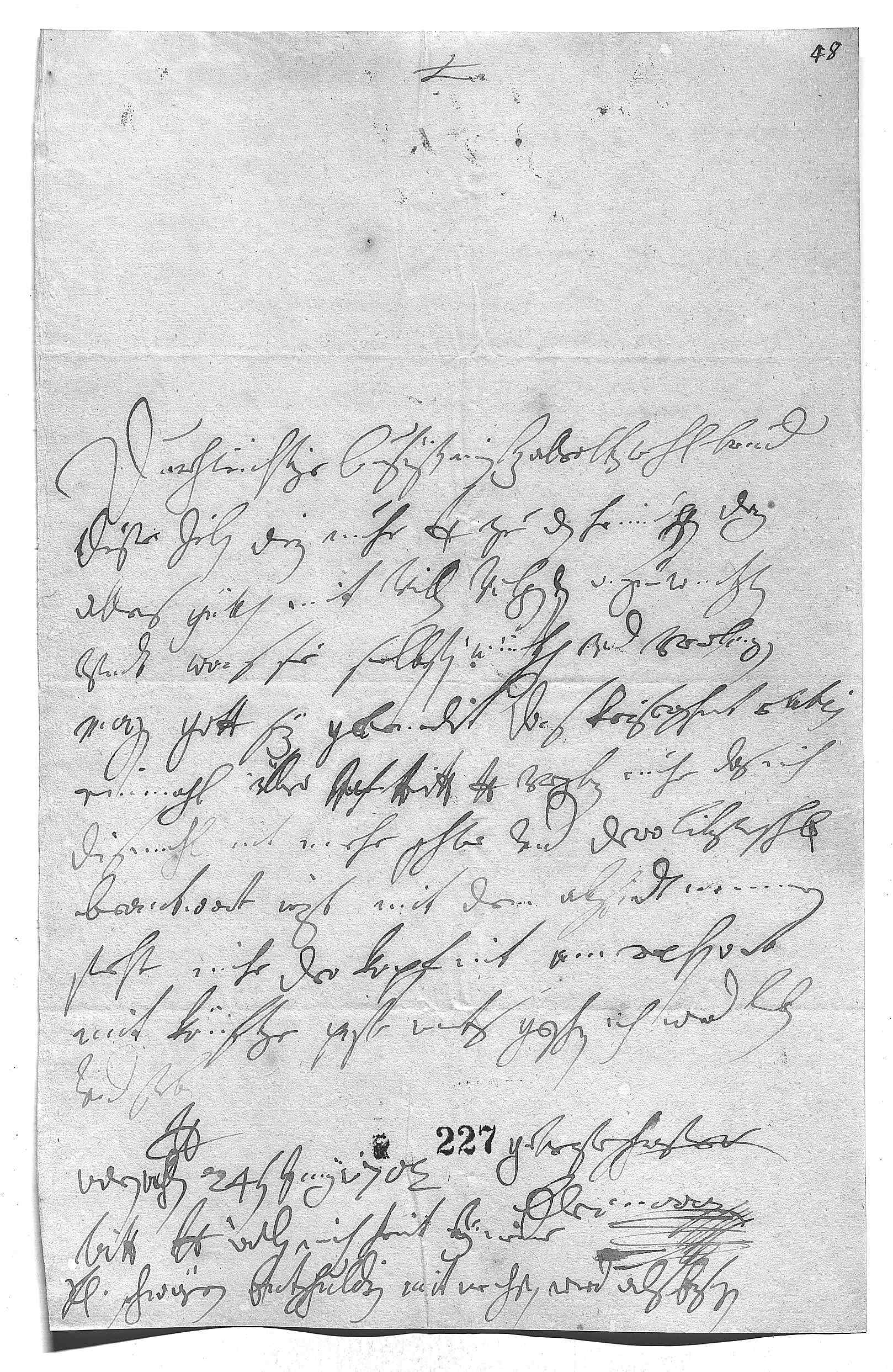 0001Durchleüchtiger Curfürst, mein herzallerlibster herr bruder 0002Dise zeilen dienen nuhr, dero Liebden zu den heinthigen dag 0003alles glükh mit villen volgenden anzuwuntschen 0004vndt was sie selbsten wüntschen vnd verlangen 0005mogen. Gott sey gebenedeit, das Keiserschwert entlich0006einmahl über has tritt. Dero Liebden vergeben mihr, das ich 0007dismahl nit mehr schreibe vnd dero libste schreiben 0008beantwort, iezt mit dem abschiedt nemmen 0009steht mihr der kopf nit am rechten ort, 0010mit könftiger post wirts geschen. Ich werd leben 0011vnd sterben 0012dero Liebden 0013getrewste schwester 0014Eleonora 0015Laxenburg 24ten junij 1702 0016Bitt, dero Liebden wolen mich heint bey meiner 0017fraw schwägrin entschuldigen, mit nechsten werd als ersezen.