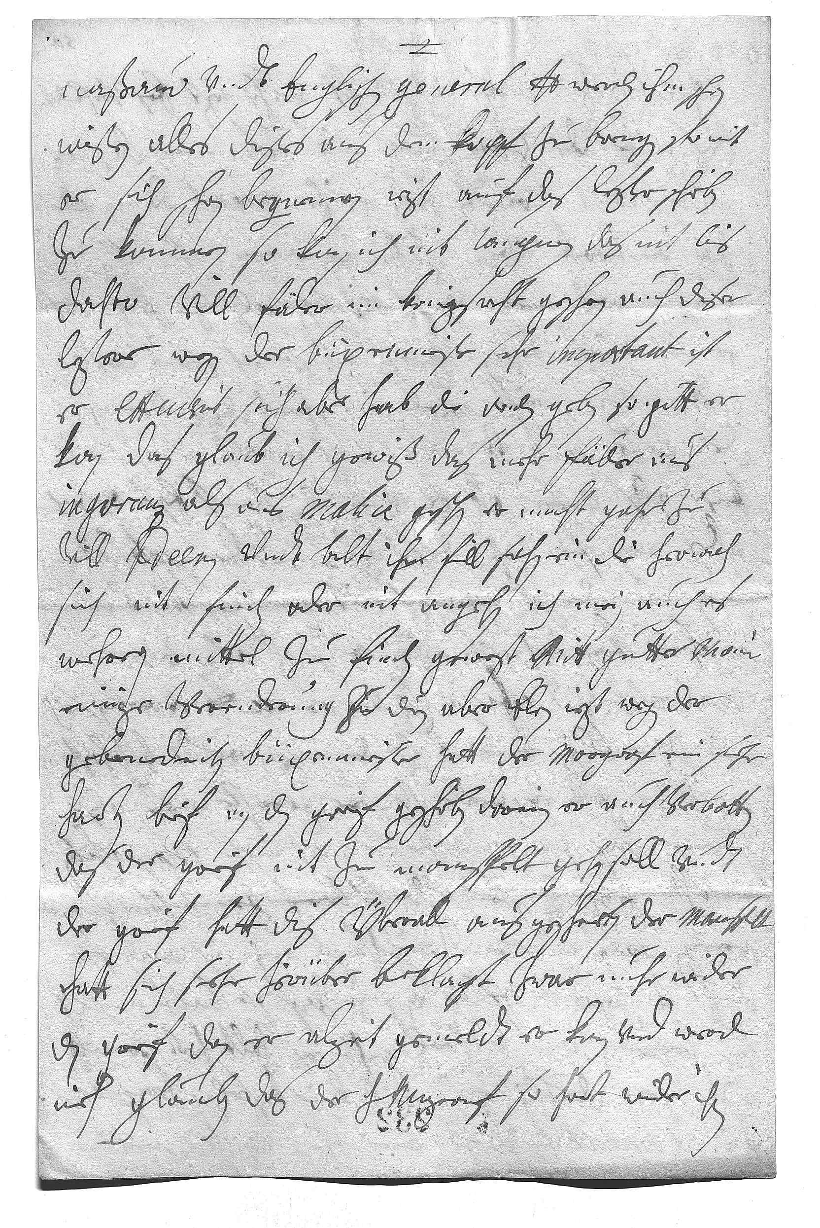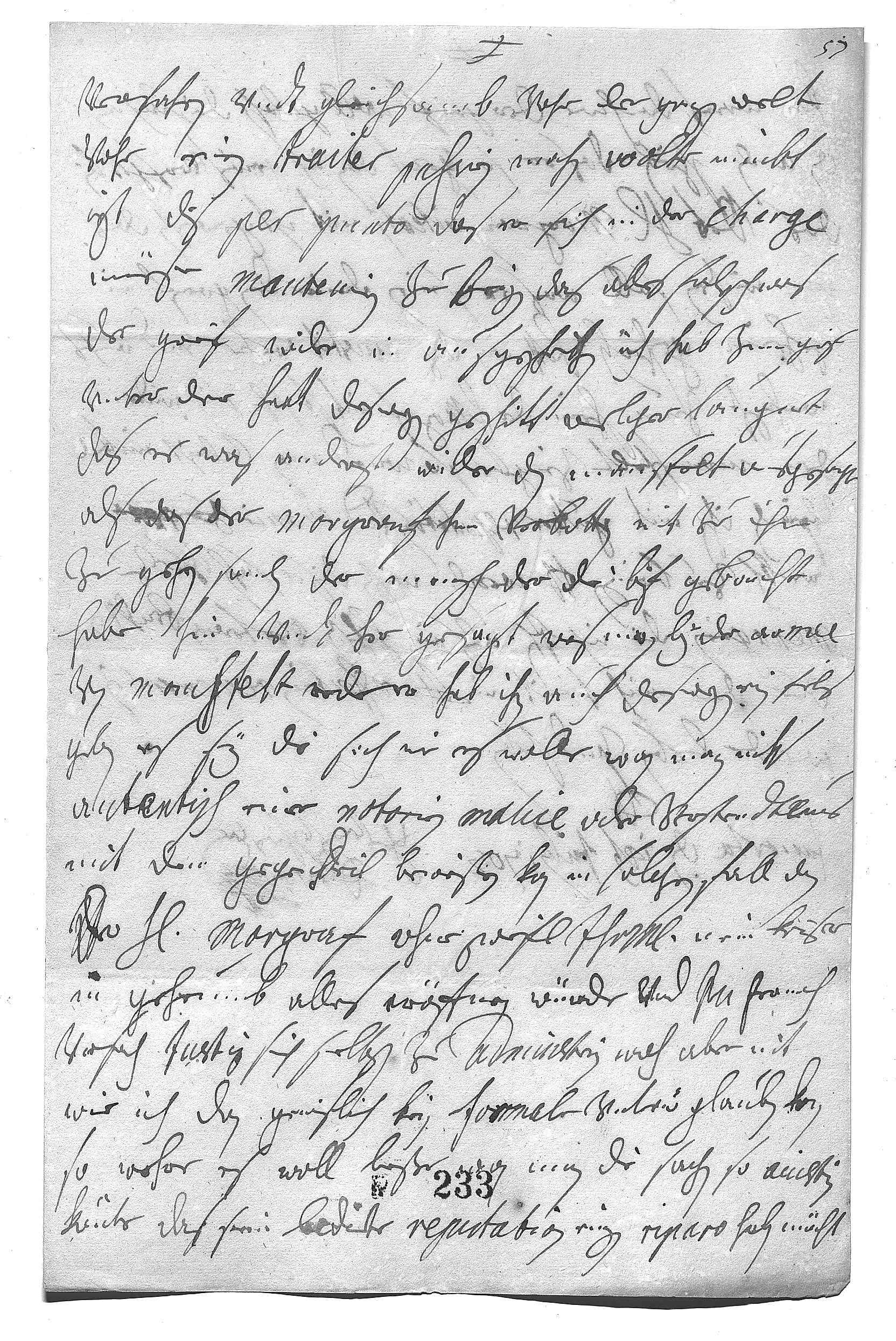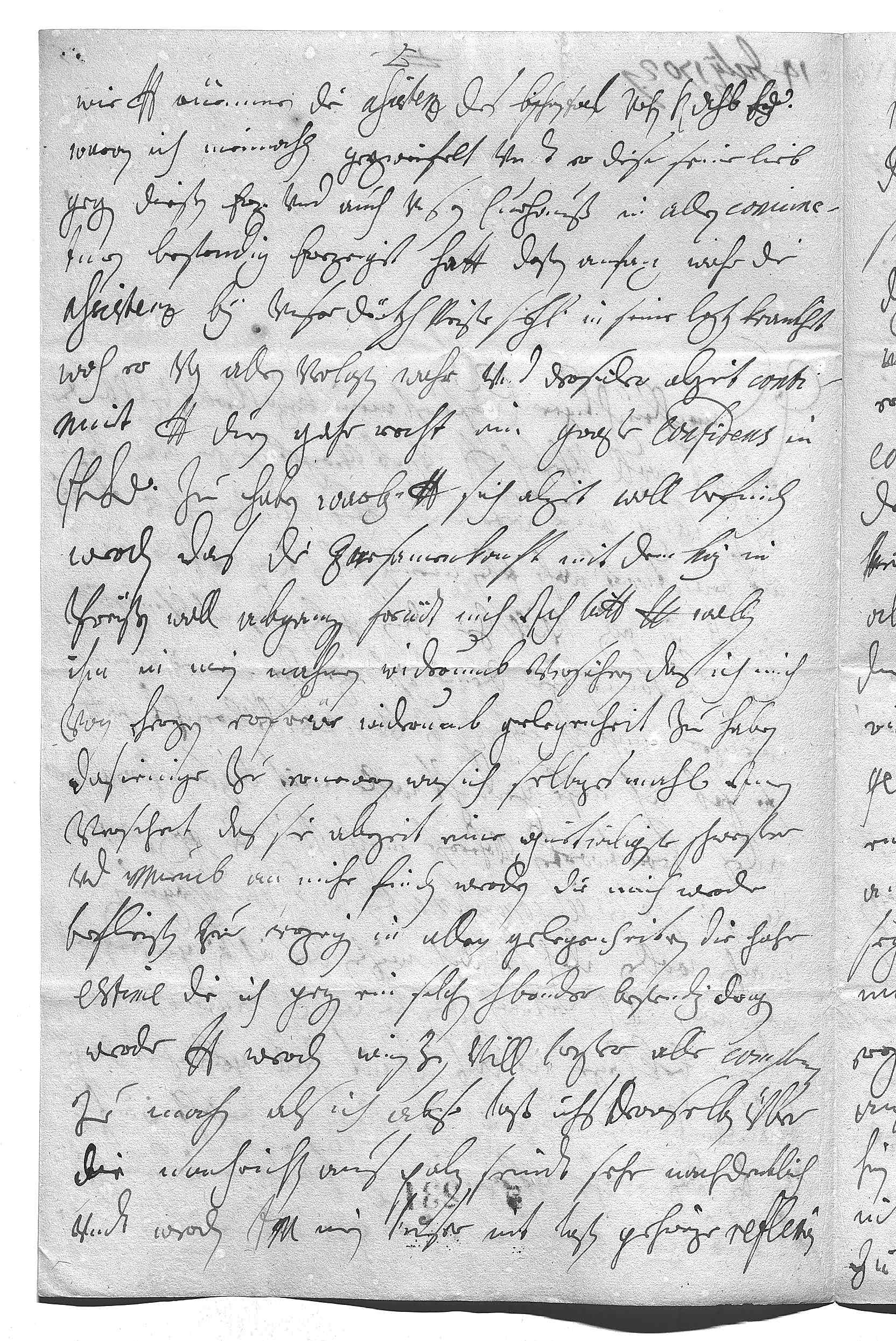 0061Naßaw vndt englischen General, dero Liebden werden ihm schon 0062wißen alles dises aus dem kopf zu brengen, so wirt 0063er sich schon bequemen. Iezt auf das lezter schreiben 0064zu kommen, so kann ich nit laugnen, das nit bis 0065dahto vill fäler im krigsraht geschen, auch diser 0066leztere wegen der büxemeister sehr important ist, 0067er excusirt sich aber, er hab die ordnung geben so gutt er 0068kan. Das glaub ich gewiß, das mehr fäller aus 0069ingoranz als aus malice geschen, er macht gahr zu 0070vill ideen vndt bilt ihm fill sachen ein, die hernach 0071sich nit finden oder nit angehn. Ich mein auch, es 0072wehren mittel zu finden gewest, mitt gutter manir 0073einige verenderung zu duen, aber eben iezt wegen der 0074gebenedeiten büxenmeister hatt der Morgraf ein sehr 0075harten brif an den Greif geschriben, darine er auch verbotten 0076das der Greif nit zu Mansfelt gehn soll, vndt 0077der Greif hatt dis überall ausgeschrien. Der Mansfelt 0078hatt sich sehr hirüber beklagt, zwar nuhr wider 0079den Greif, dan er alzeit gemeldt, er kan vnd werd 0080nieh glauben, das der herr Margraf so hart wider ihn