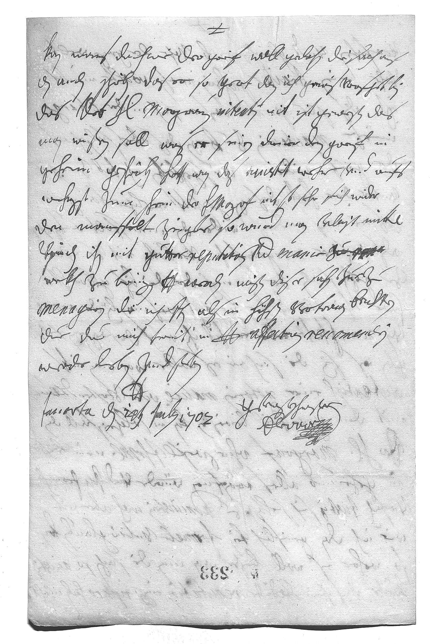 0101kan mans doch, wie der Greif woll gedahn, die sach auf 0102den andern schieben, das er so geret, dan ich gewis versichert bin, 0103das des herrn Morgrauen intention nit ist gewesen, das 0104man wißen soll, was er seinen diener, dem Greif, in 0105geheim geschriben hatt. Wan das auistirt wehre vnd aufs 0106wehnigst zum schein der herr Margraf nit so sehr sich wider 0107den Mansfelt zeigete, so wurd man vleist mittel 0108vinden, ihn mit gutter reputation vnd manir zu ?? 0109wekh zu bringen, dero Liebden werden wisen diser sachen zue zu 0110menagiren, die ich ihnen als in höchsten vertrawen berichten 0111due. Due mich hirmit in dero Liebden affection reccomendiren, 0112werde leben vnd sterben 0113dero Liebden 0114getrewste schwester 0115Eleonora 0116Fauorita den 14ten julii 1702
