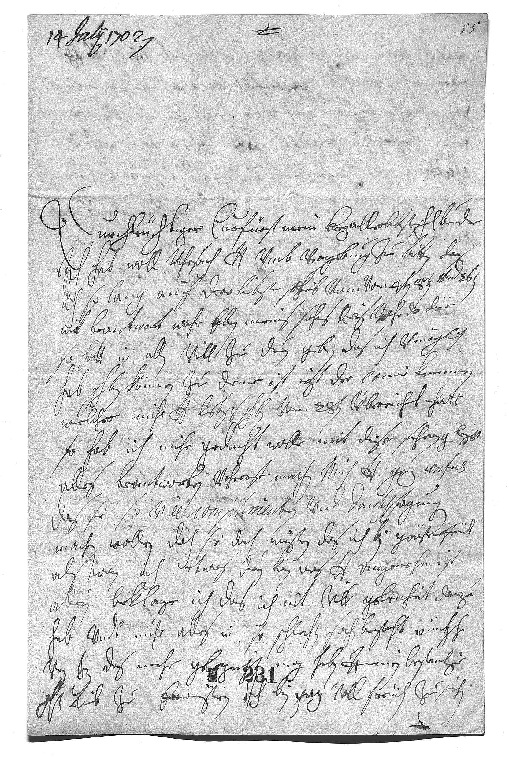 000114 julij 17020002Durchleüchtiger Curfürst, mein herzallerlibsten herr bruder 0003Ich hab woll vhrsach, dero Liebden vmb vergebung zu bitten, das 0004ich so lang auf dero libste schreiben vom vom 4ten, 8ten vnd 26ten 0005nit beantwort, wahr eben meins sohns reis vohr der dür, 0006so hatt in allen vill zu duen geben, das ich vnmöglich 0007hab schreiben können. Zu deme ist jezt der courir kommen, 0008welcher mihr dero Liebden libsts schreiben vom 28ten übereicht hatt, 0009so hab ich mihr gedacht, wolle mit diser schenen gelegeheit 0010alles beantworten. Vohrerst machen mich dero Liebden ganz confus, 0011das sie so vill complimenten vnd dankhsagungen 0012machen wollen, dah sie doch wißen, das ich kein größere freüt habe, 0013als wan ich etwas duen kan, was dero Liebden angenehm ist. 0014Allein beklage ich, das ich nit vill gelegenheit dazu 0015hab vndt nuhr alles in so schlechten sachen besteht, wüntsch 0016von herzen, das mehr gelegenheit mag haben, dero Liebden mein bestendige 0017schwesterliche lib zu erweisen. Ich bin ganz voll freuden zu sehn,