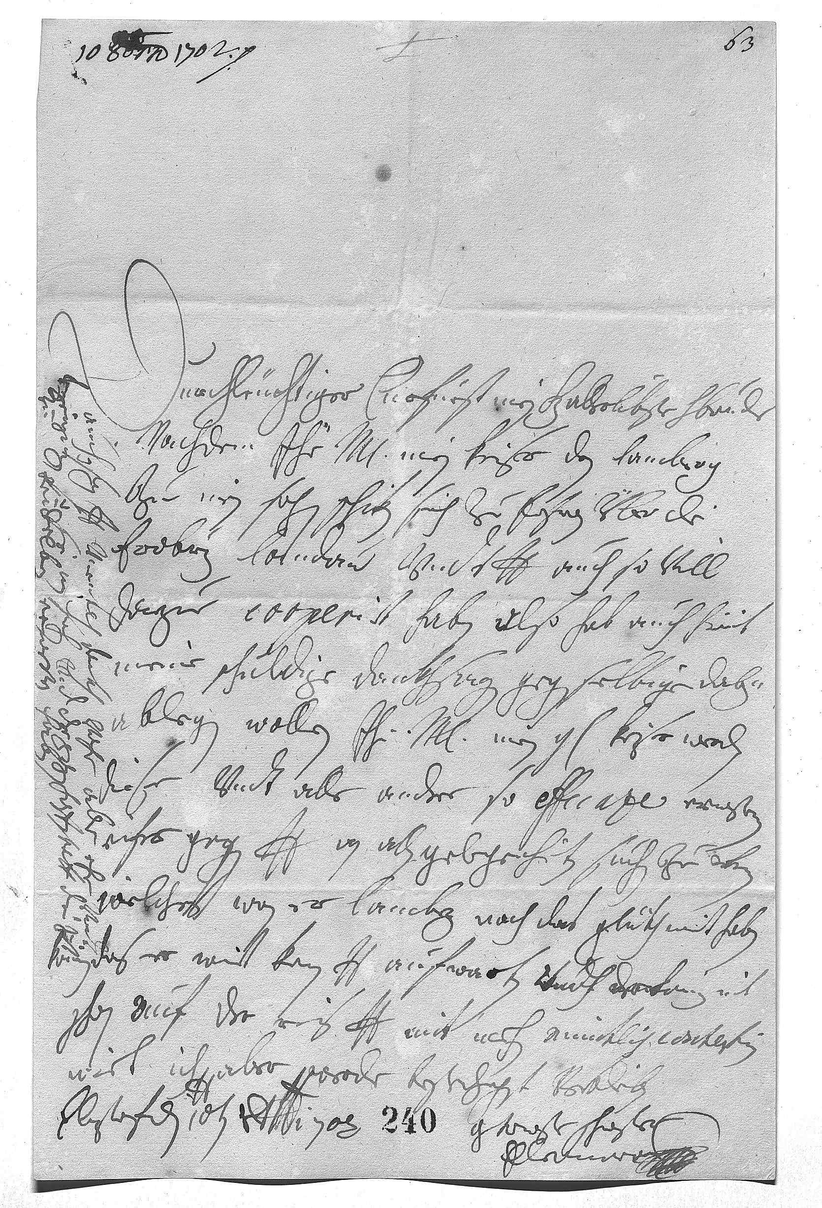 000110 octobris 17020002Durchleüchtiger Curfürst, mein herzallerlibster herr bruder 0003Nachdem ihr Mayestät, mein Keiser, den Lamberg 0004zu mein sohn schiken, sich zu erfreyen über die 0005eroberung Landau vndt dero Liebden auch so vill 0006darzue cooperirt haben, also hab auch hiemit 0007meine schuldige dankhsagung gegen selbige dabey 0008ablegen wollen. Ihr Mayestät, mein gnädigster Keiser, werden 0009diese vndt alle andere so efficaze erwisenen 0010eifer gegen dero LIebden an allen gelegenheiten suchen zu erkennen, 0011welches, wan er Lamberg nach das glükh wirt haben 0012können, das er wirt kenen dero Liebden aufwarten vndt der Konig nit 0013schon auf der reis, dero Liebden mit mehren einiklich contestiren 0014wirt. Ich aber werde bestendichst verbleiben 0015dero Liebden 0016getrewste schwester 0017Eleonora 0018Eberstorf 10ten octobris 1702 00191Auch sag dero Liebden vnentlich dankh vohr alle ehr vndt 0020bezeügung, so sie mein sohn vnd der ganzen hoffstatt die zeit 0021zu Heidelberg erwisen haben.