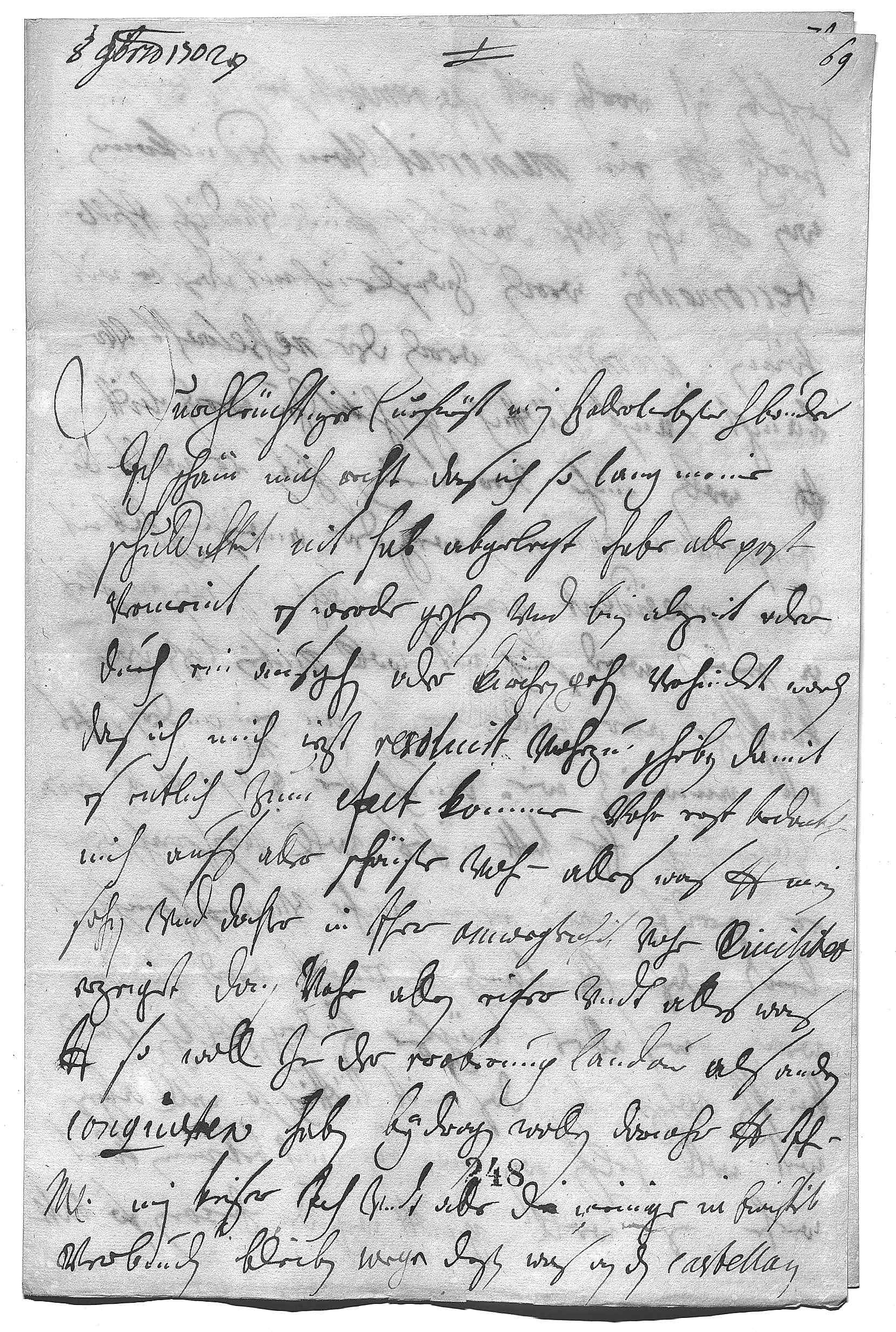 00018 novembris 17020002Durchleüchtiger Curfürst, mein herzallerliebster herr bruder 0003Ich schäm mich recht, das ich so lang meine 0004schuldichkeit nit hab abgelegt. Habe alle post 0005vermeint, es werde geschen, vnd bin alzeit oder 0006durch ein ausgehn oder kirchengehn verhindert worden, 0007das ich mich izt resoluirt habe vohrzu schreiben, damit 0008es entlich zum efect komme. Vohr erst bedankh 0009mich aufs aller schönste vohr alles, was dero Liebden mein 0010sohn vnd dochter in ihrer anwesenheit vohr ciuilitet 0011erzeiget, dan vohr allen eifer vndt alles, was 0012dero Liebden so woll zu der eroberung Landau als andren 0013conquisten haben beydragen wollen, daruohr dero Liebden ihr 0014Mayestät, mein Keiser, ich vndt alle die meinige in ewichkeit 0015verbunden bleiben. Wegen deßen was an den Castellan