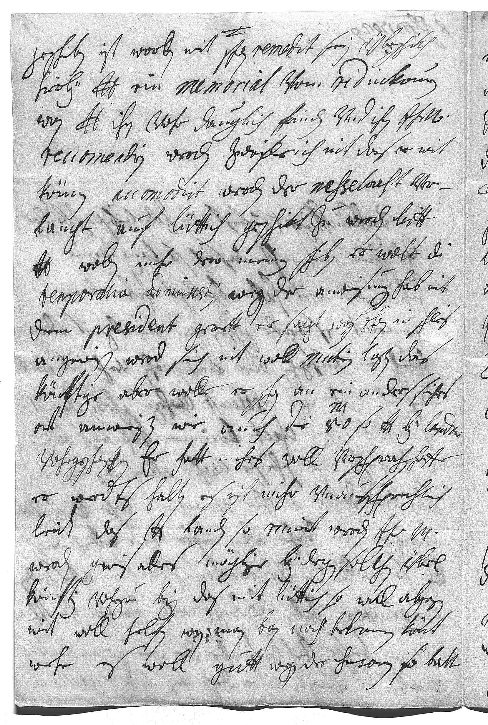 0016geschriben ist worden, wirt schon remedirt sein. Überschikh 0017hierbey dero Liebden ein memorial vom Ridinkouen, 0018wan dero Liebden ihn vohr dauglich finden vnd ihn ihr Mayestät 0019reccomendirn werden, zweifle ich nit, das er wirt 0020können accomodirt werden. Der Nesselraht ver- 0021langt auf Lüttich geschikt zu werden, bitt, 0022dero Liebden wollen mihr dero meinen schreiben, er wolt di 0023temporalia adminstrirn. Wegen der anweisung hab mit 0024dem President gerett, er sagt, was schon in Schleis 0025angewisen, werd sich nit woll mutiren laßen, das 0026könftige aber wolle er schon an ein anders sichers 0027ort anweißen wie auch die 80000, so dero Liebden bey Landau 0028vohrgeschoßen. Er hatt mihrs woll verschprochen, hoffe, 0029er werdts halten. Es ist mihr vnauschprechlich 0030leidt, das dero Liebden landen so runirt werden, ihr Mayestät 0031werden gwis alles möglige bey dragen, solchen übel 0032könftig vohrzu beugen. Das mit Lüttich so woll abgegangen, 0033wirt woll helfen, wen man Bon noch bekommen könt, 0034wehr es woll gutt. Wegen der husarn, so balt