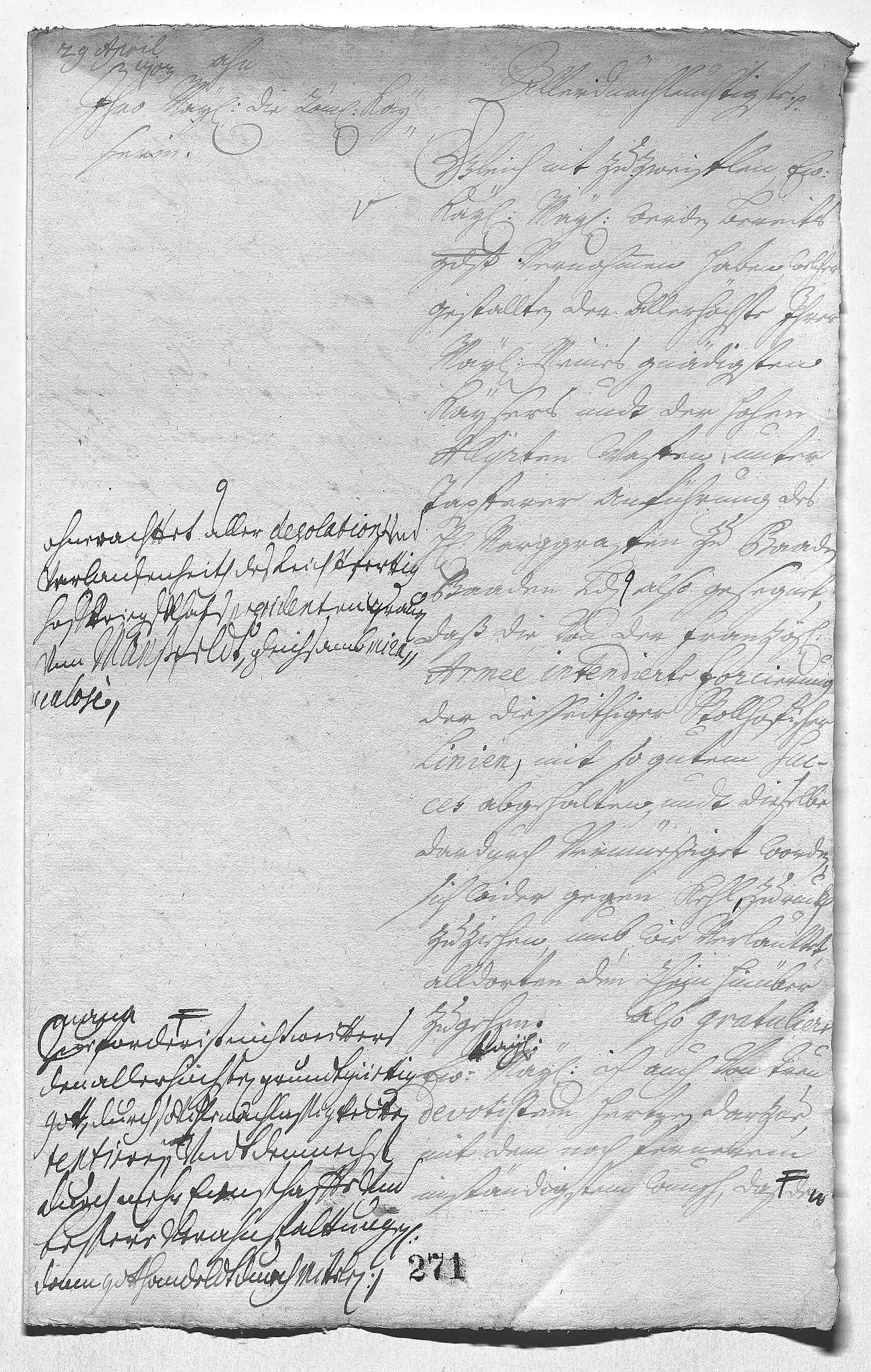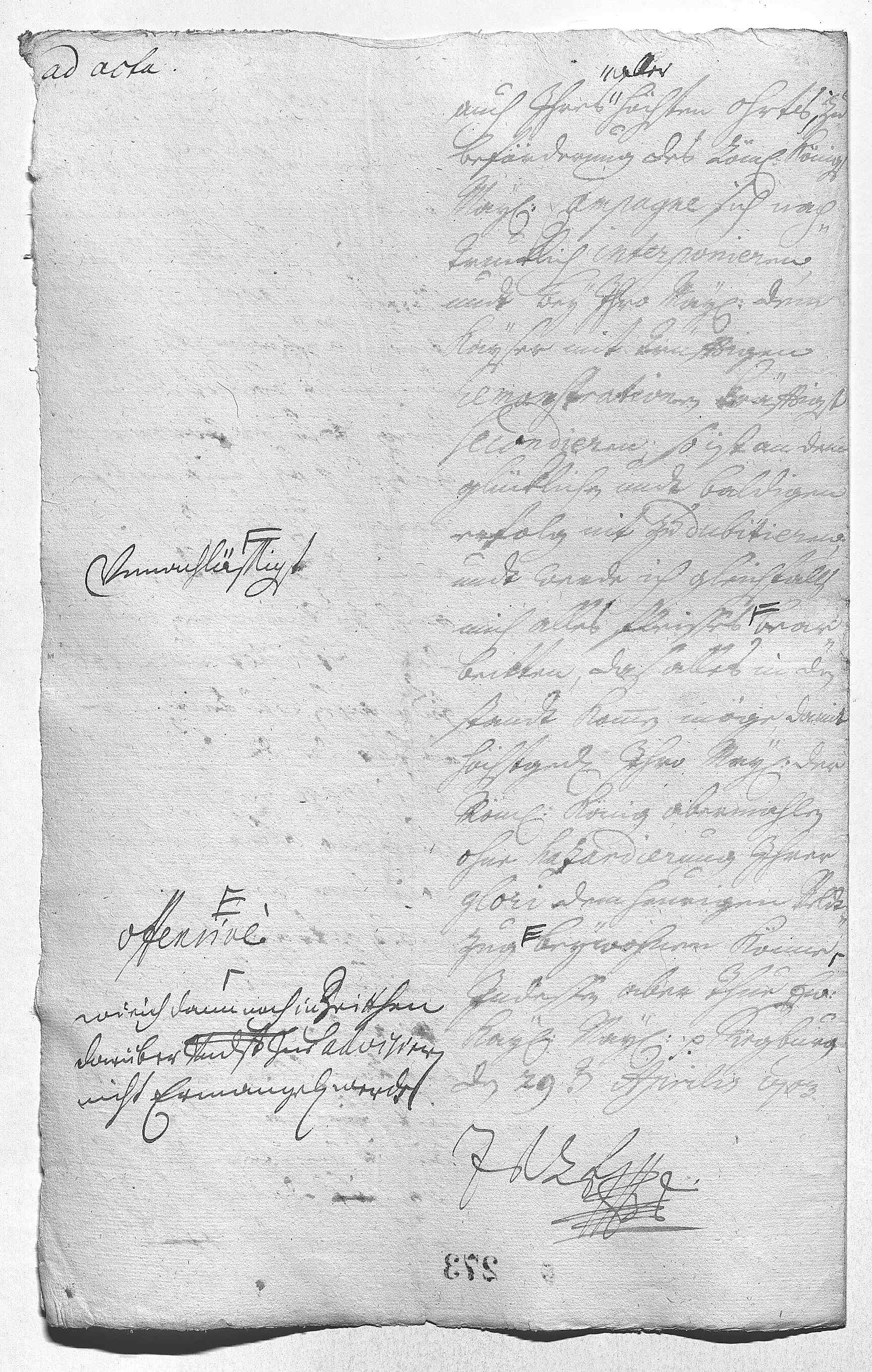 Gratuliert dazu, dass es den kaiserlichen Truppen unter dem Kommando des Markgrafen von Baden-Baden gelungen ist, die Franzosen bis nach Kehl zurückzuschlagen. Es ist aber klar, dass sie sich nur dazu hinter den Rhein zurückgezogen haben, um ihre dortigen Linien zu verstärken. Wenn das kaiserliche Kriegskommissariat die Truppen des Markgrafen nicht ausreichend mit Munition und Kriegsgerät ausrüstet, werden Landau und das ganze Land jenseits des Rheins verloren sein. – Die Gegenwart des römischen Königs (Joseph I.) wirkt sich sehr gut aus, und man merkt auch den Segen Gottes für seinen Feldzug. Bittet EMT, sich beim Kaiser dafür einzusetzen, dass der König rasch die nötige Ausstattung erhält; dann wird er sich bei der Nachwelt unsterblich machen.