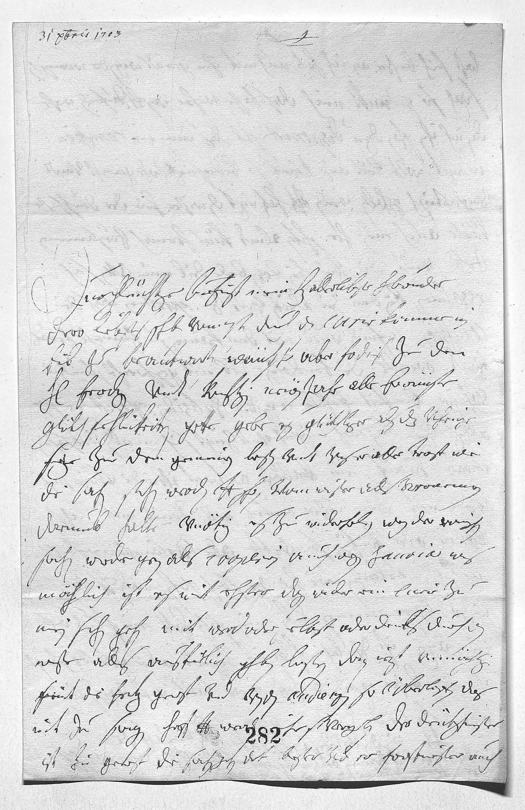 000131 decembris 17030002Durchleüchtiger Curfürst, mein herzallerlibster herr bruder 0003Schreibe dero liebsts schreiben vom 7ten, durch den curir kommen, in 0004eil zu beantworten, wüntsche aber fodrist zu dem 0005heiligen feirdagen vndt konftigen newen iahr alle erwünste 0006glükhsehlickeiten, gotte gebe, dass es glükliger als das vohrige 0007seye zu dem gemeinen besten vndt vnser aller trost. Wie 0008die sachen stehen, werden dero Liebden schon vom Wißer alls vernommen haben, 0009darumb halte vnötig es zu widerholen. Wegen der romischen 0010sachen werde gern alls cooperirn, auch wegen Sauoia was 0011möchlich ist. Es wirt ehster dagen wider ein curir zu 0012mein sohn gehn, mit dem werd oder selbst oder deils durch den 0013Wißer alles ausfürlich schreiben laßen, dan iezt vnmöchlig, 0014seint die feiertag gewest vnd war von den audienzen so überloffen, das 0015nit zu sagen, hoff, dero Liebden werden mihr vergeben. Der Deütschmeister 0016ist hie gewest, die sachen gehn dort beßer vnd er Forstmeister auch