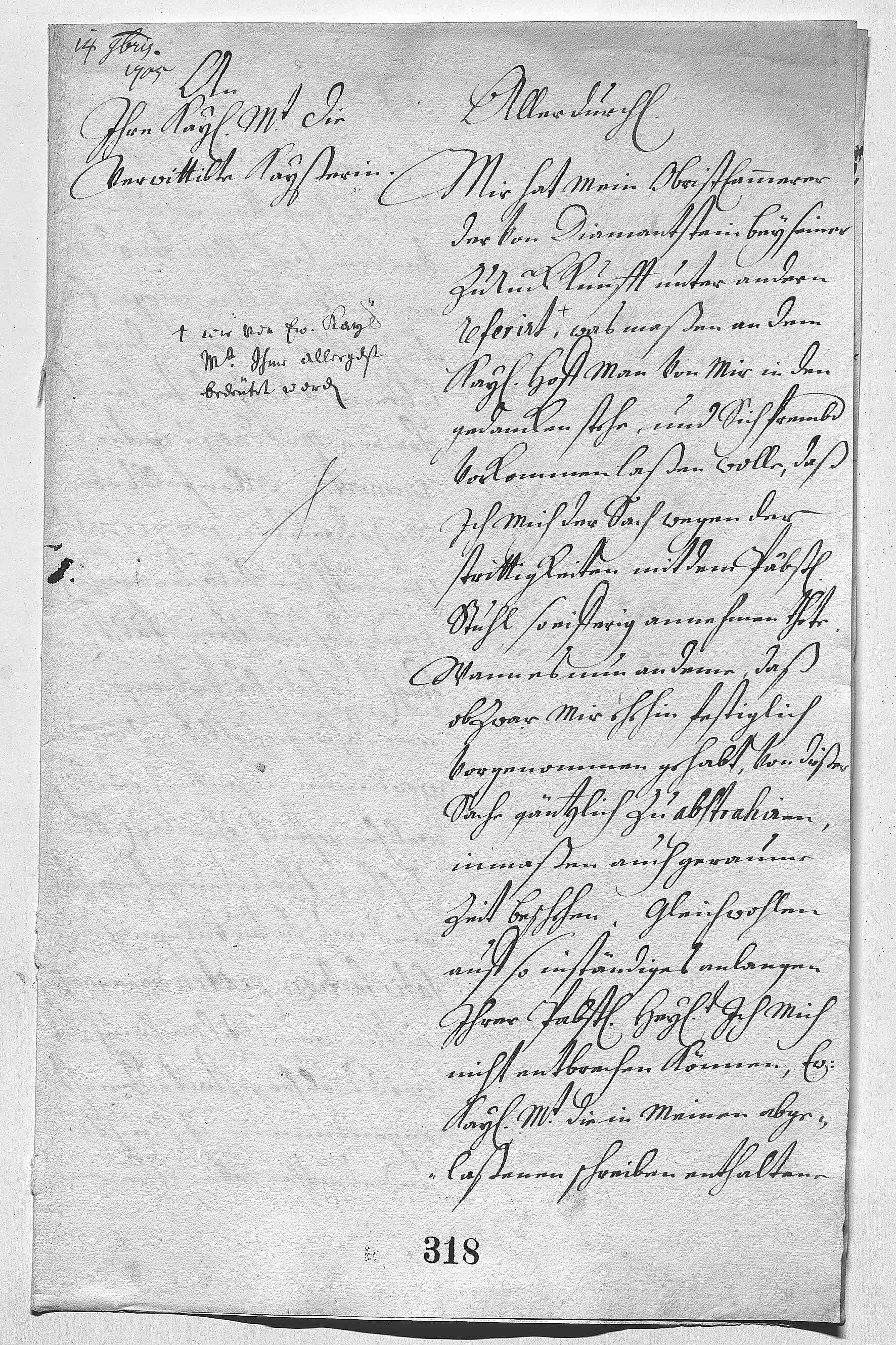 Sein Obristkämmerer von Diemantstein hat JW bei seiner Rückkehr berichtet, dass EMT ihm bedeutet hat, man wundere sich am Kaiserhof darüber, dass JW sich so eifrig um die Beilegung der Streitigkeiten mit dem Papst bemüht. Hatte EMT um Geheimhaltung gebeten und in ihrem letzten Schreiben hat sie ihn noch in dieser Sache animiert. Wollte keineswegs den päpstlichen Hof entschuldigen und ist sehr betrübt, dass übelgesinnte Personen einen schlechten Eindruck von ihm beim Kaiser (Joseph I.) erwecken. Bittet um Hinweise, wie er sich künftig verhalten soll.